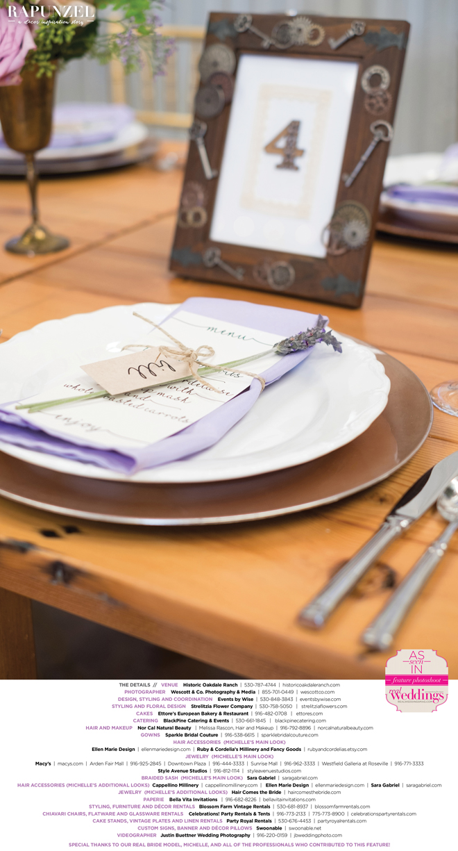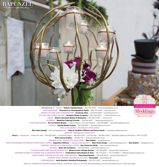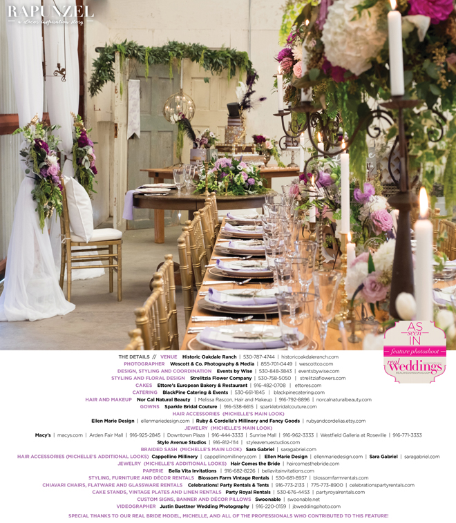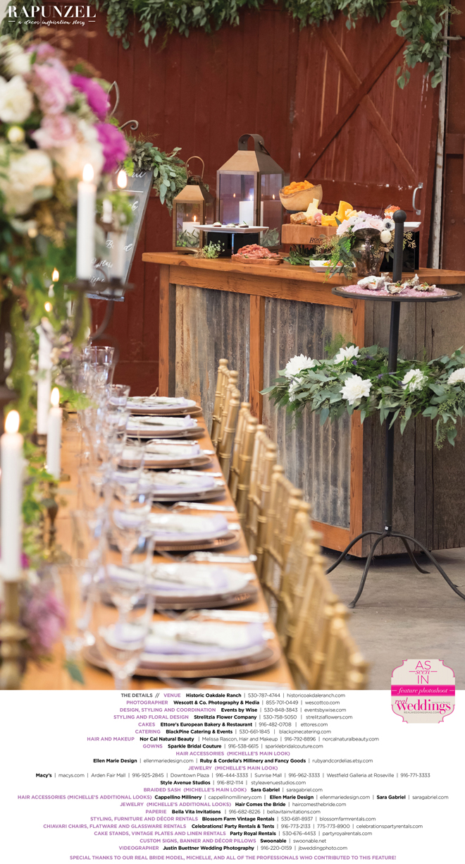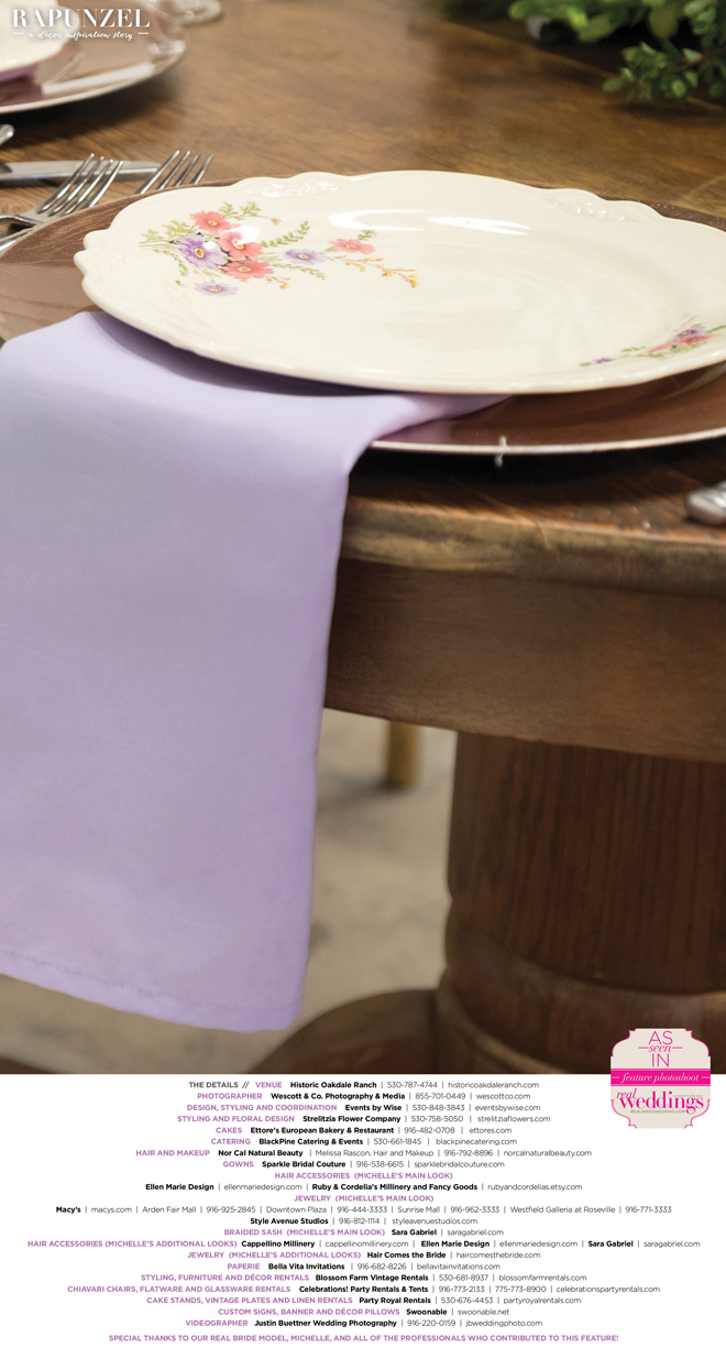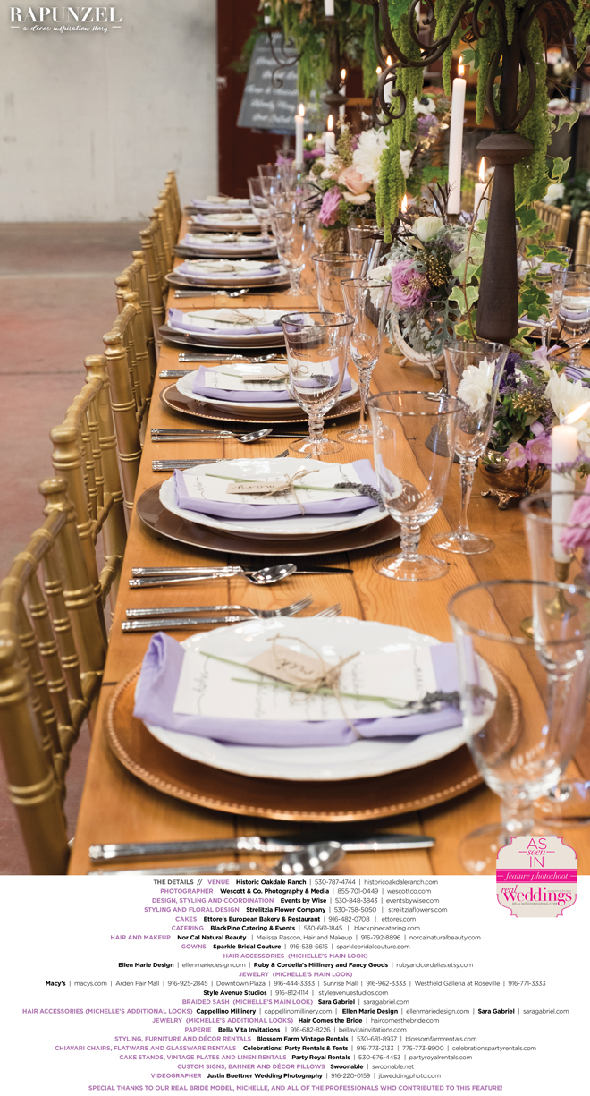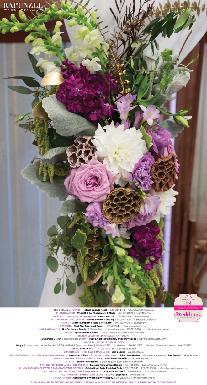 “Rapunzel” was produced by Shari Wise—Events by Wise, Kelly Peart—Blossom Farm Vintage Rentals, Letitia Martin—Strelitzia Flower Company, Susie Baggett and Wendy Sipple—Real Weddings Magazine.