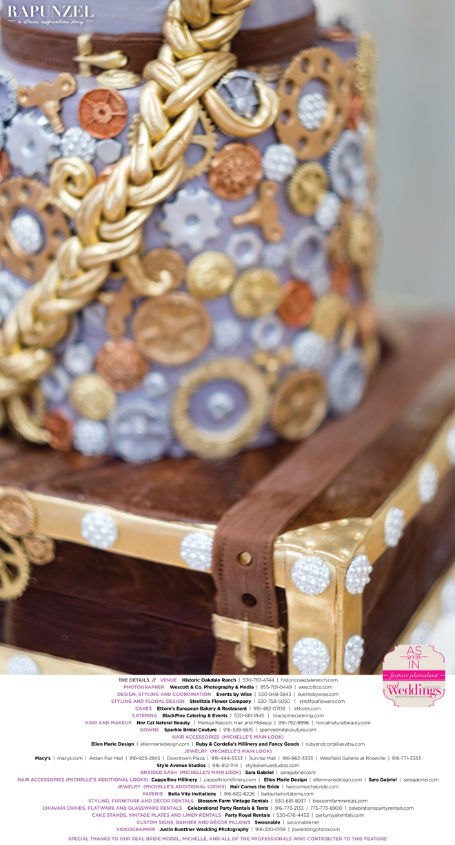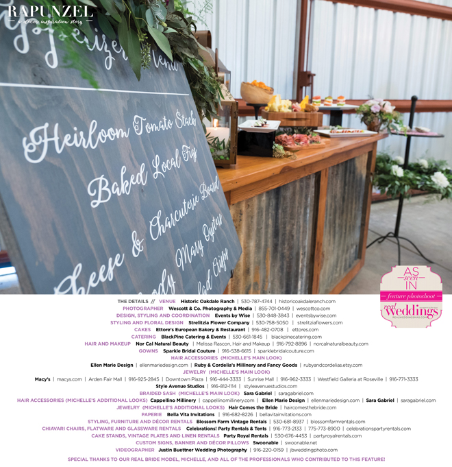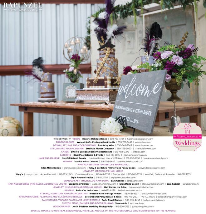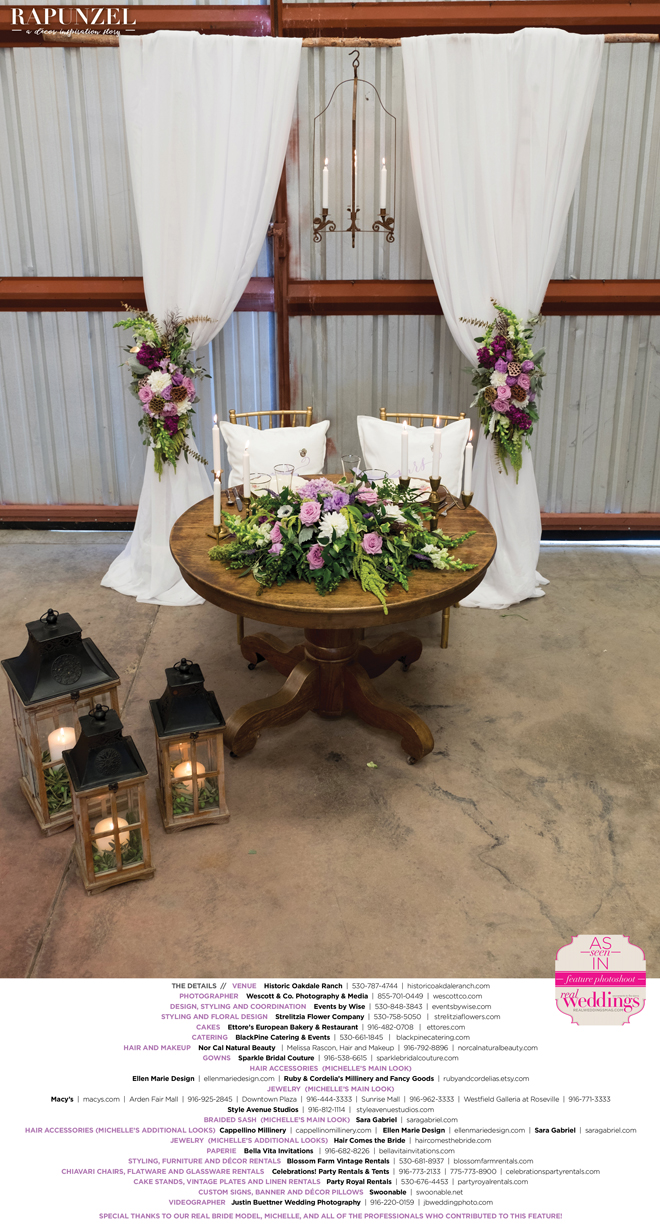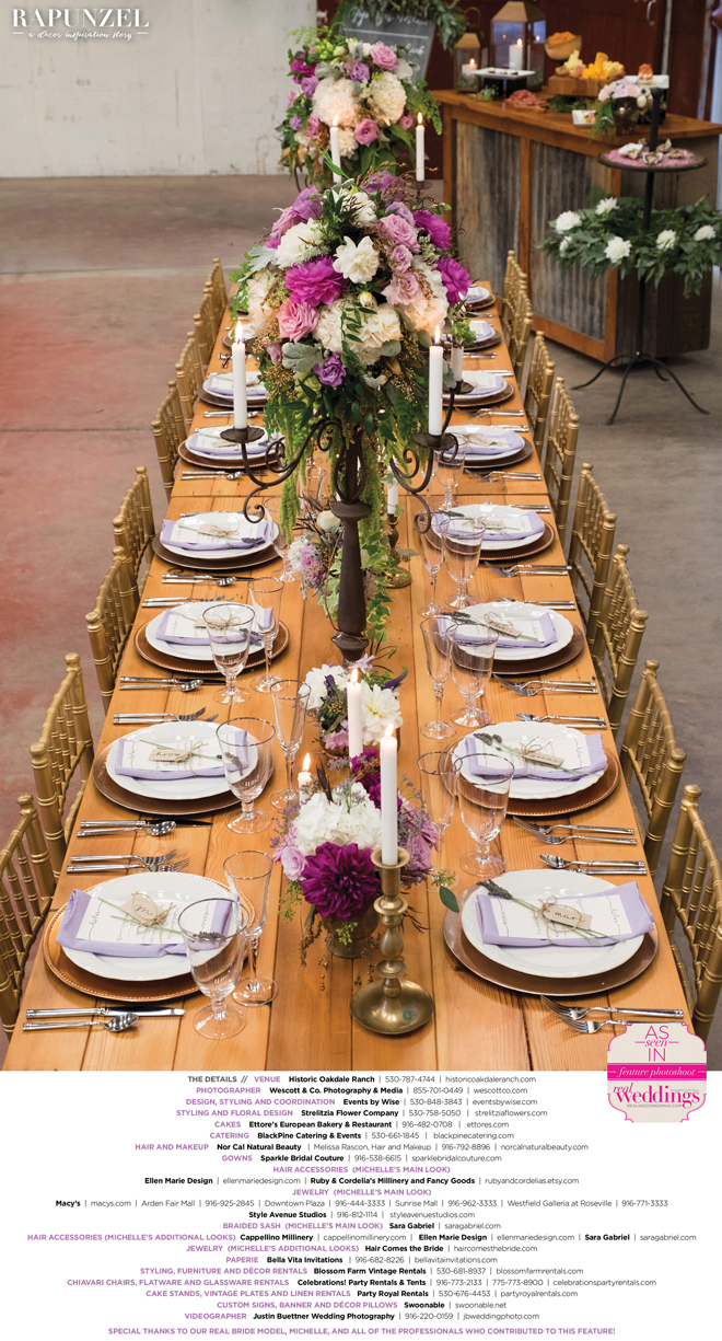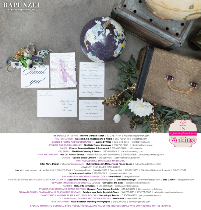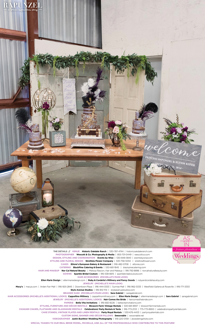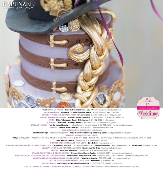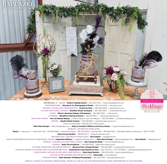 “Rapunzel” was produced by Shari Wise—Events by Wise, Kelly Peart—Blossom Farm Vintage Rentals, Letitia Martin—Strelitzia Flower Company, Susie Baggett and Wendy Sipple—Real Weddings Magazine.