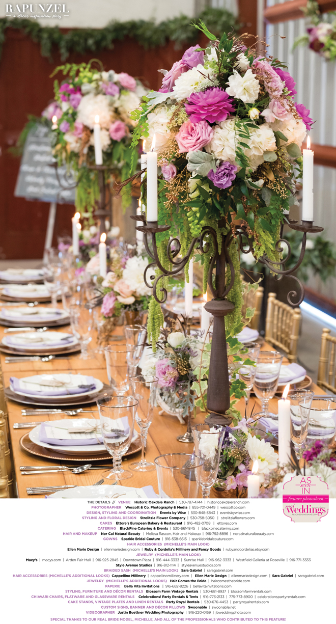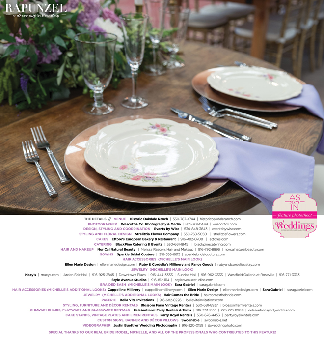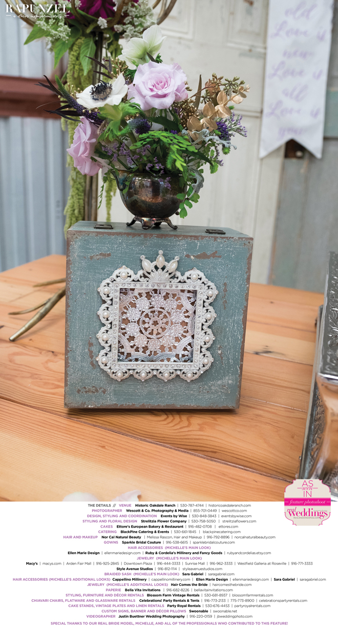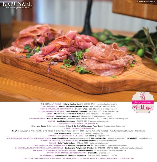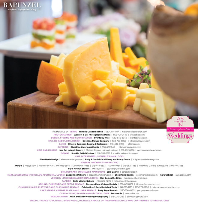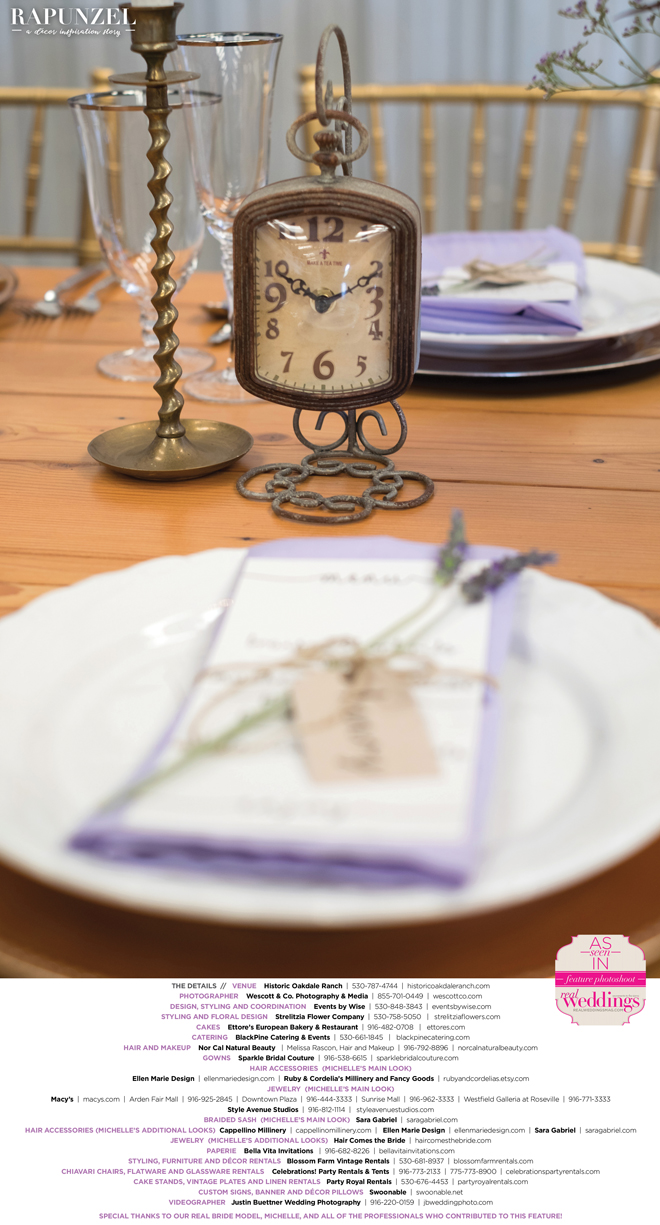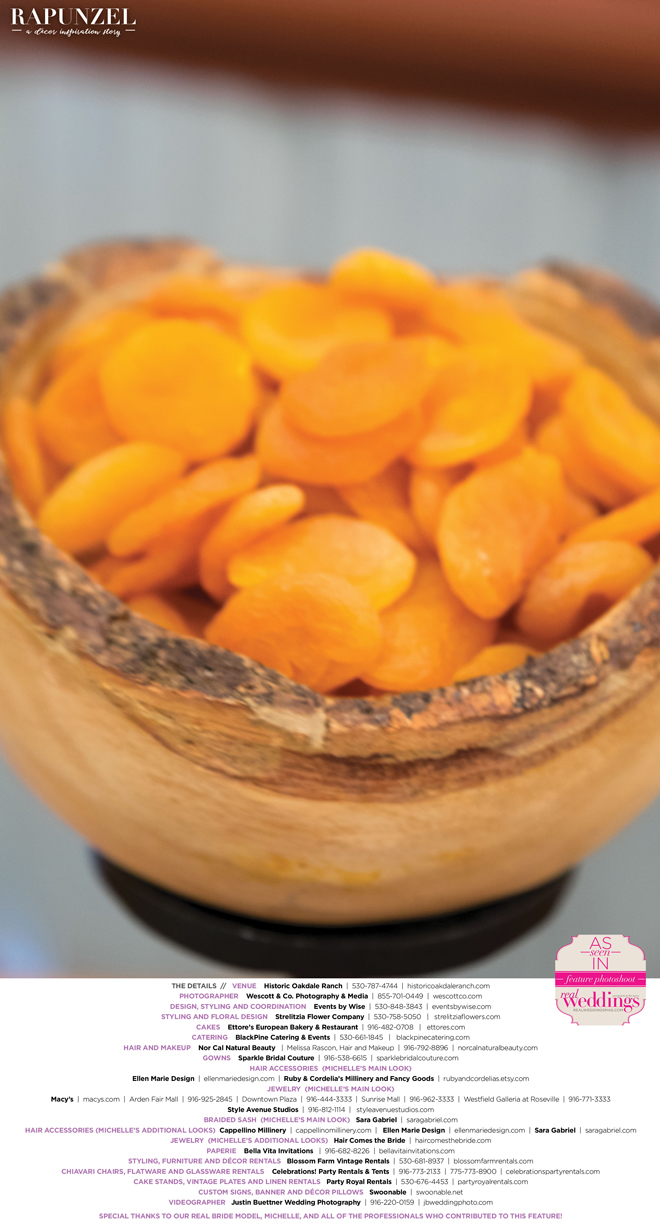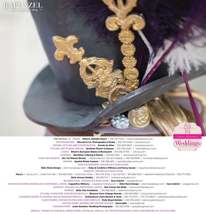 “Rapunzel” was produced by Shari Wise—Events by Wise, Kelly Peart—Blossom Farm Vintage Rentals, Letitia Martin—Strelitzia Flower Company, Susie Baggett and Wendy Sipple—Real Weddings Magazine.