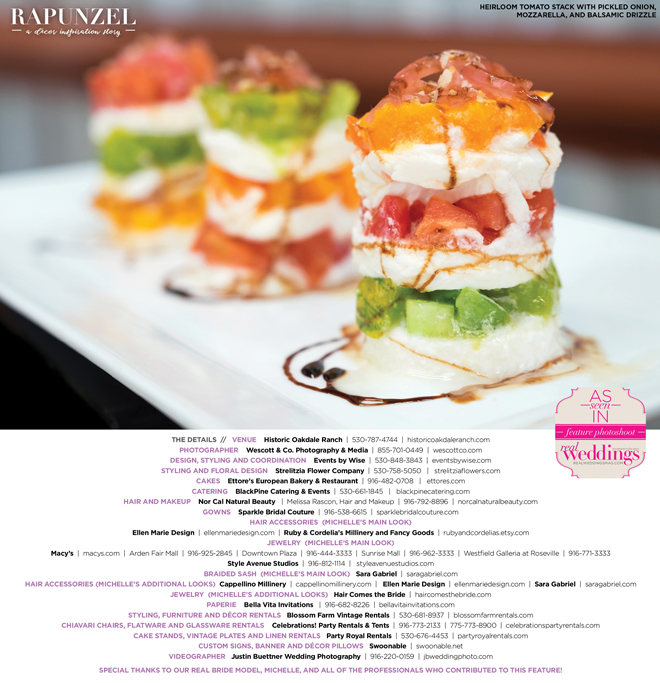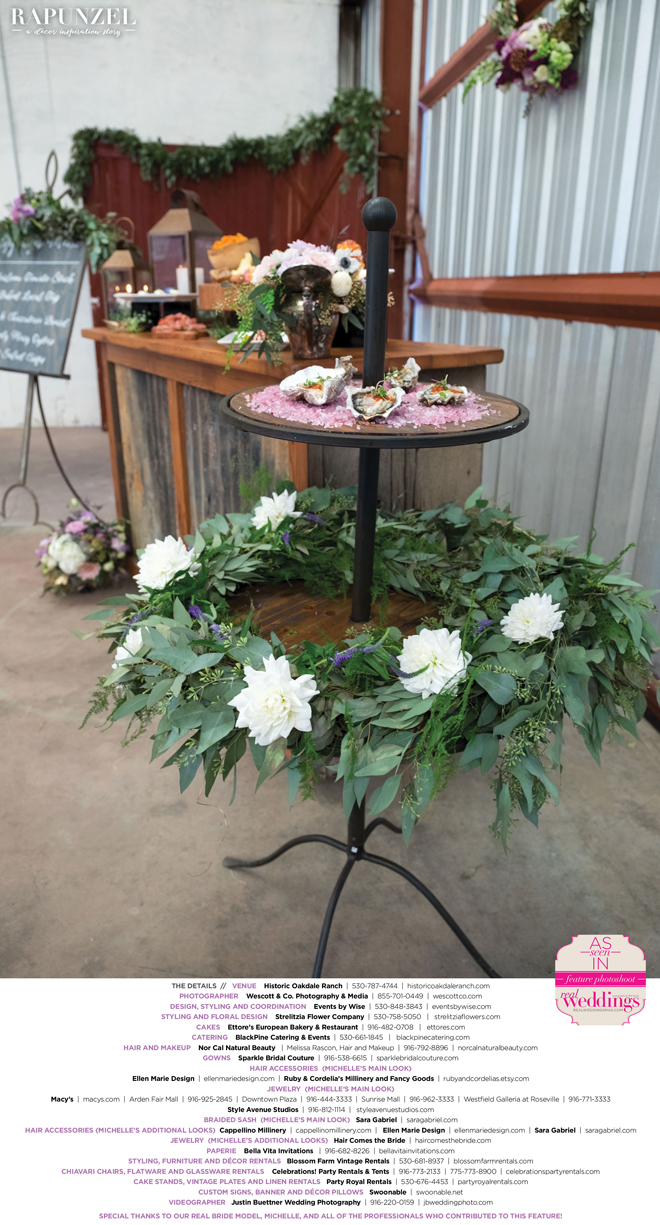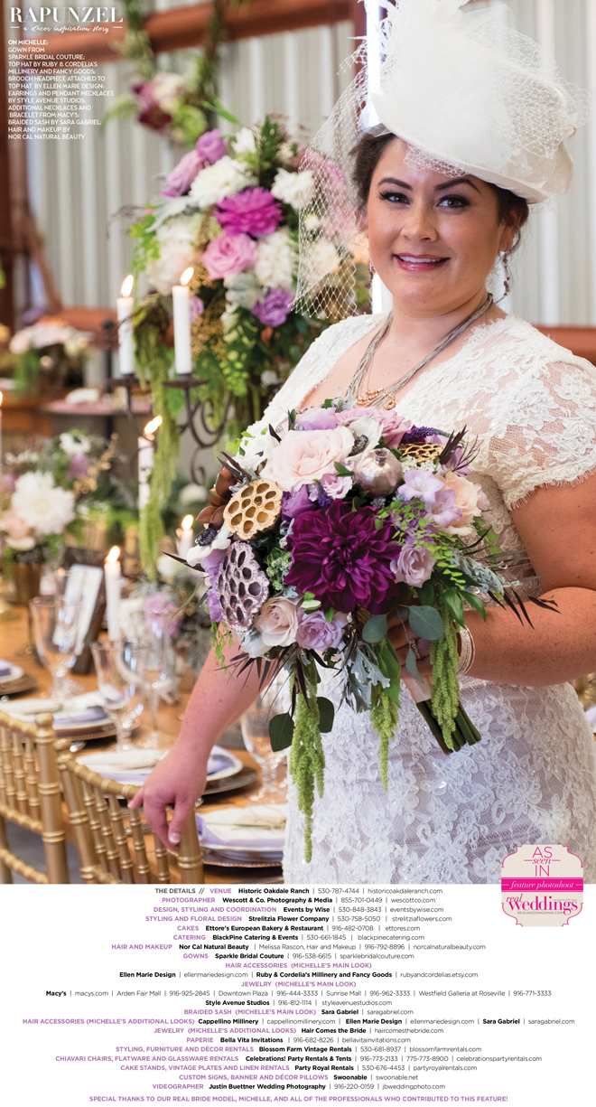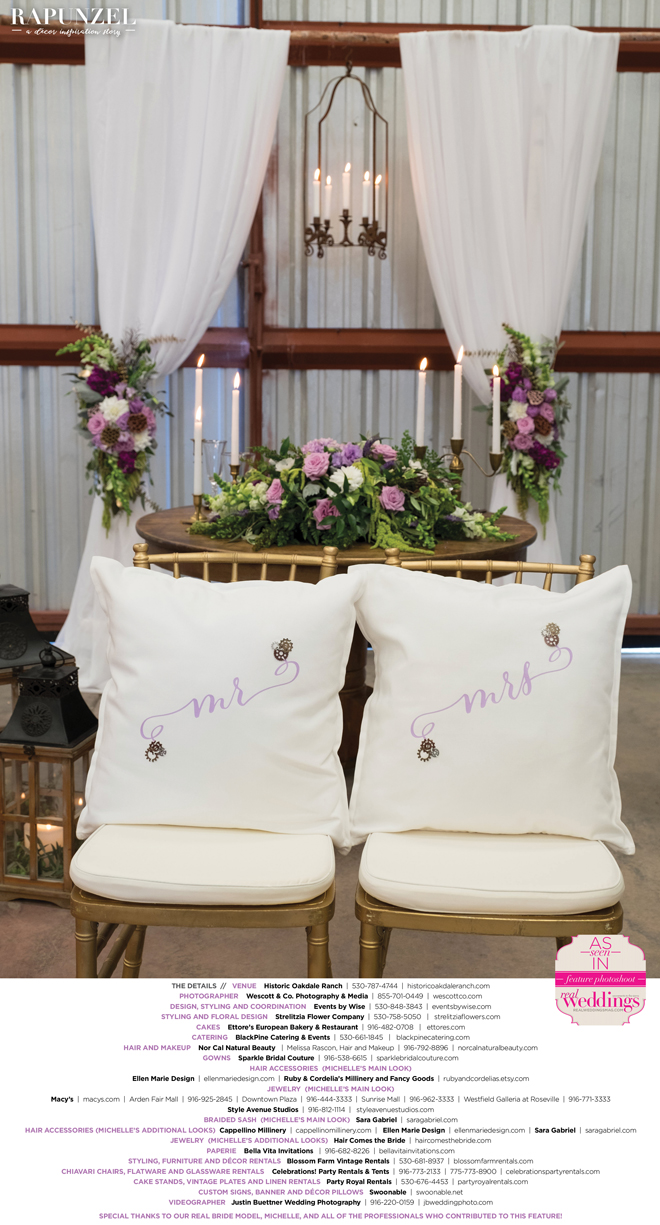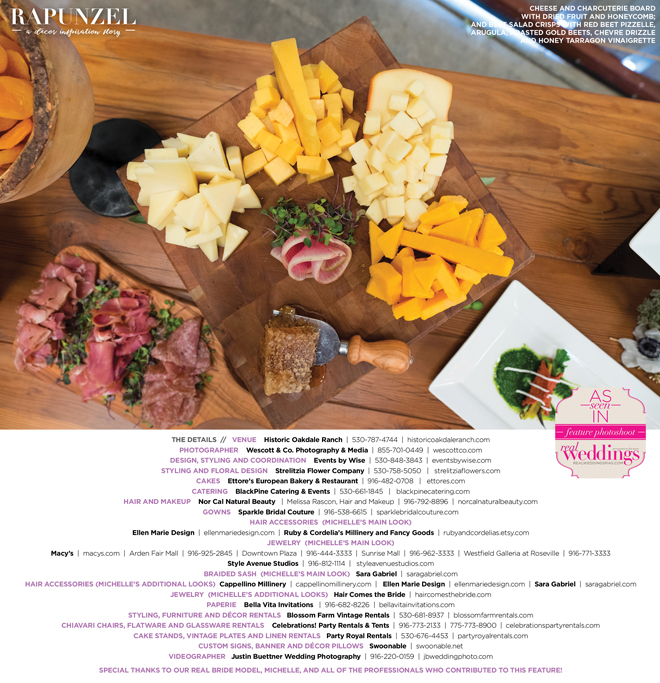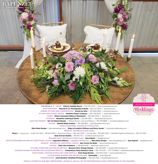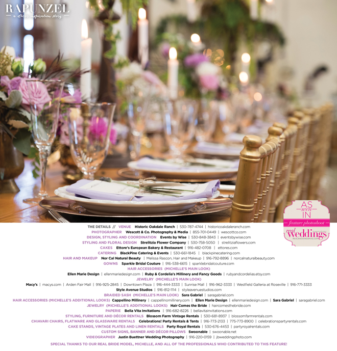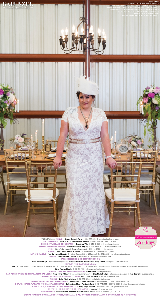 “Rapunzel” was produced by Shari Wise—Events by Wise, Kelly Peart—Blossom Farm Vintage Rentals, Letitia Martin—Strelitzia Flower Company, Susie Baggett and Wendy Sipple—Real Weddings Magazine.