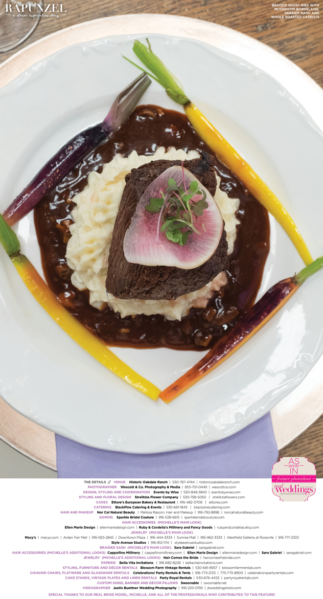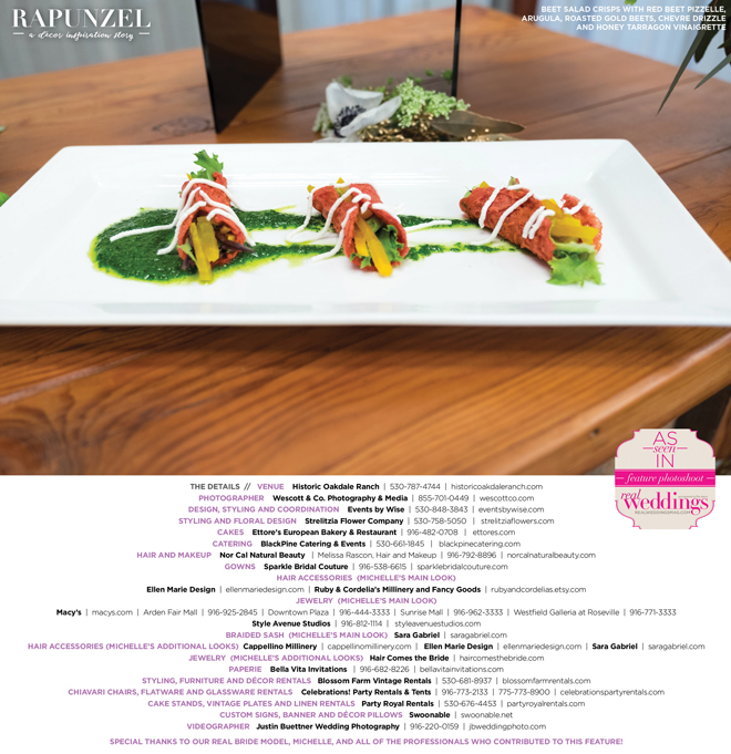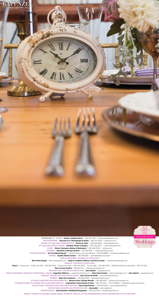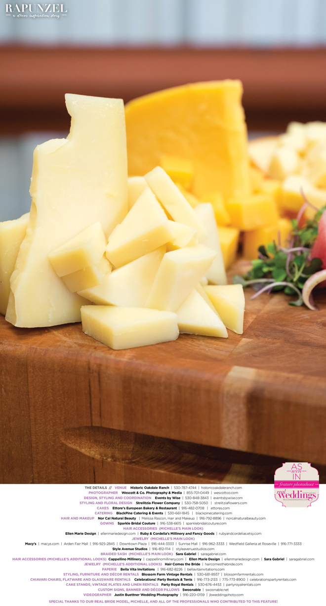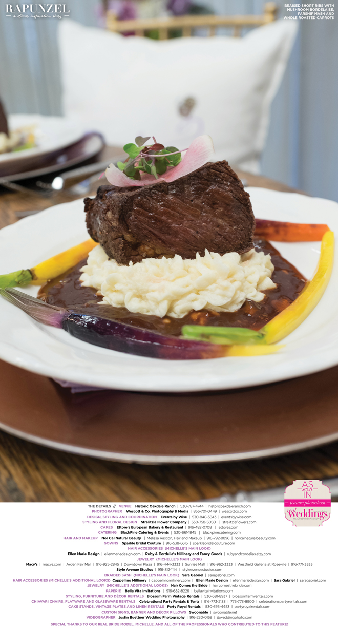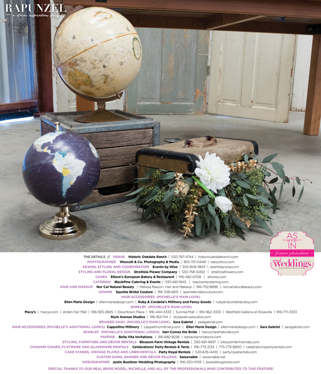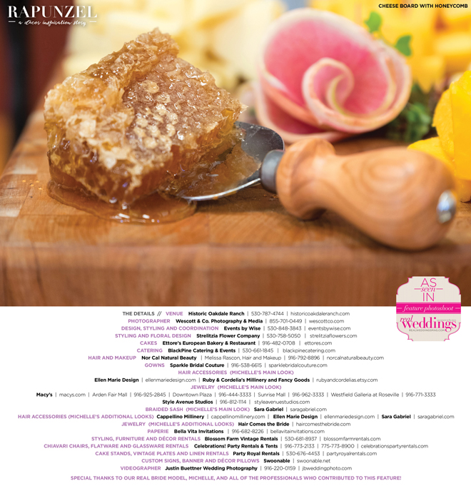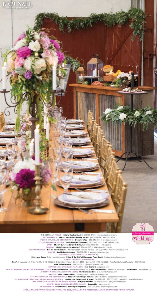 “Rapunzel” was produced by Shari Wise—Events by Wise, Kelly Peart—Blossom Farm Vintage Rentals, Letitia Martin—Strelitzia Flower Company, Susie Baggett and Wendy Sipple—Real Weddings Magazine.