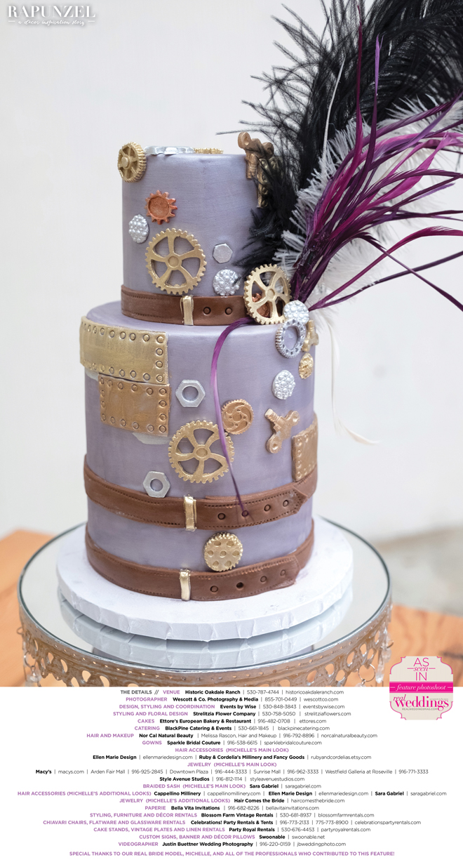 And at first glance, you might say, how is this Rapunzel? If you look closely, you’ll see several braided elements, but we wanted to take the story beyond the traditional “Rapunzel” and add some fun steampunk influences to truly make this fairy tale our own. As our designer Shari Wise from Events by Wise says about the inspiration for this shoot: