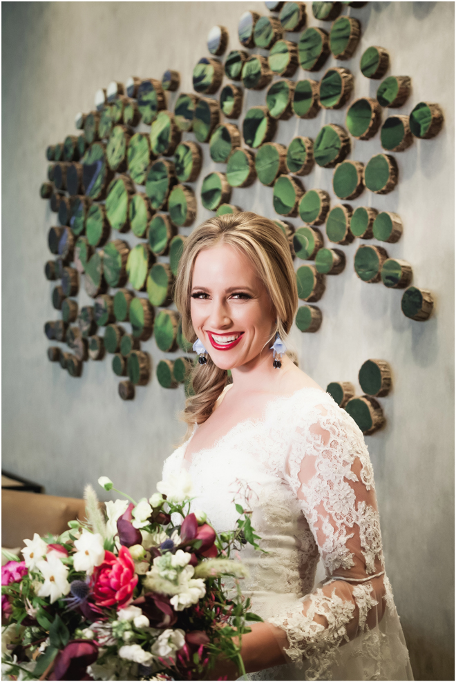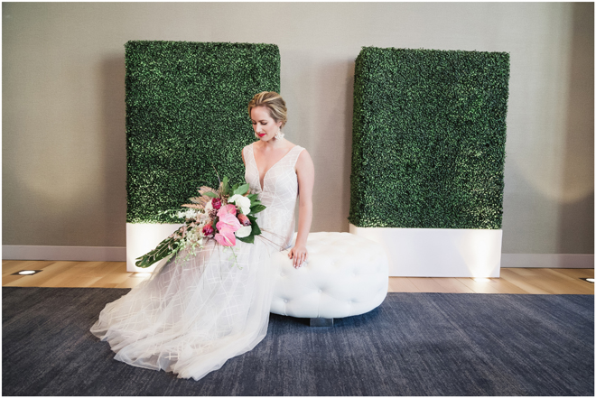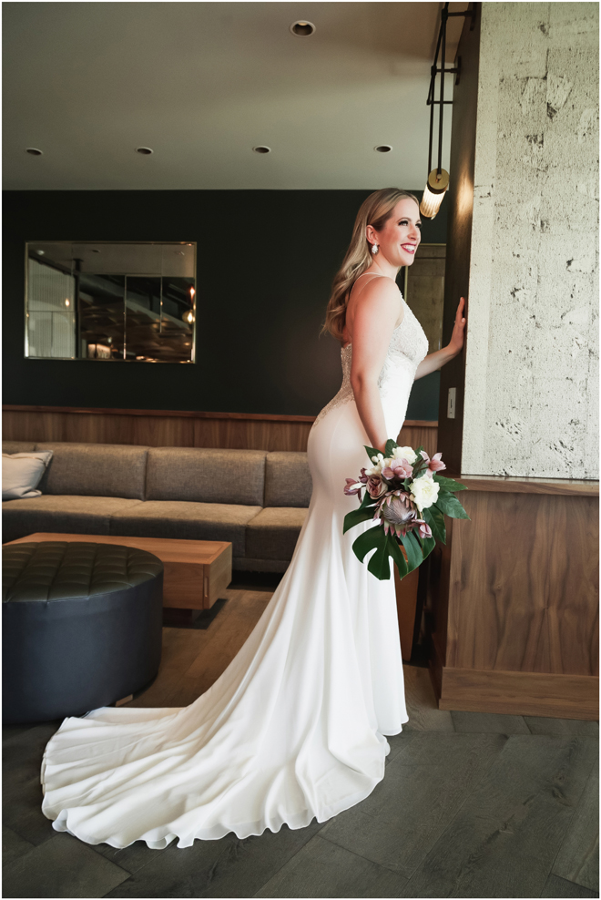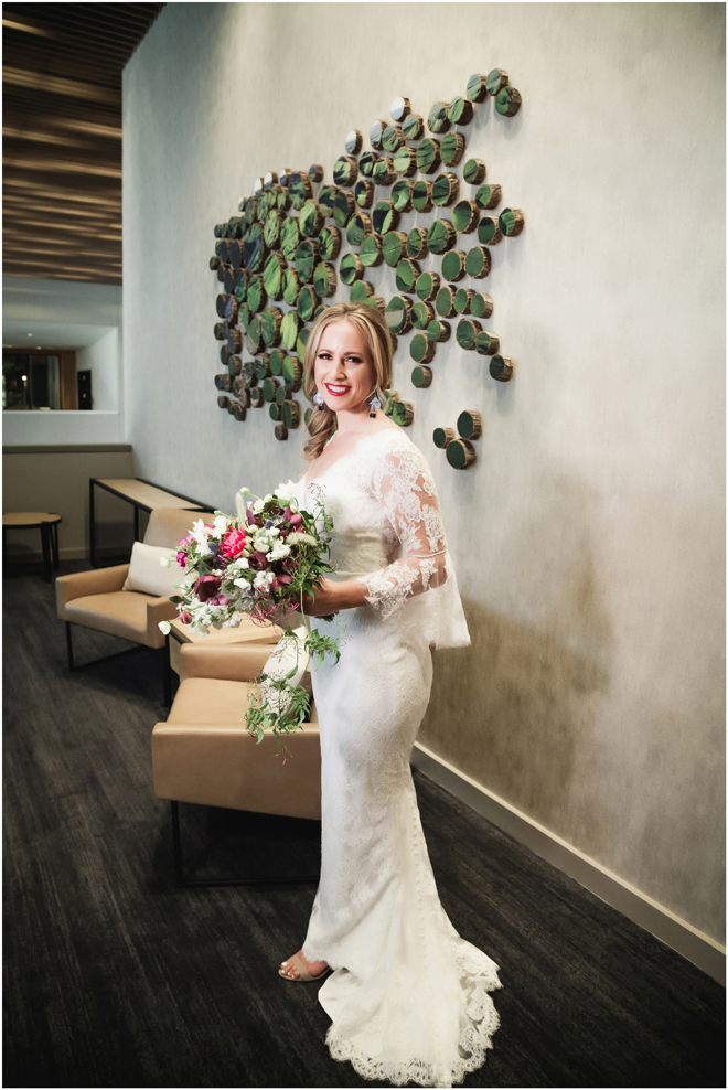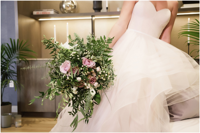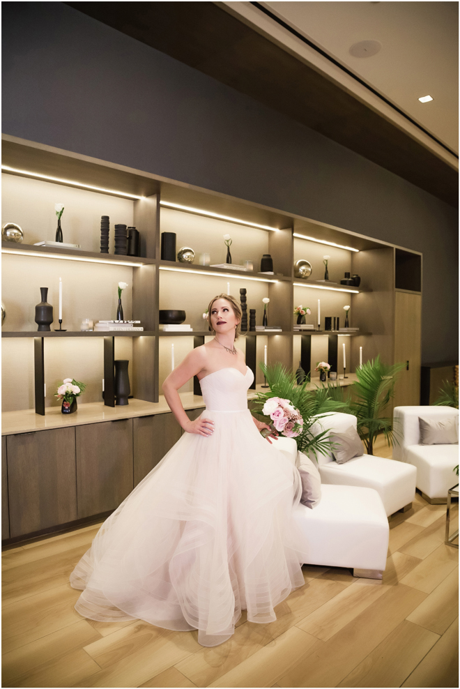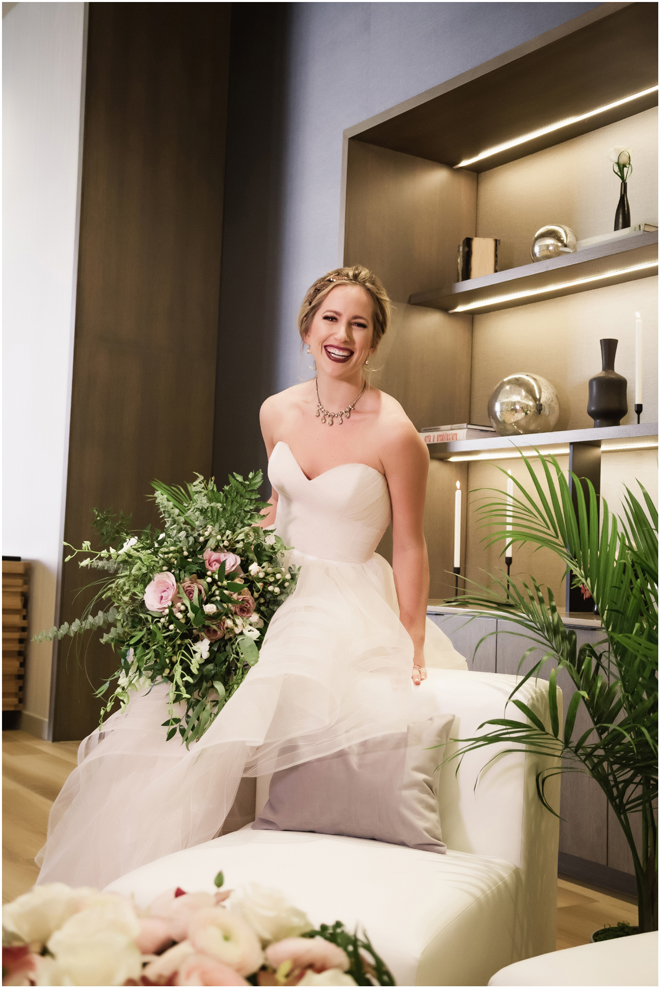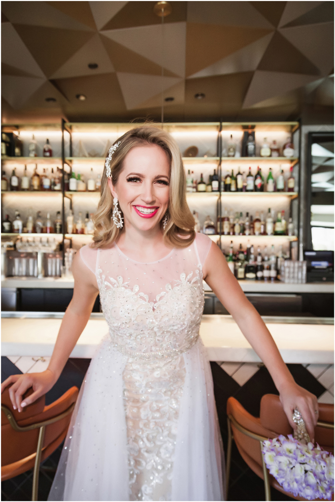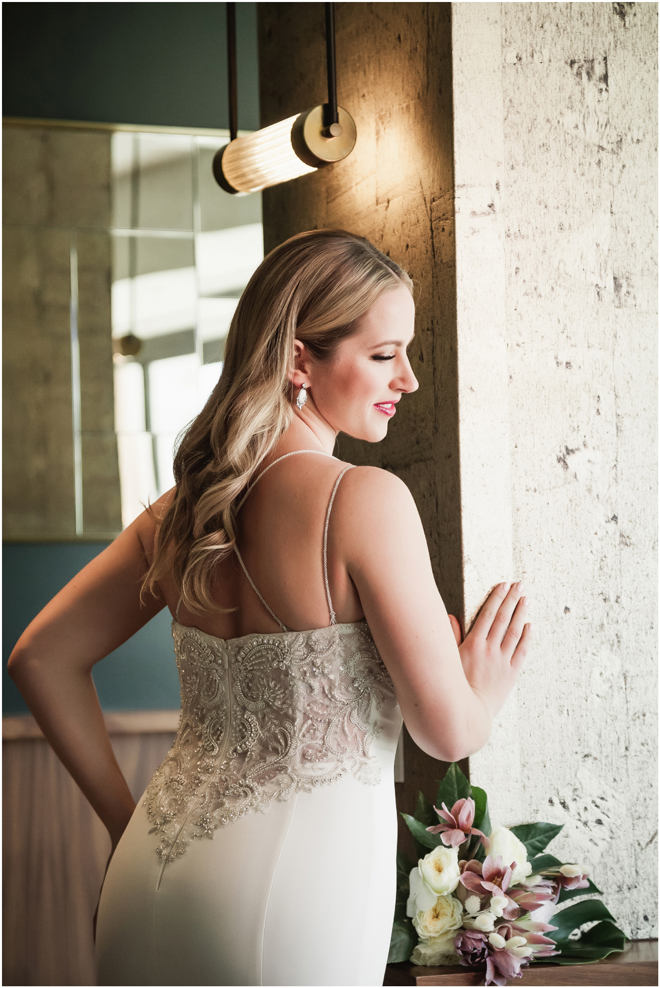 Gown by Solo Merav from Diamond Bridal Gallery; Jewelry by Sorrelli Jewelry; Bouquet by Wild Flowers Design Group; Hair and makeup by All Dolled Up Hair and Makeup Artistry; Photo by 2 Girls 20 Cameras, on location at Kimpton Sawyer Hotel