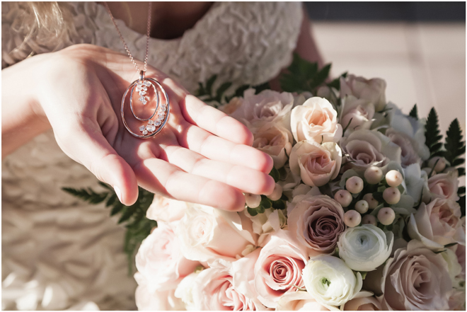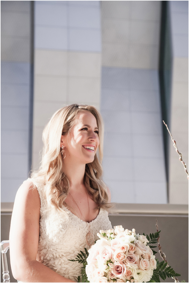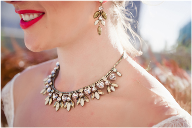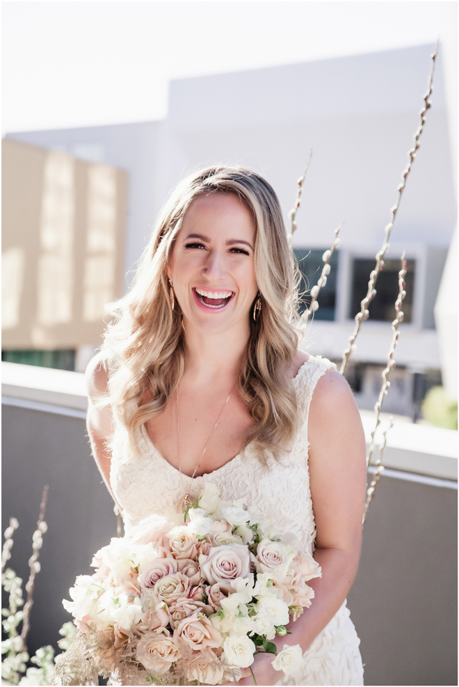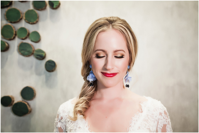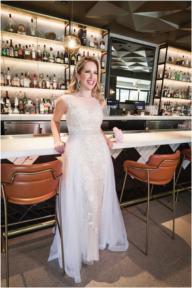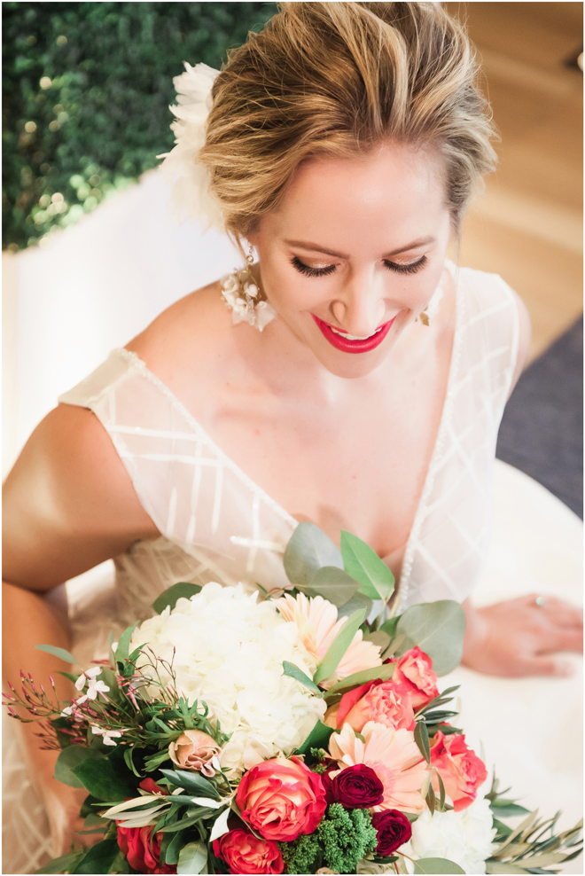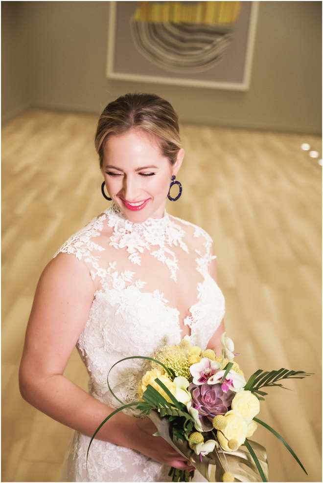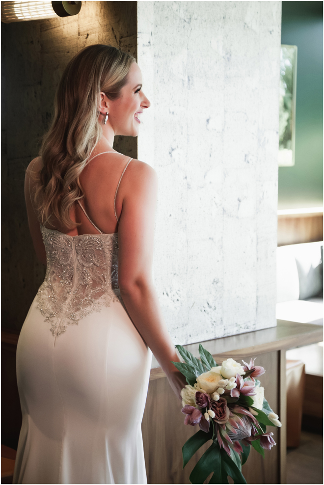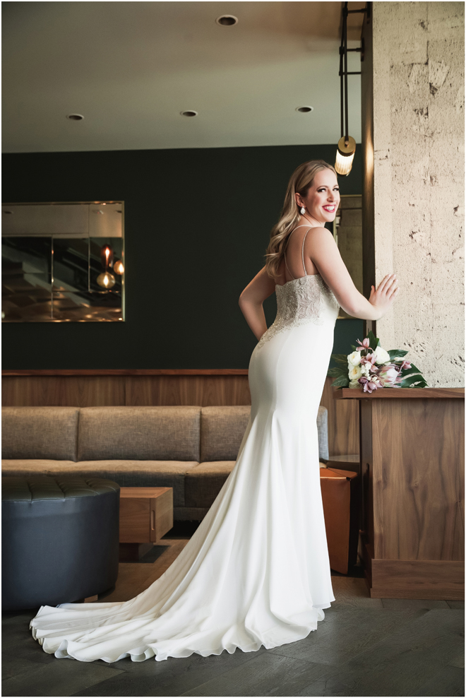 Gown by Solo Merav from Diamond Bridal Gallery; Jewelry by Sorrelli Jewelry; Bouquet by Wild Flowers Design Group; Hair and makeup by All Dolled Up Hair and Makeup Artistry; Photo by 2 Girls 20 Cameras, on location at Kimpton Sawyer Hotel