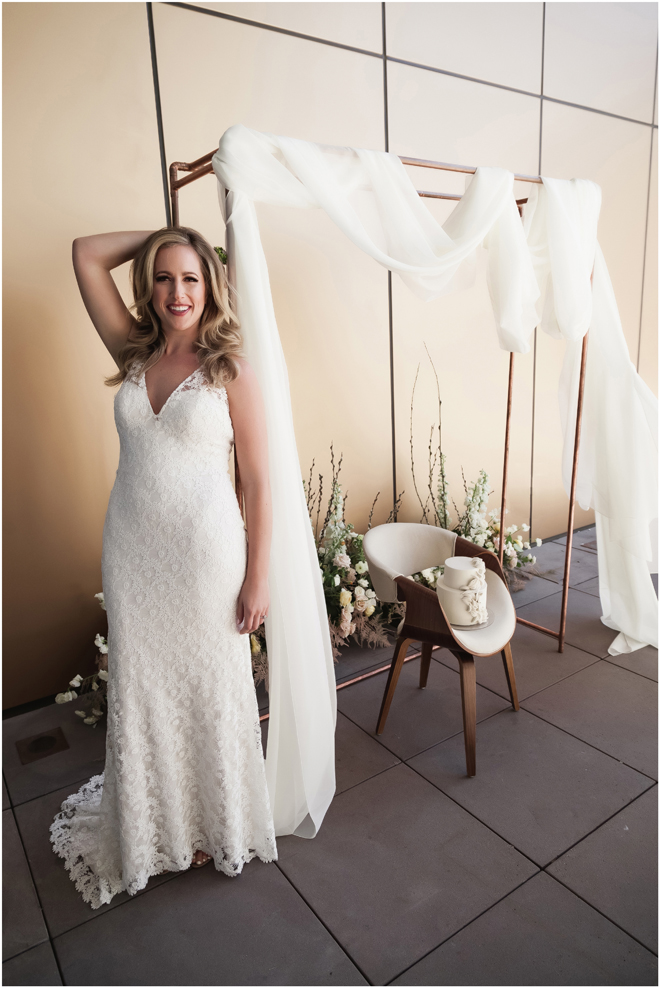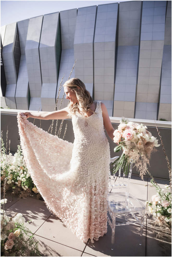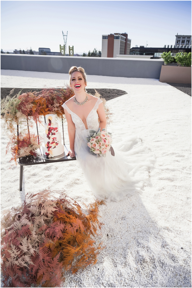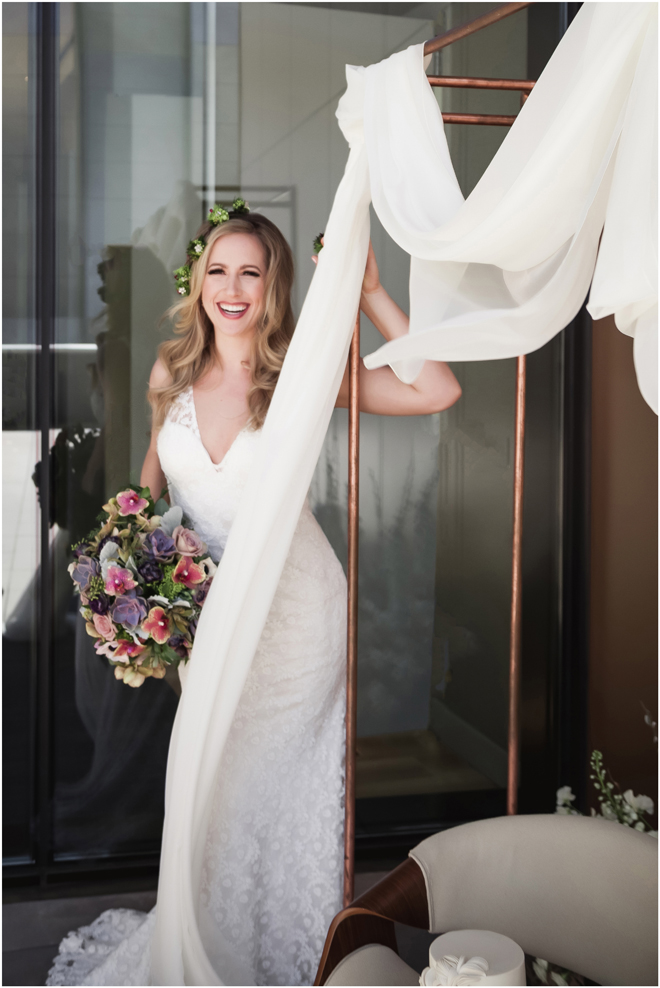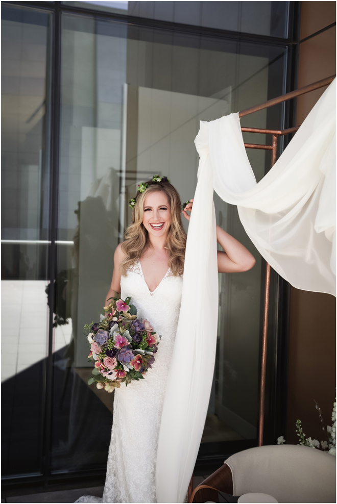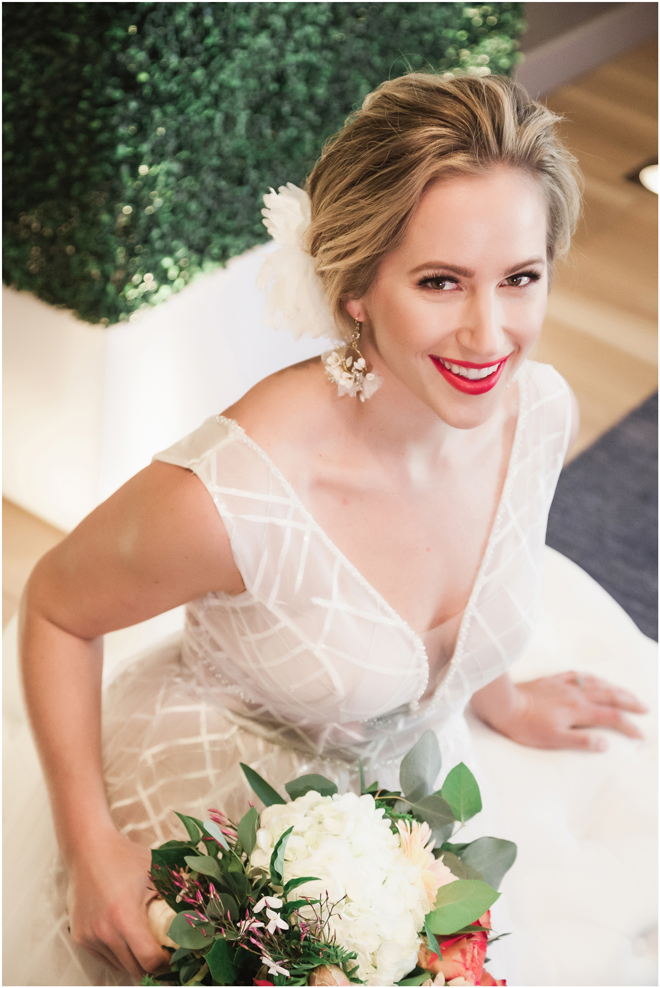 Gown from My Martha Design Boutique; Headpiece and earrings by Twigs & Honey; Bouquet by Carson Valley Florist; Hair and makeup by All Dolled Up Hair and Makeup Artistry; Photo by 2 Girls 20 Cameras, on location at Kimpton Sawyer Hotel