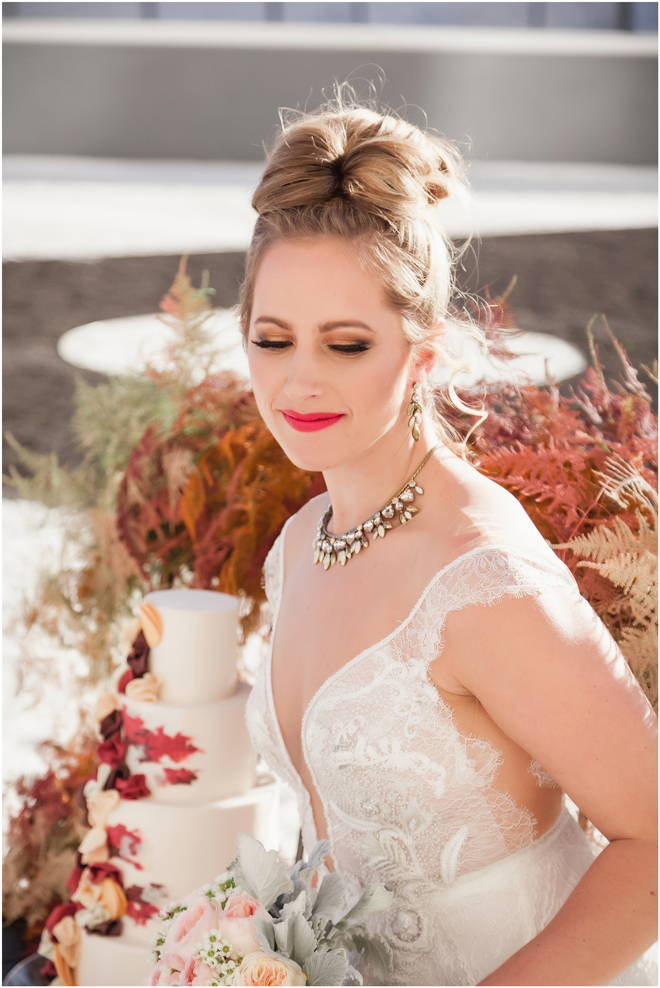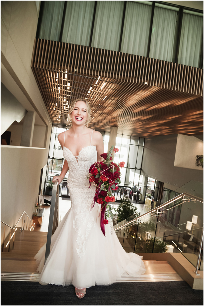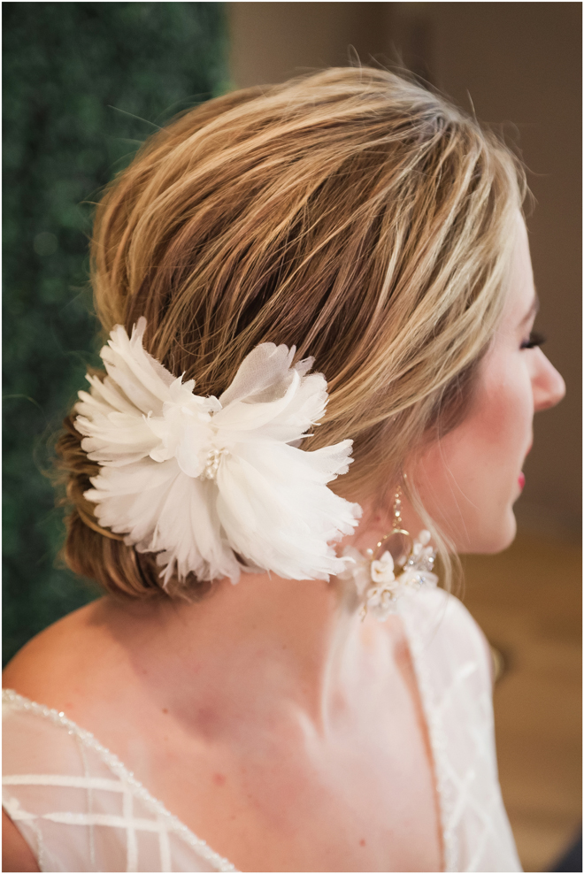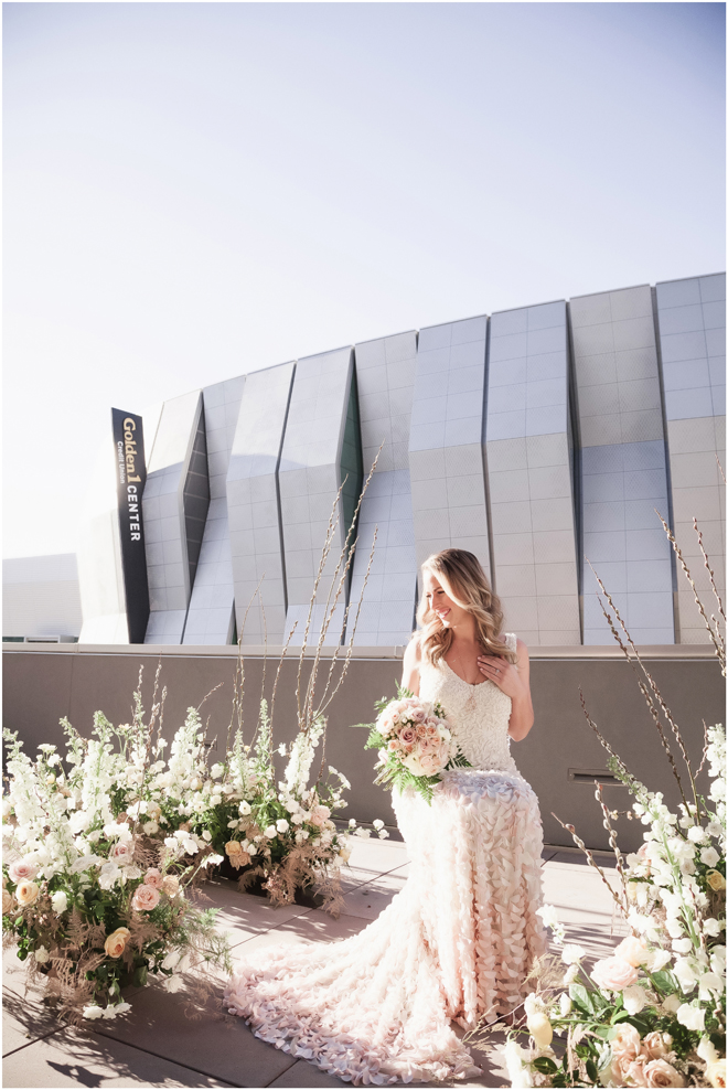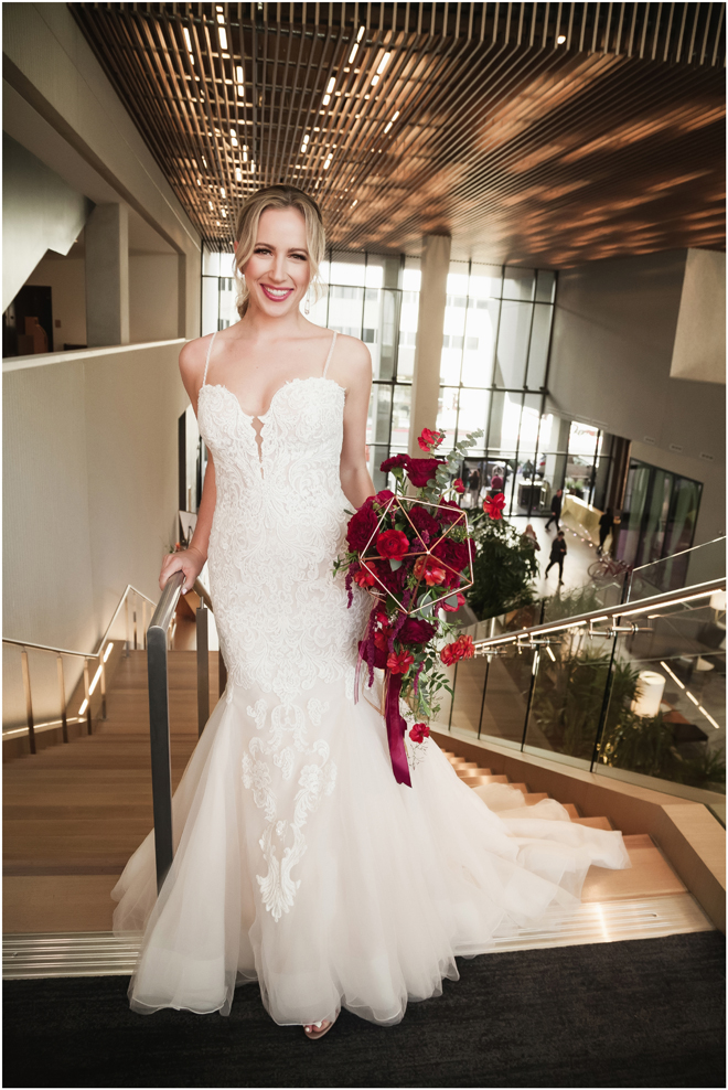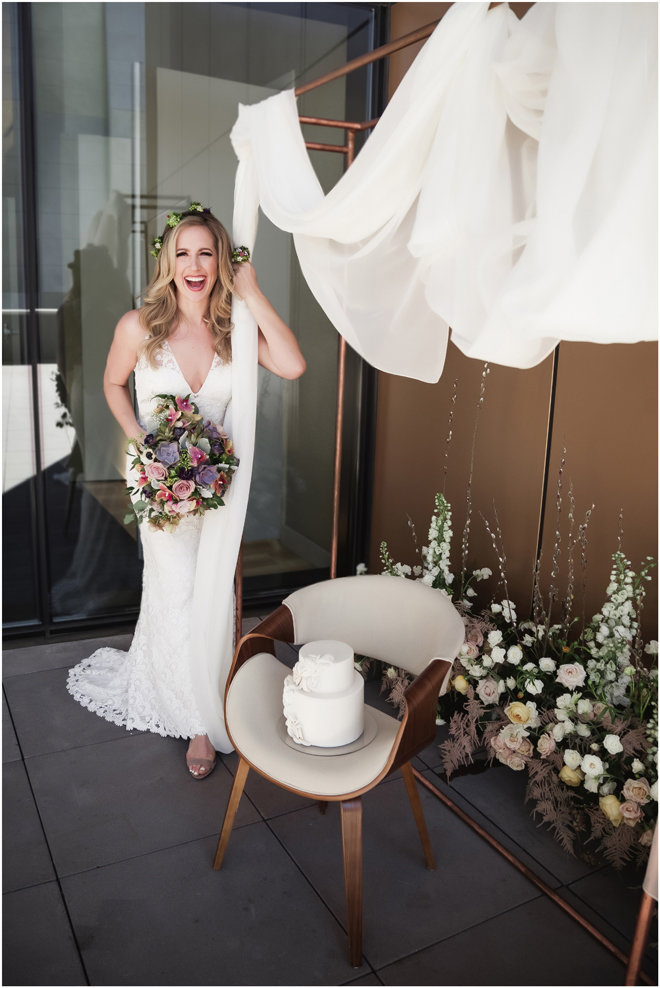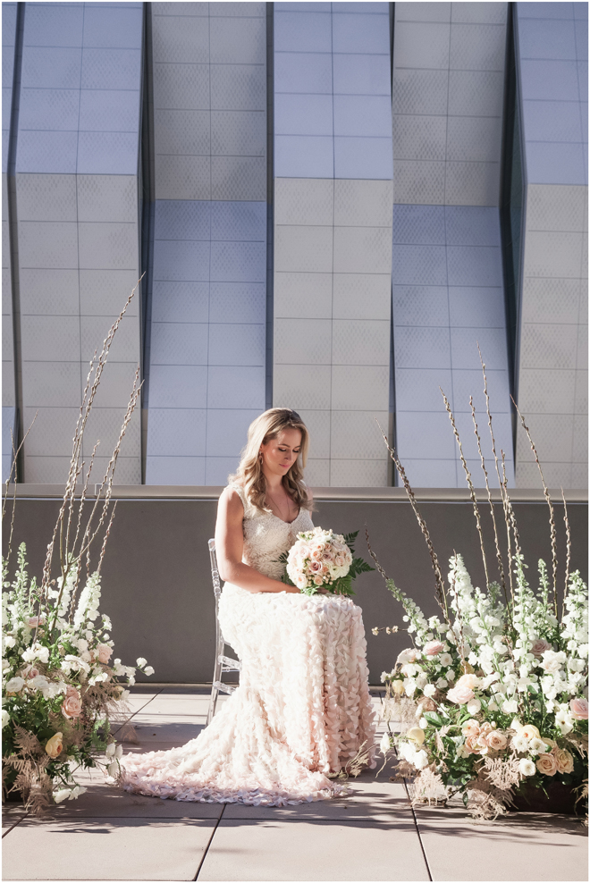 Gown from My Martha Design Boutique; Headpiece and earrings by Twigs & Honey; Bouquet by Carson Valley Florist; Hair and makeup by All Dolled Up Hair and Makeup Artistry; Photo by 2 Girls 20 Cameras, on location at Kimpton Sawyer Hotel