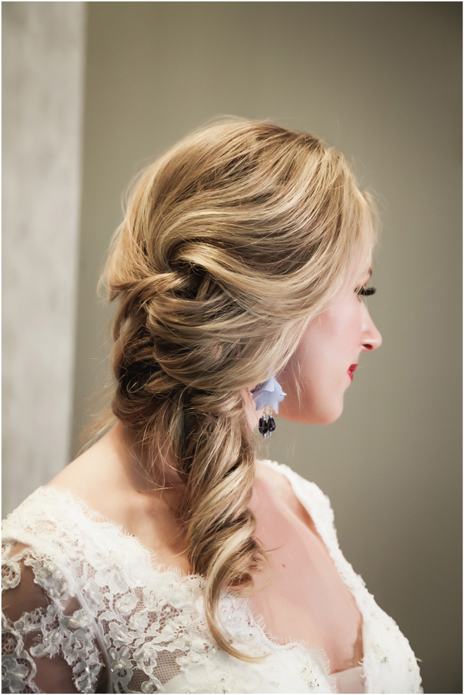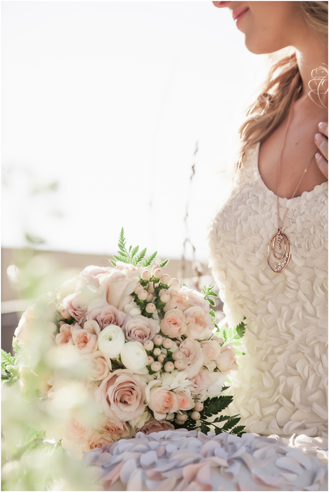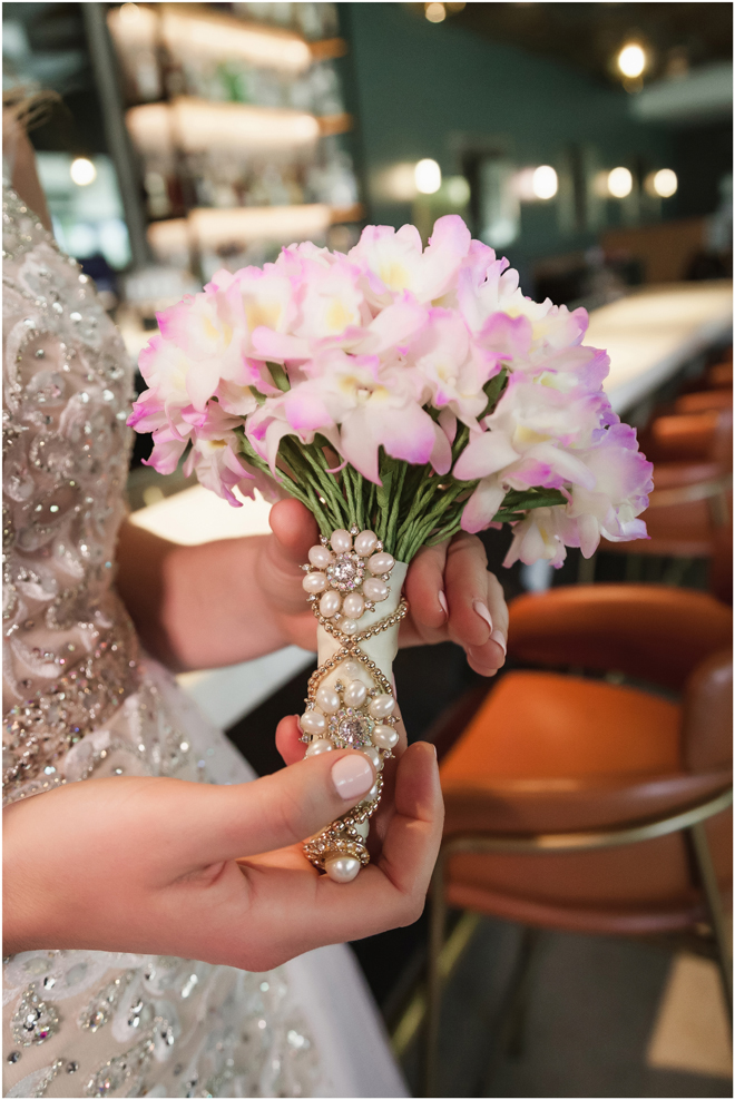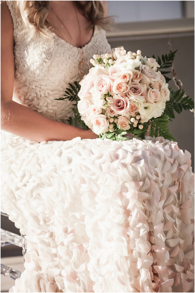 Gown from De la Rosa’s Bridal & Tuxedo; Earrings from Macy’s; Bouquet by Bloem Decor; Hair and makeup by All Dolled Up Hair and Makeup Artistry; Photo by 2 Girls 20 Cameras, on location at Kimpton Sawyer Hotel