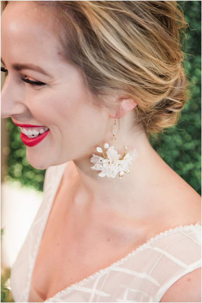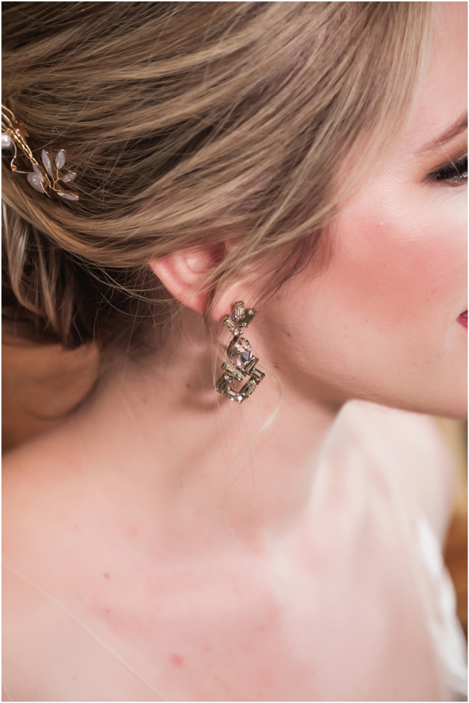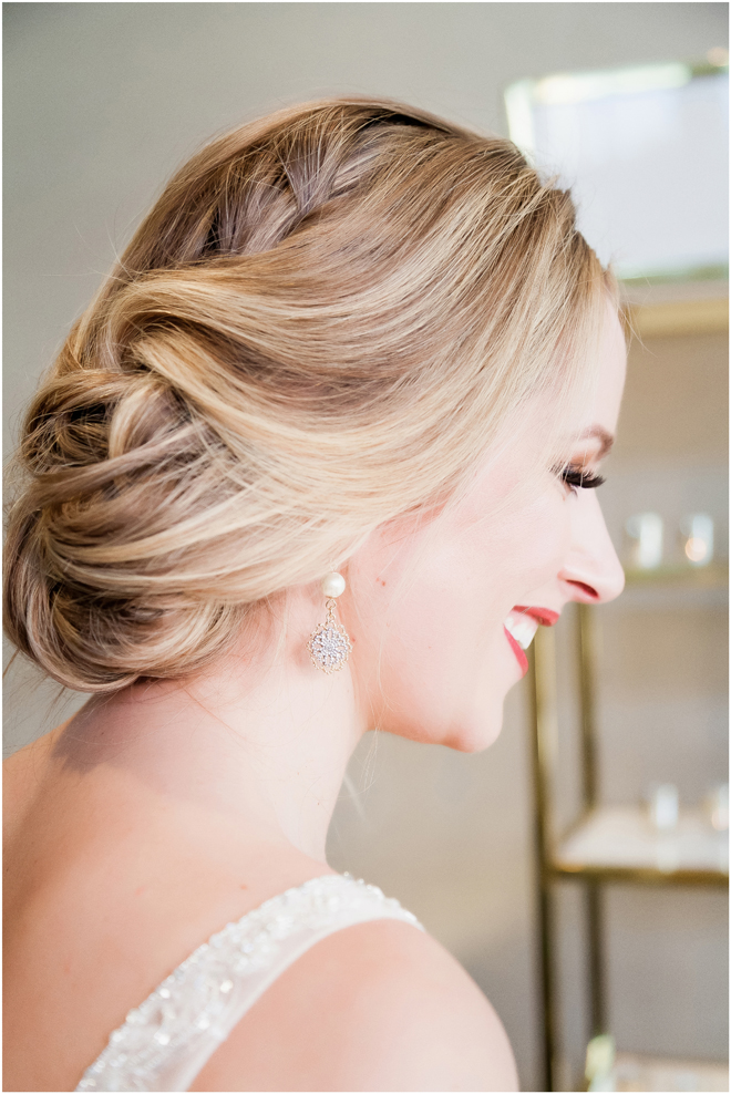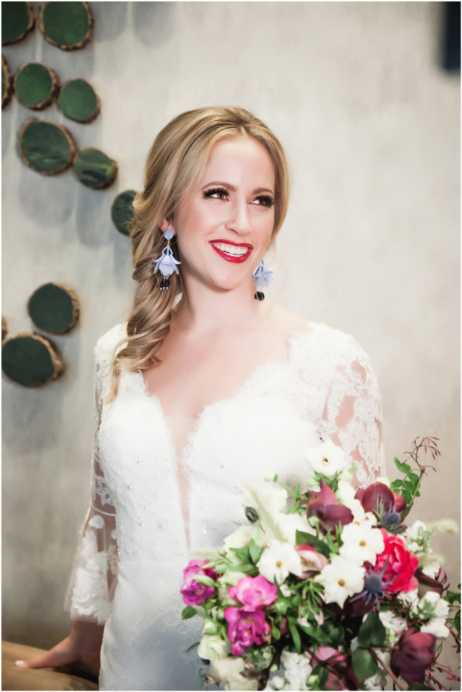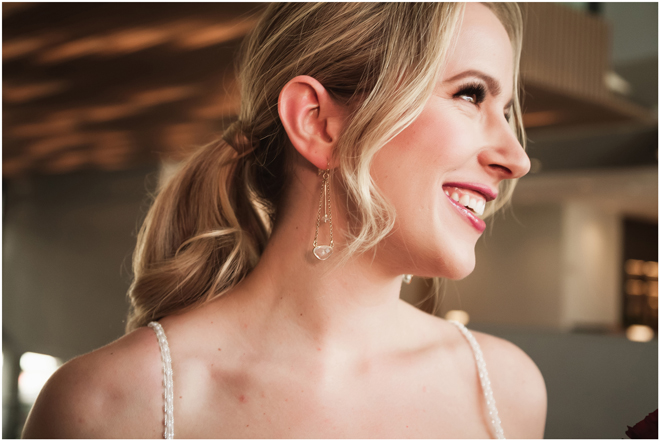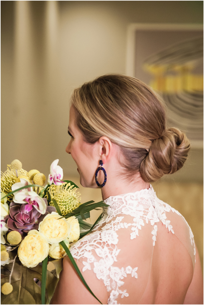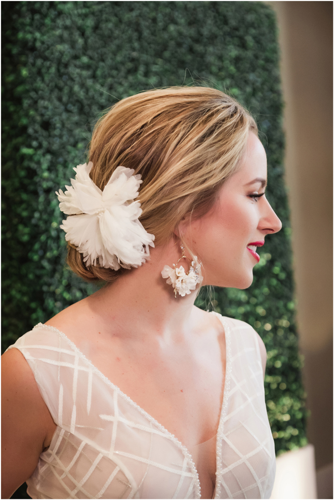 Gown from The Clothes Mine; Earrings by Sorrelli Jewelry; Bouquet by Hillside Blooms Floristry; Hair and makeup by All Dolled Up Hair and Makeup Artistry; Photo by 2 Girls 20 Cameras, on location at Kimpton Sawyer Hotel