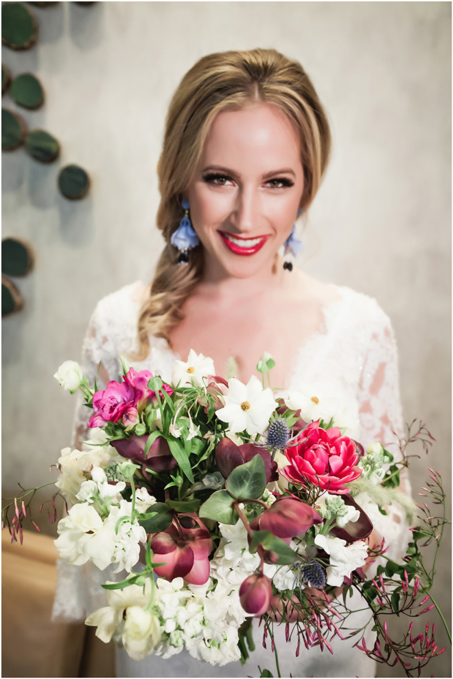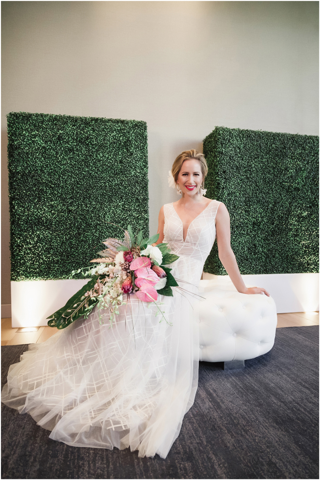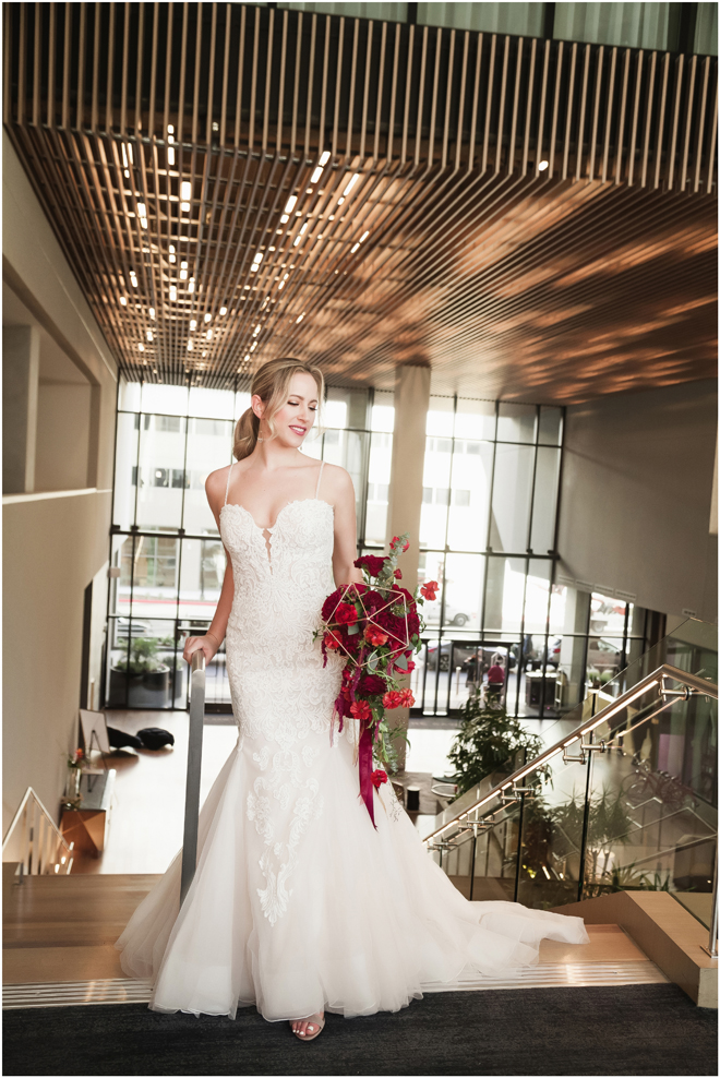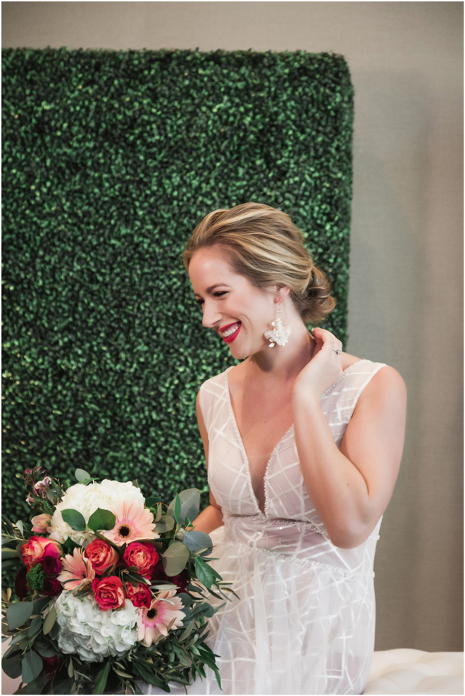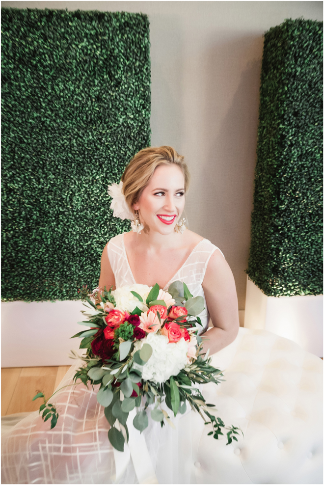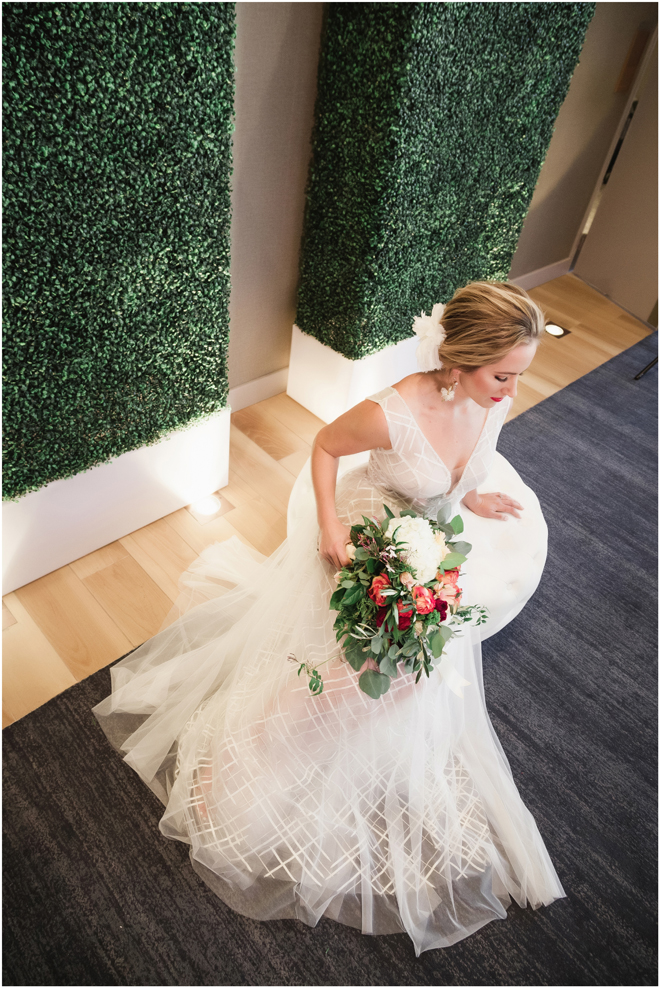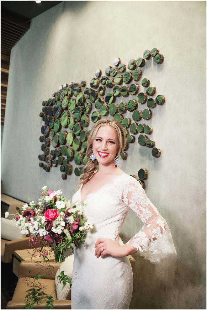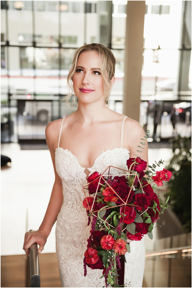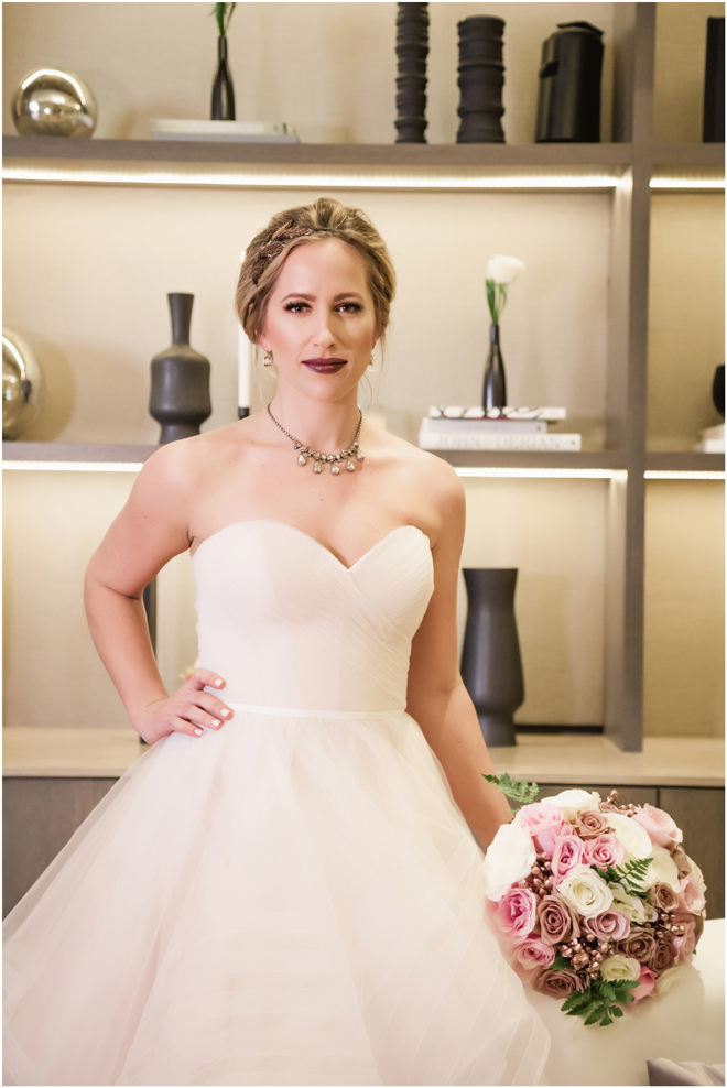 Gown from The Clothes Mine; Earrings from Macy’s; Bouquet by Visual Impact Design; Hair and makeup by All Dolled Up Hair and Makeup Artistry; Photo by 2 Girls 20 Cameras, on location at Kimpton Sawyer Hotel