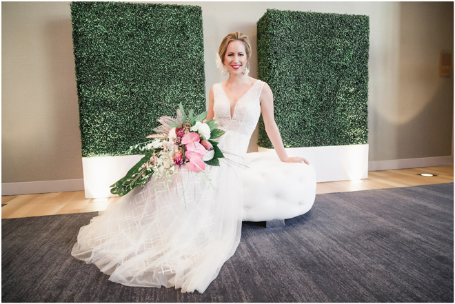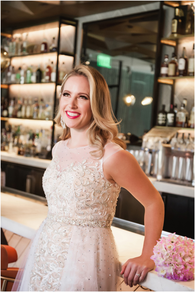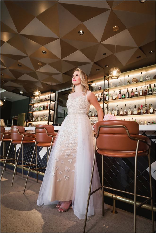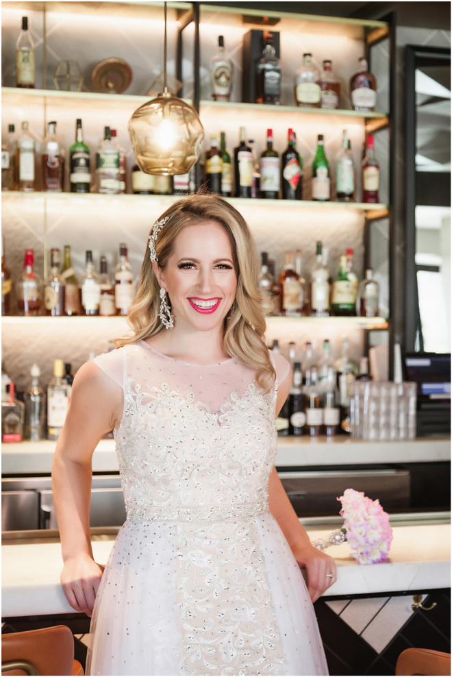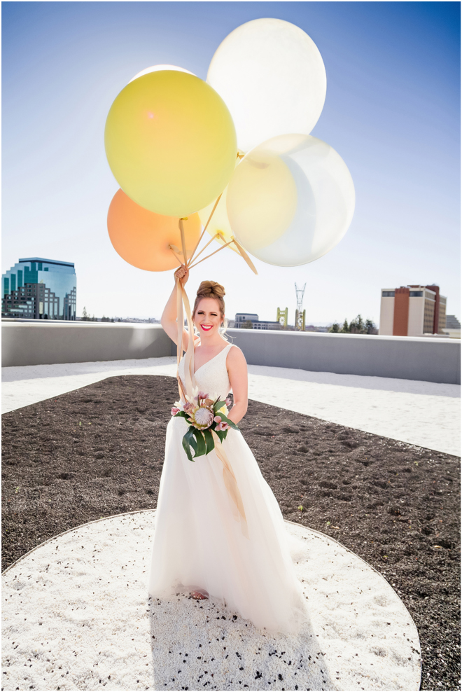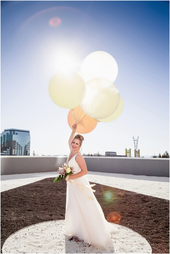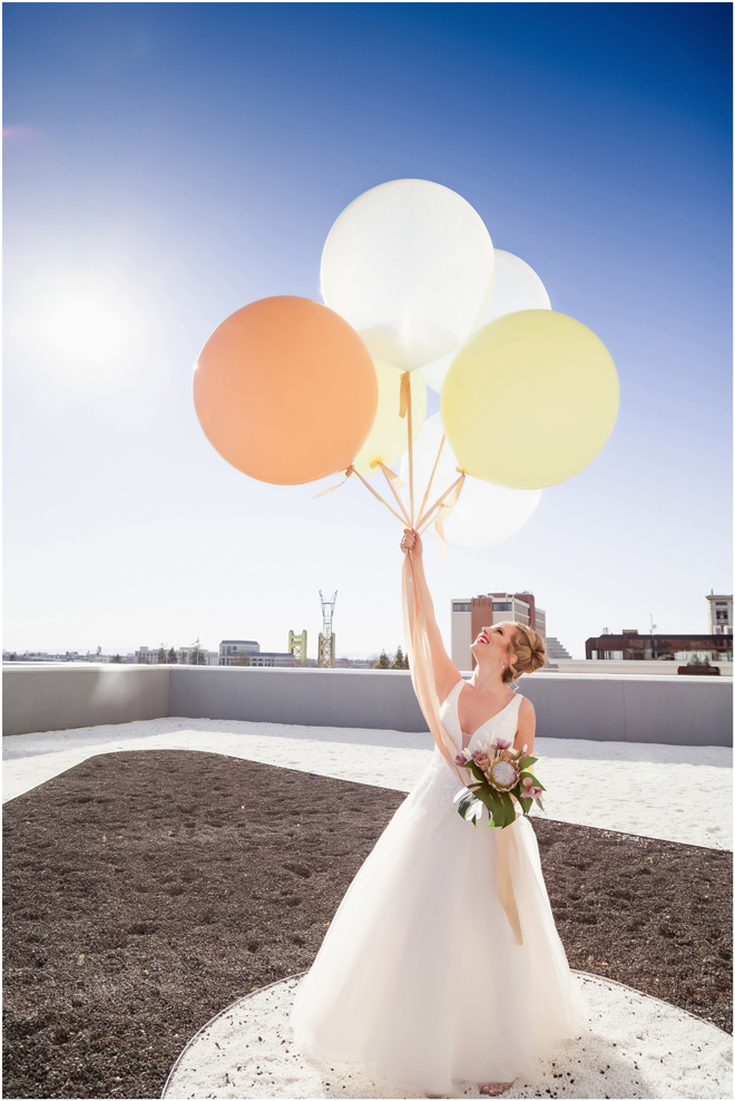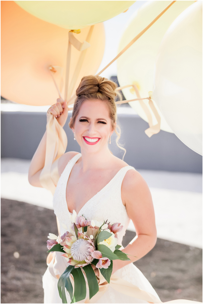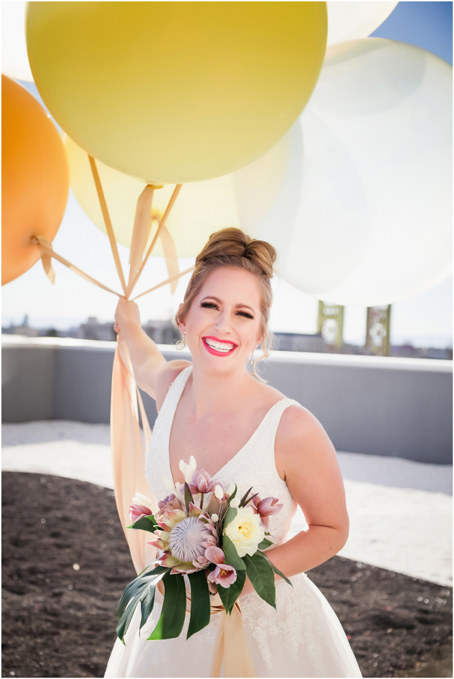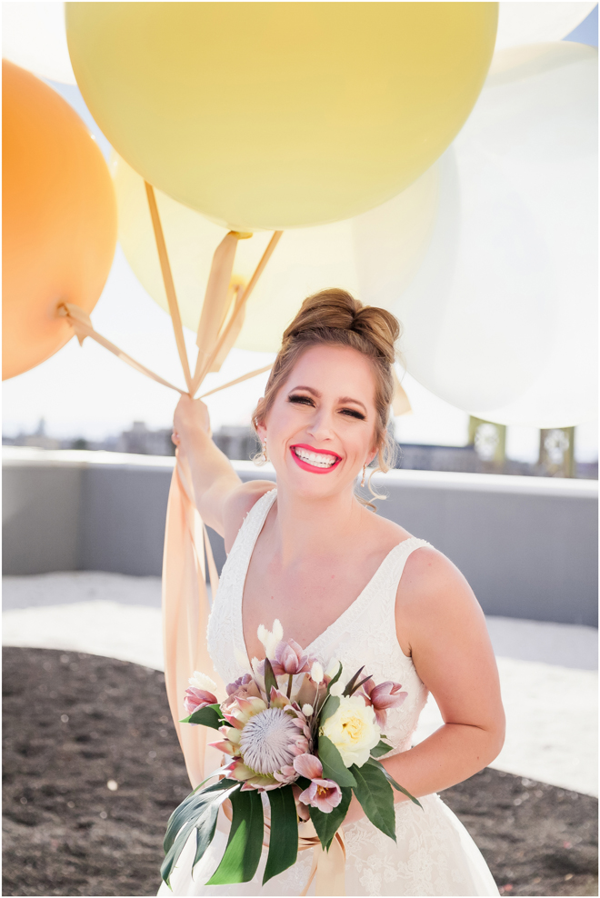 Gown from The Bridal Box; Earrings by Luxurious Bridal; Bouquet by Hillside Blooms Floristry; Hair and makeup by All Dolled Up Hair and Makeup Artistry; Photo by 2 Girls 20 Cameras, on location at Kimpton Sawyer Hotel. Balloons by The Party Concierge