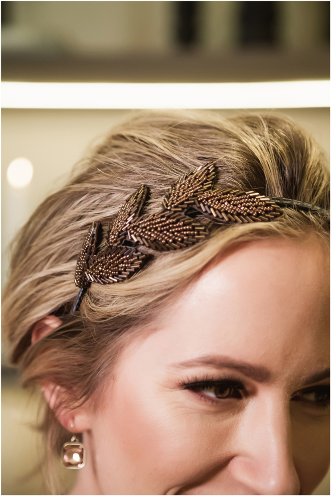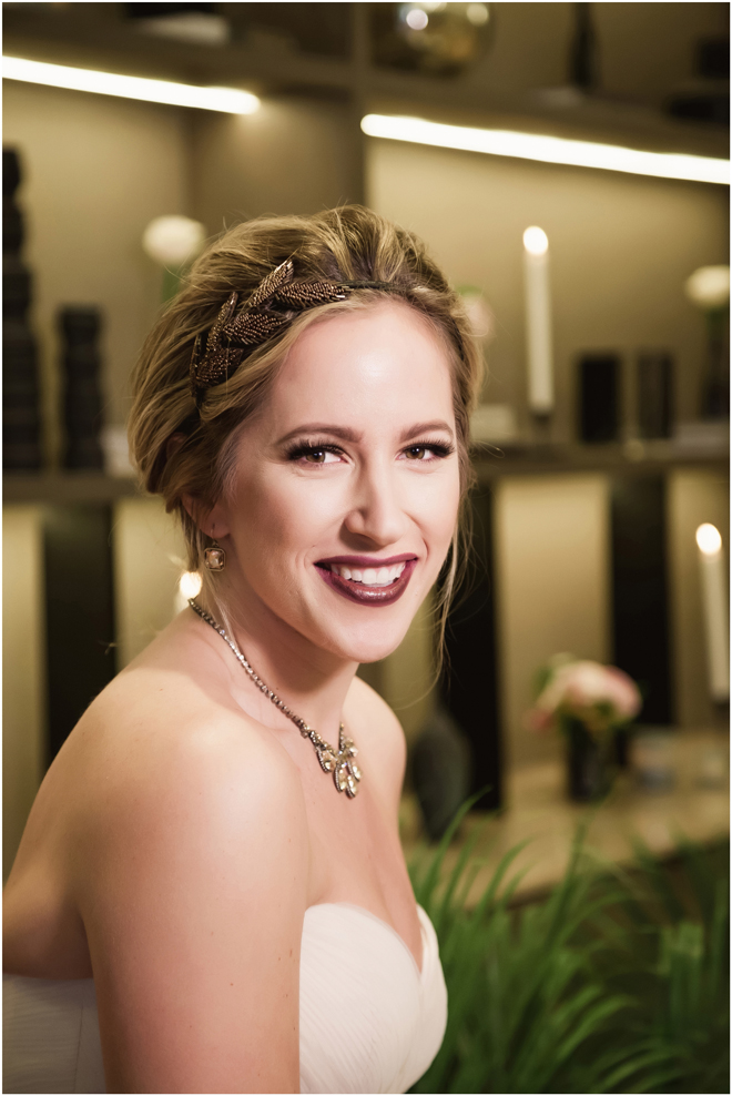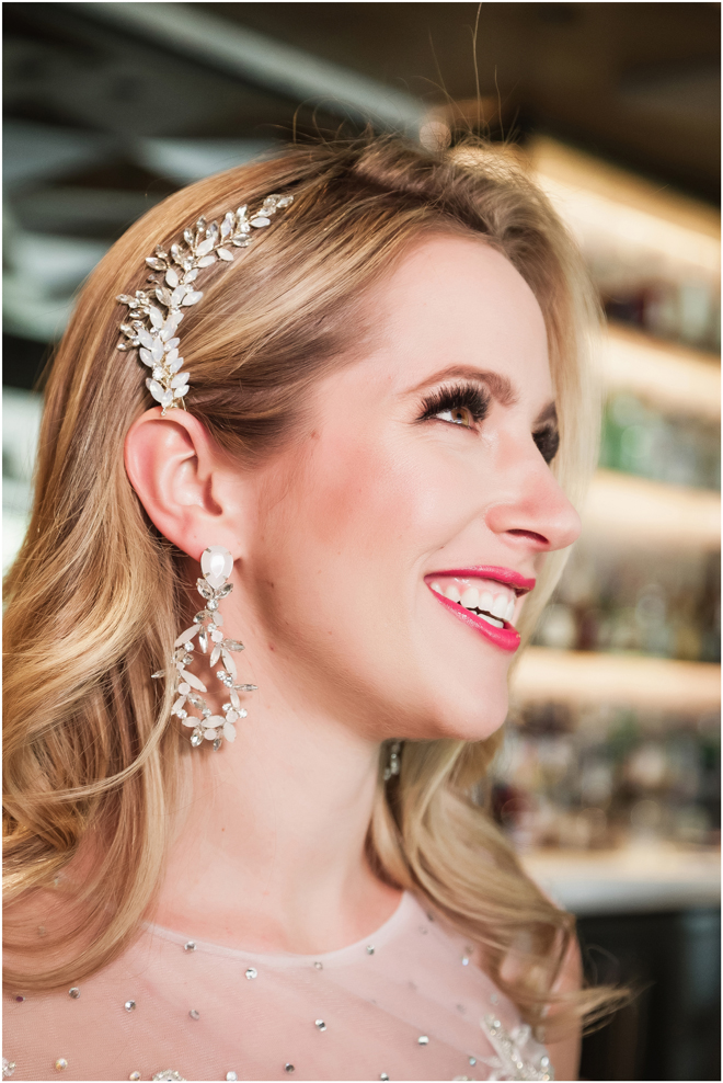 Gown from Always Elegant Bridal & Tuxedo; Headpiece by Always Elegant Bridal & Tuxedo; Earrings by Sorrelli Jewelry; Bouquet by Paradise Parkway Event Productions; Hair and makeup by All Dolled Up Hair and Makeup Artistry; Photo by 2 Girls 20 Cameras, on location at Kimpton Sawyer Hotel