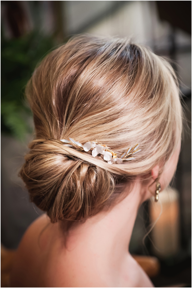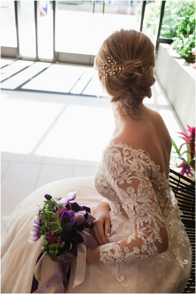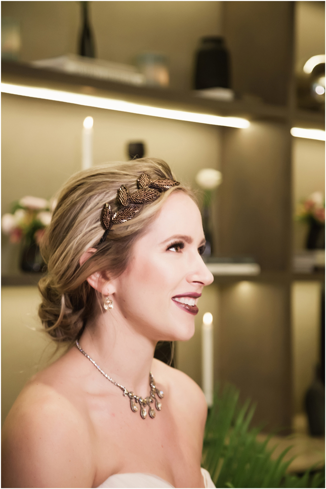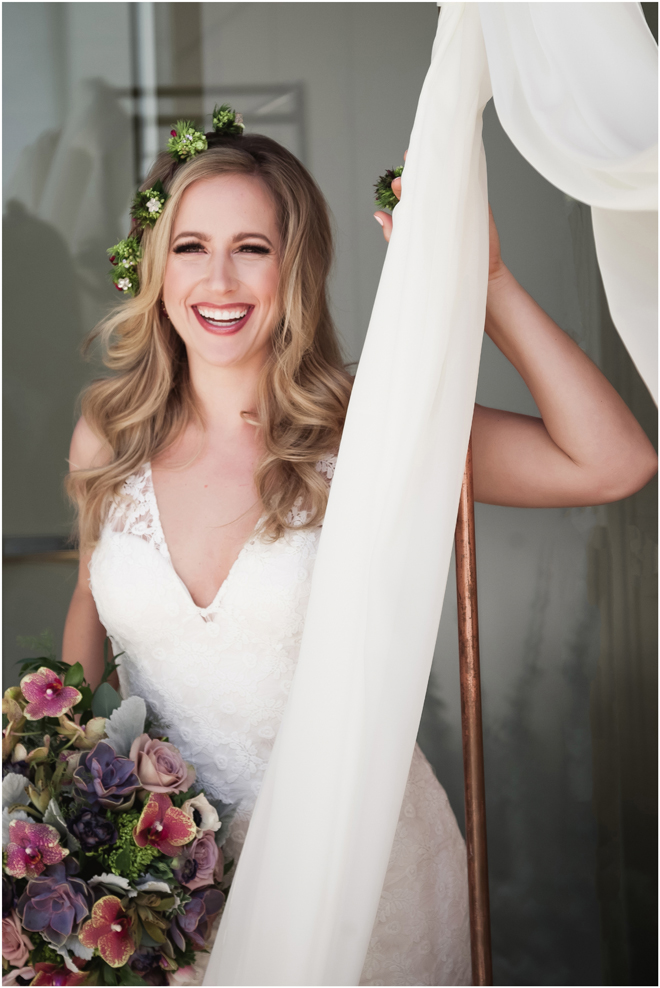 Gown by Luce Sposa from Diamond Bridal Gallery; Headpiece and earrings by Twigs & Honey; Bouquet by Wild Flowers Design Group; Hair and makeup by All Dolled Up Hair and Makeup Artistry; Photo by 2 Girls 20 Cameras, on location at Kimpton Sawyer Hotel