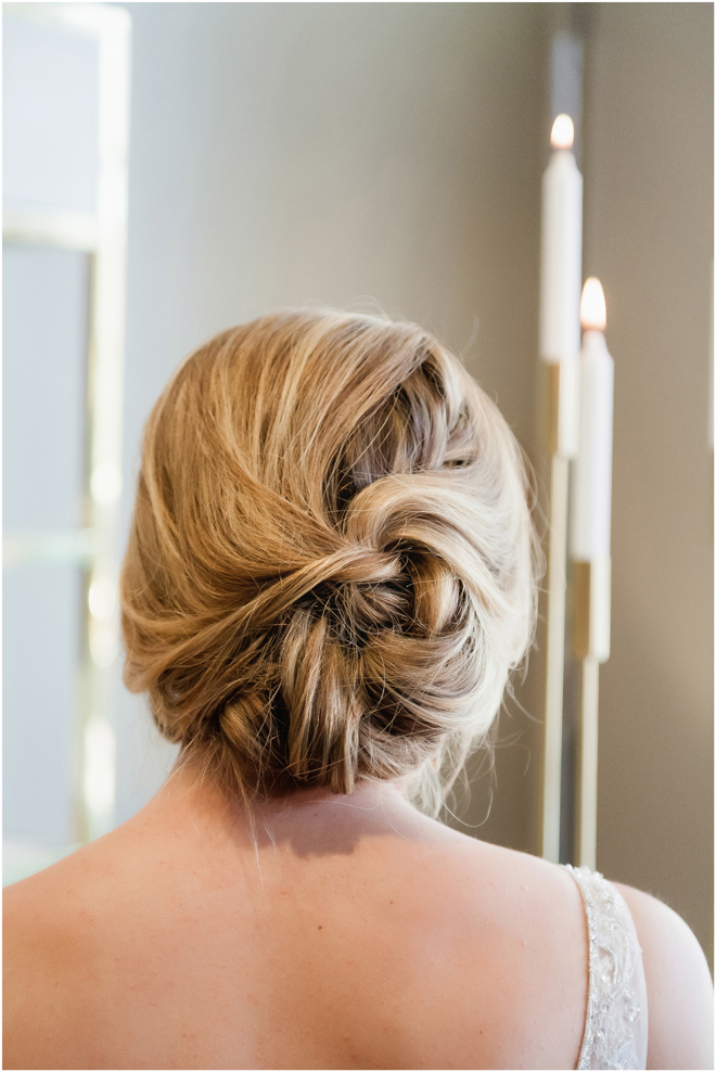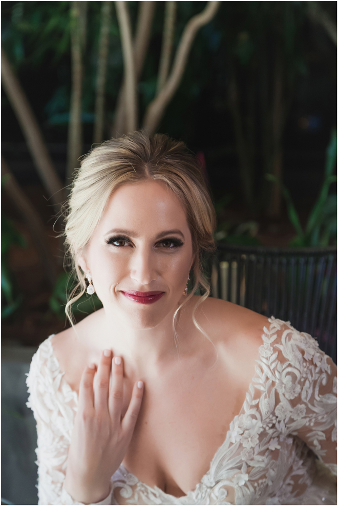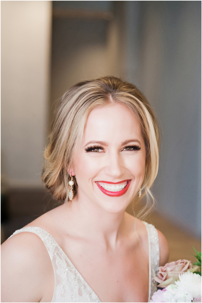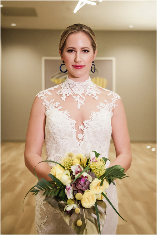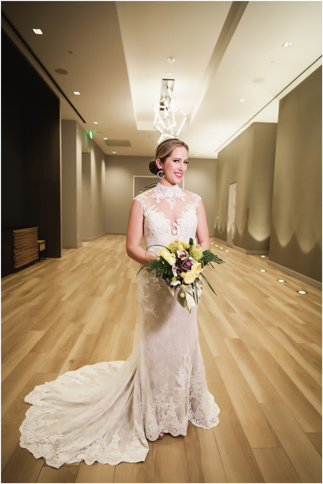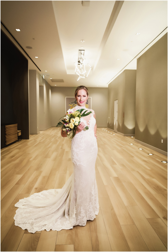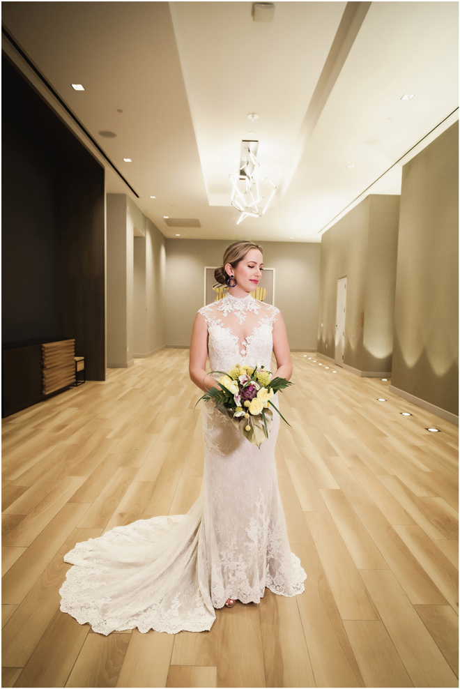 Gown from De la Rosa’s Bridal & Tuxedo; Earrings by Style Avenue Studios; Bouquet by Amour Florist; Hair and makeup by All Dolled Up Hair and Makeup Artistry; Photo by 2 Girls 20 Cameras, on location at Kimpton Sawyer Hotel