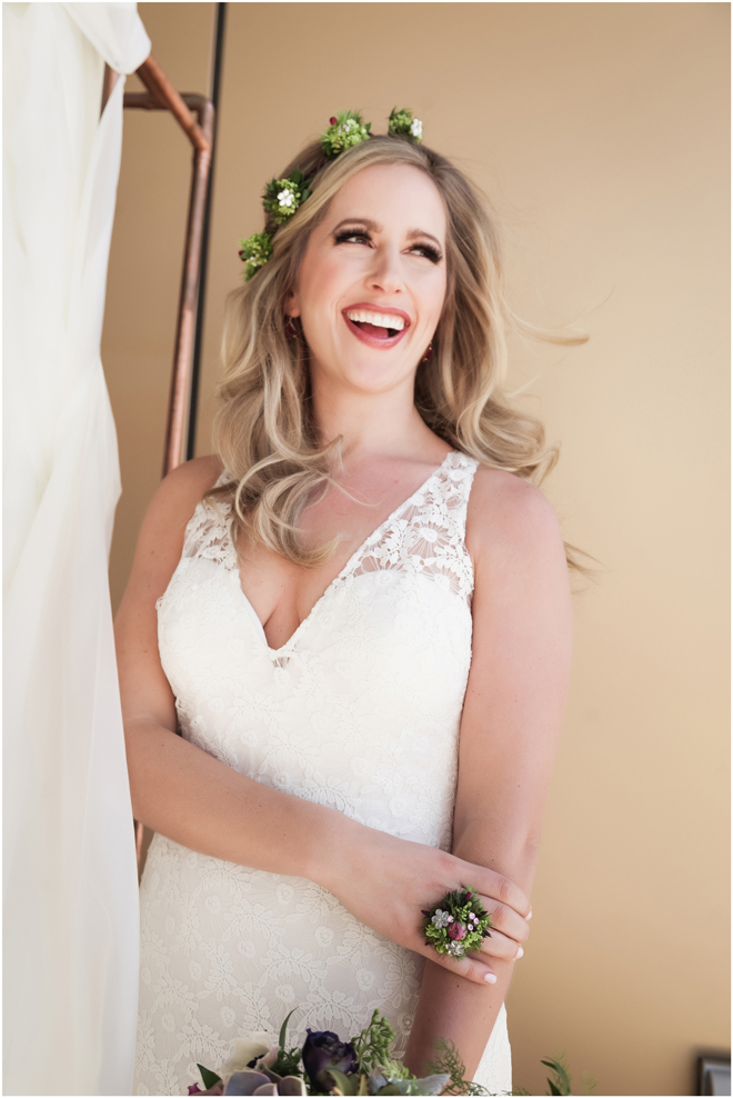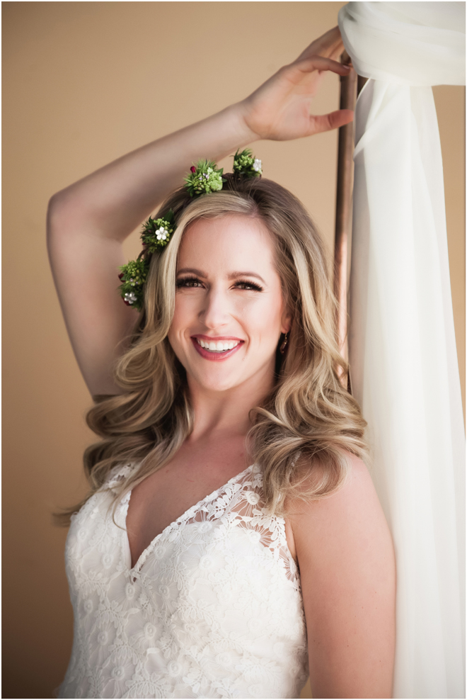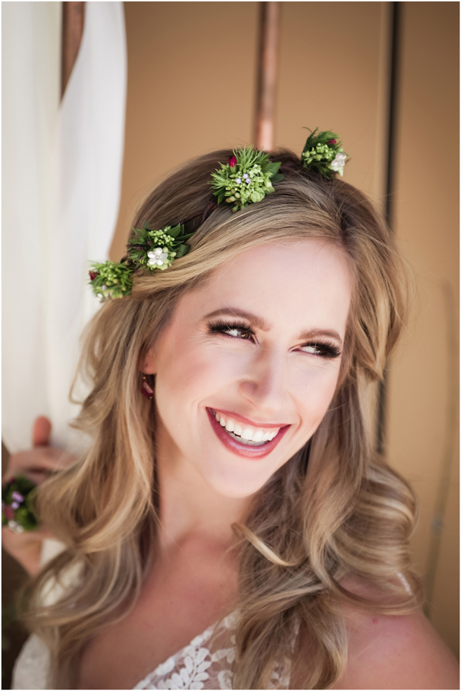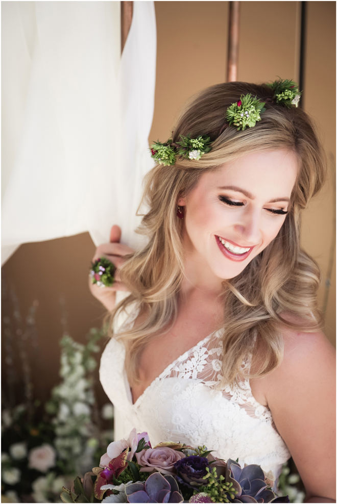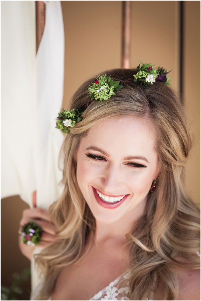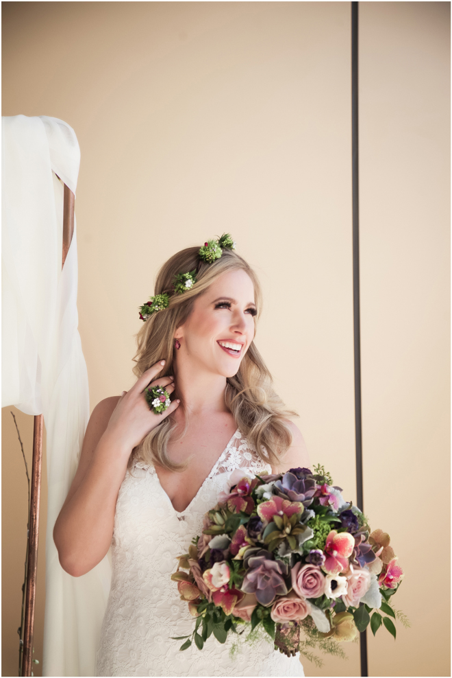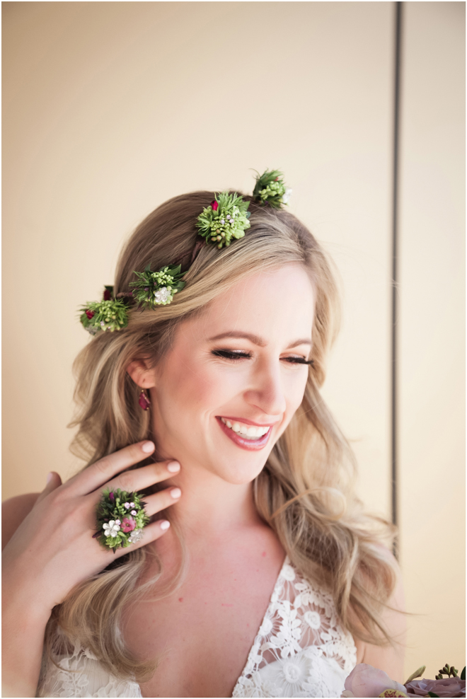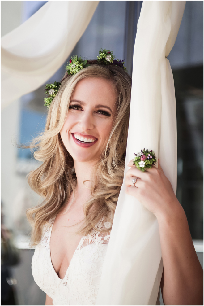 Gown from Second Summer Bride; Earrings by Sorrelli Jewelry; Floral crown, floral ring and bouquet by Strelitzia Flower Company; Hair and makeup by All Dolled Up Hair and Makeup Artistry; Photo by 2 Girls 20 Cameras, on location at Kimpton Sawyer Hotel