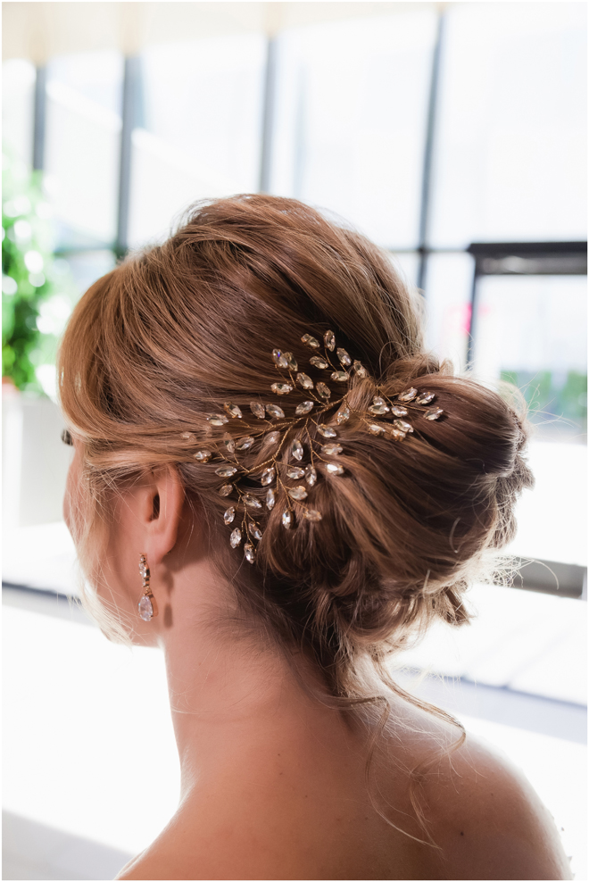 Gown from Always Elegant Bridal & Tuxedo; Headpiece by Mariell; Earrings by Chloe + Isabel; Bouquet by Wild Flowers Design Group; Hair and makeup by All Dolled Up Hair and Makeup Artistry; Photo by 2 Girls 20 Cameras, on location at Kimpton Sawyer Hotel