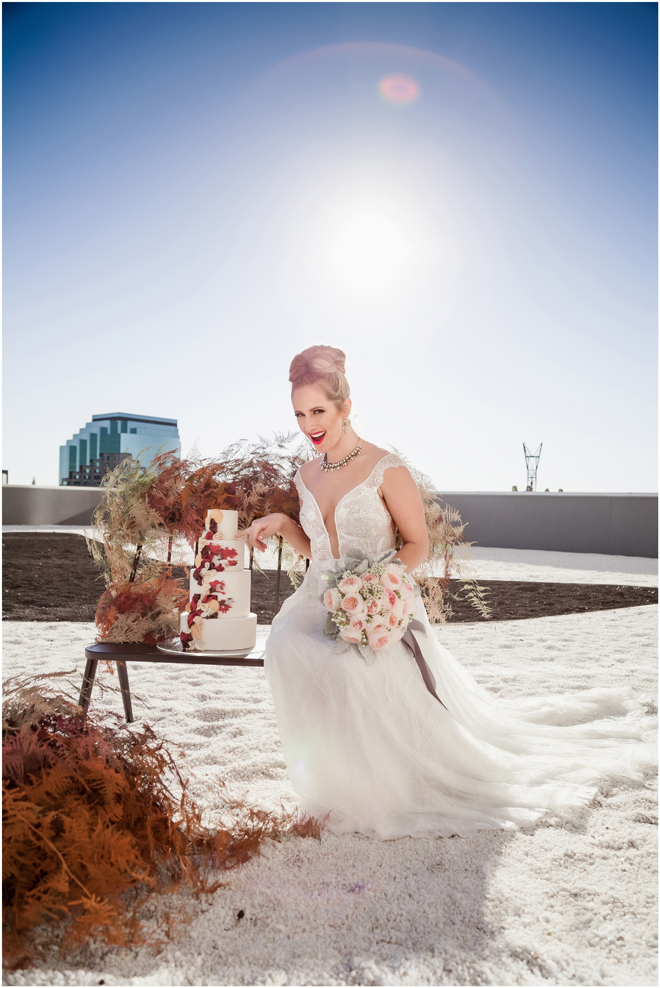 Gown from The Bridal Box; Headpiece by Hair Comes the Bride; Earrings by Luxurious Bridal; Bouquet by Carson Valley Florist; Hair and makeup by All Dolled Up Hair and Makeup Artistry; Photo by 2 Girls 20 Cameras, on location at Kimpton Sawyer Hotel