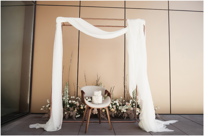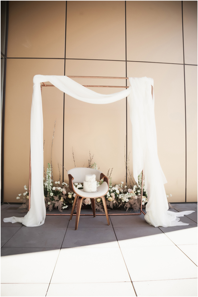 Set design by Ames Haus Design; Set flowers by Ames Haus Design with wholesale flowers from FiftyFlowers.com; Set furniture and arch from Blossom Farm Vintage Rentals; Set draping from Creative Coverings; Set cake by Batter Up Cakery