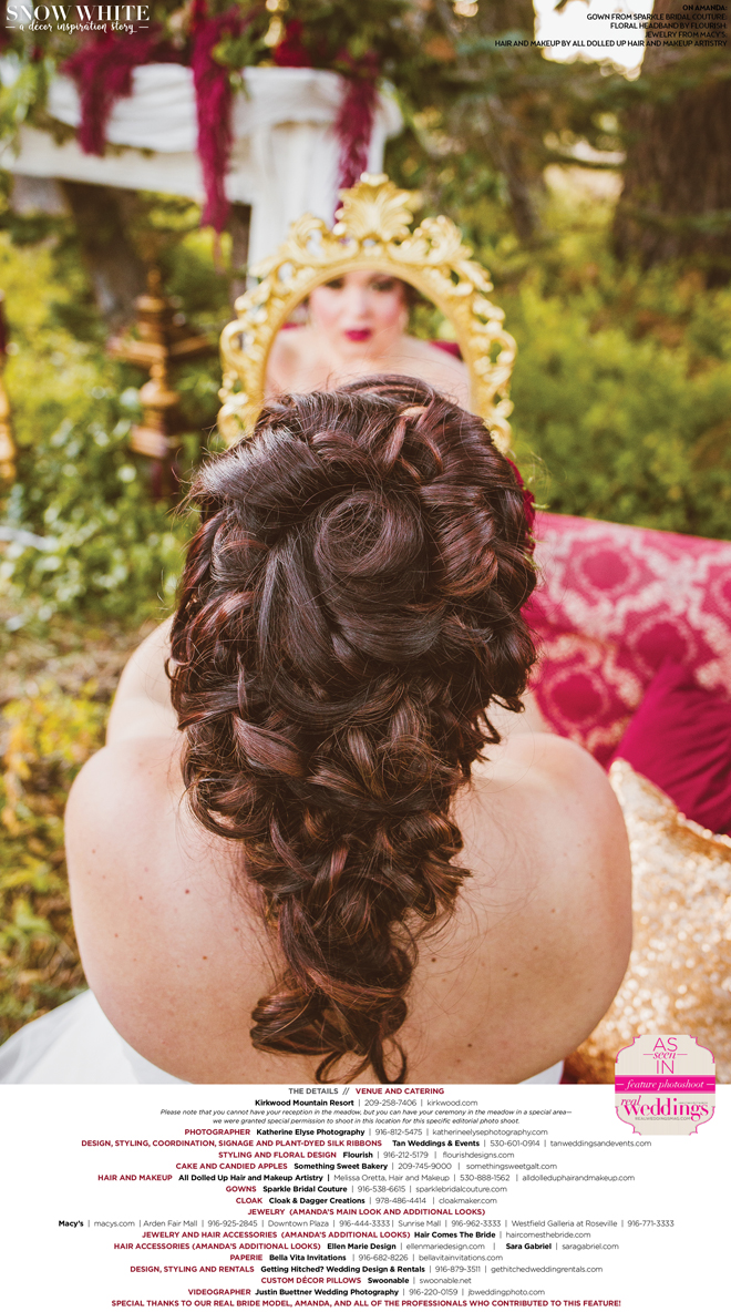 “Snow White” was produced by Rick and Jennifer Tan—Tan Weddings & Events, Tricia Mainer—Getting Hitched? Wedding Design & Rentals, Shannon Cosgrove-Rivas—Flourish, Susie Baggett and Wendy Sipple—Real Weddings Magazine.
