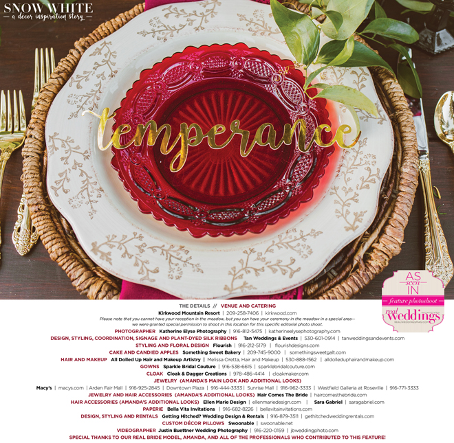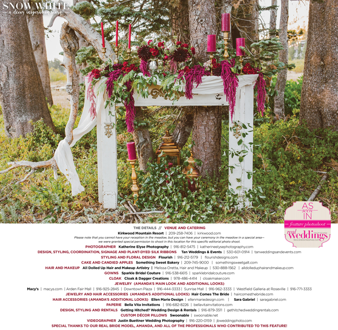 “Snow White” was produced by Rick and Jennifer Tan—Tan Weddings & Events, Tricia Mainer—Getting Hitched? Wedding Design & Rentals, Shannon Cosgrove-Rivas—Flourish, Susie Baggett and Wendy Sipple—Real Weddings Magazine.