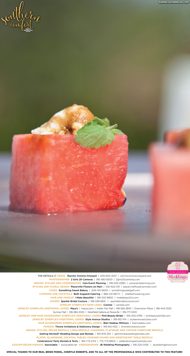 “Southern Comfort” was produced by Rachelle Cain-Wiggins—Cain Event Planning, Tricia Mainer—Getting Hitched? Wedding Design and Rentals, Melissa Cowan—Placerville Flowers on Main, Susie Baggett and Wendy Sipple—Real Weddings Magazine.