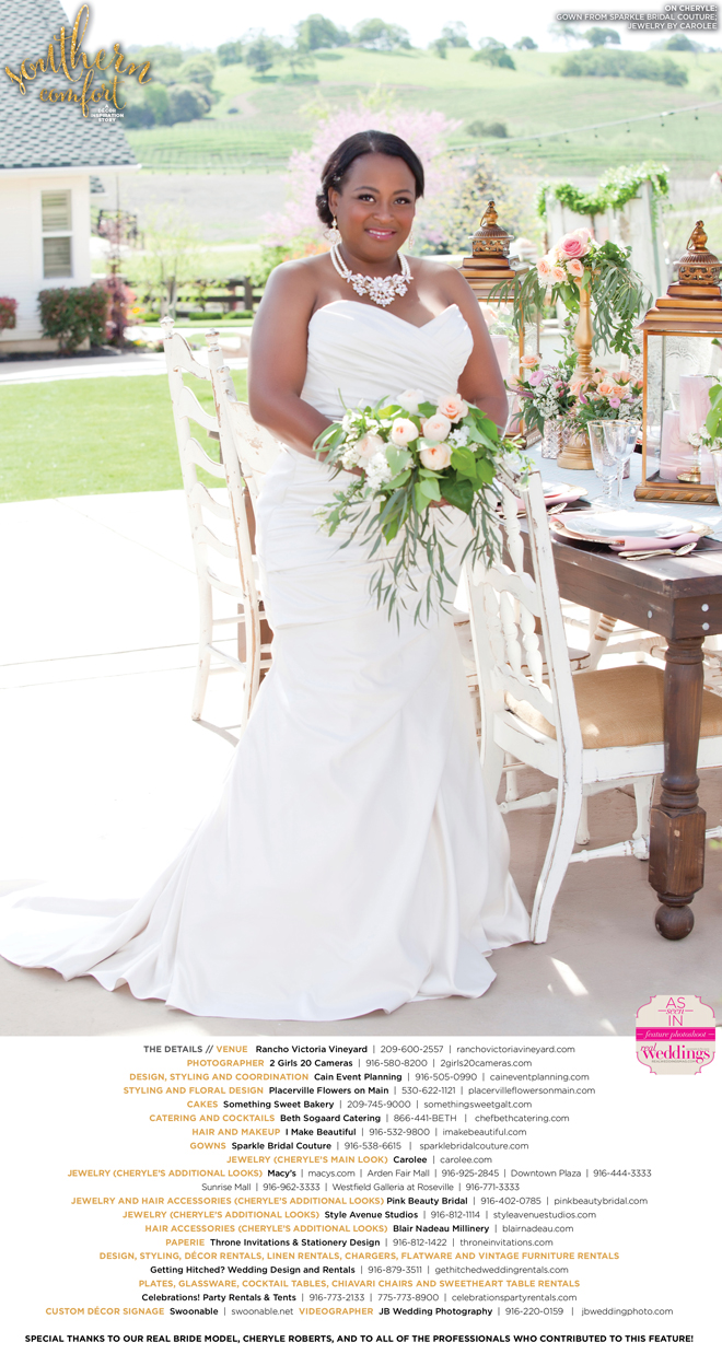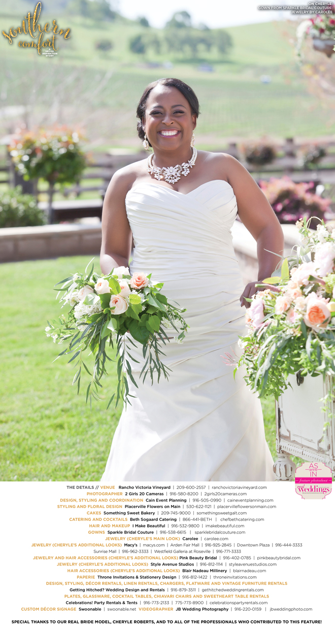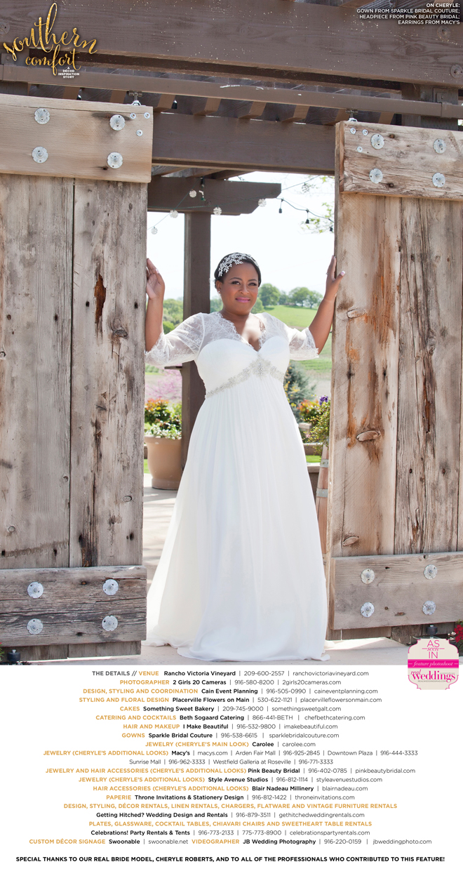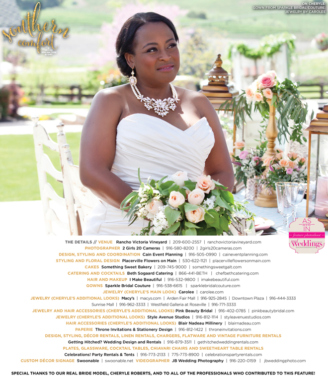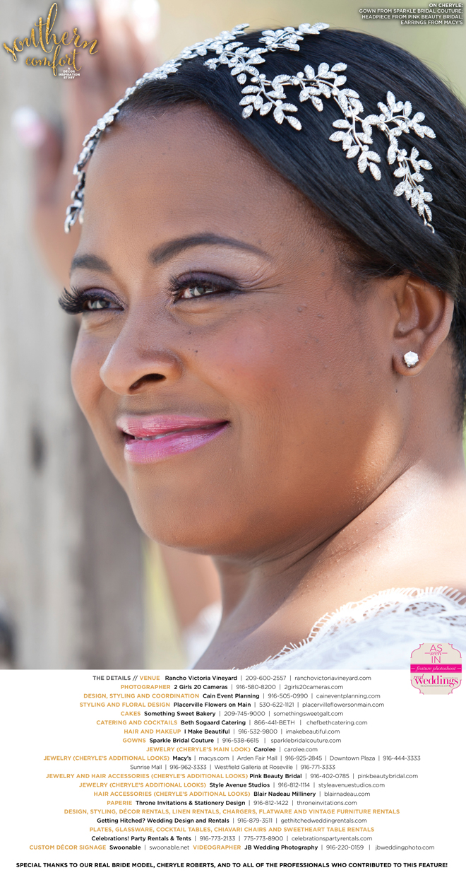 Special thanks to our real bride model, Cheryle Roberts, and to all of the professionals who contributed to this feature!