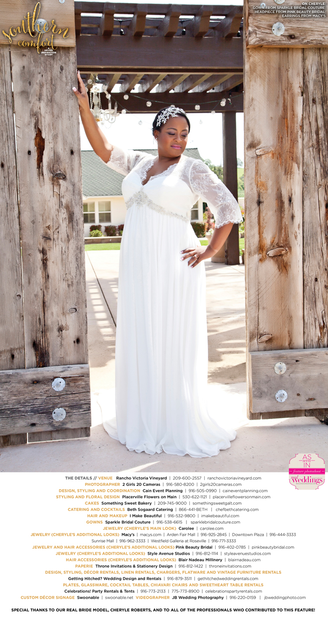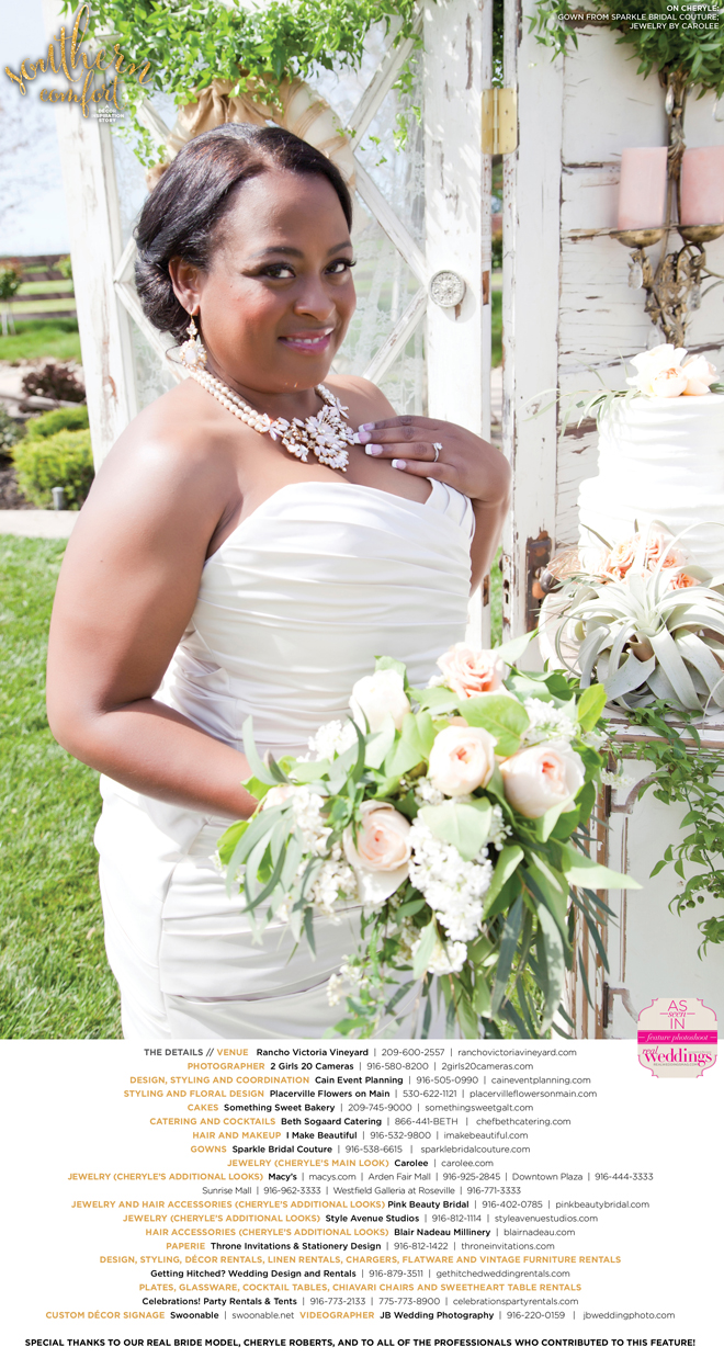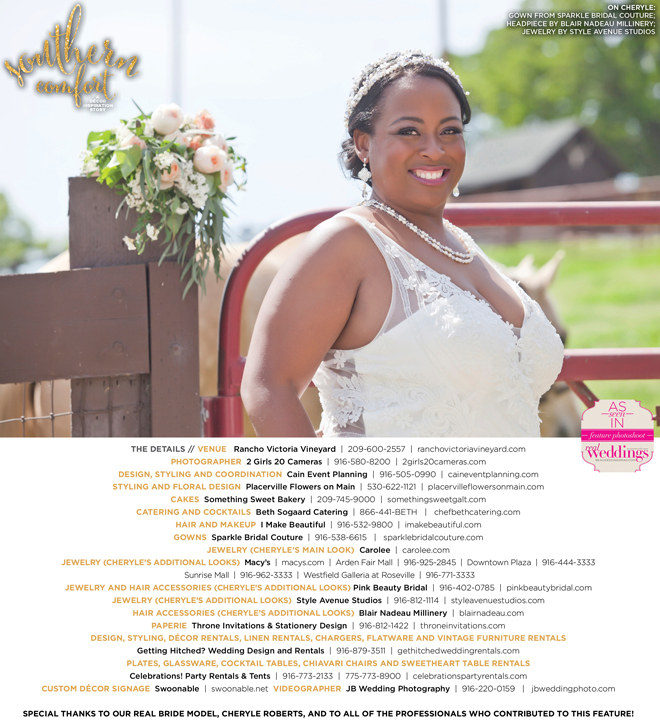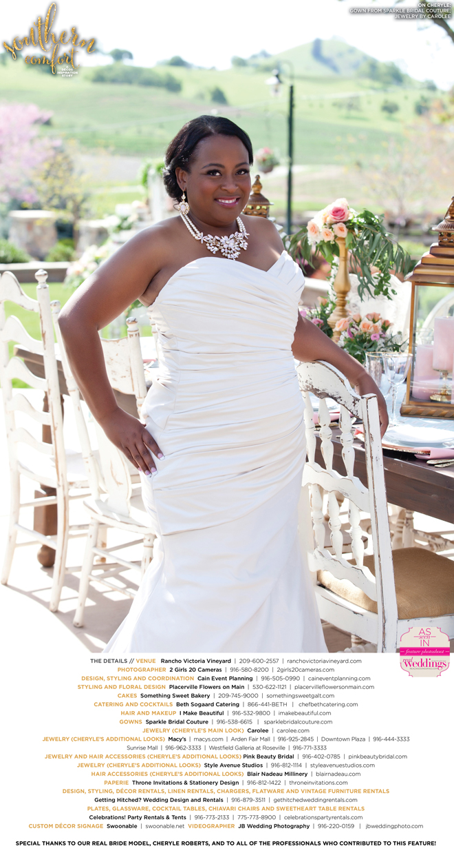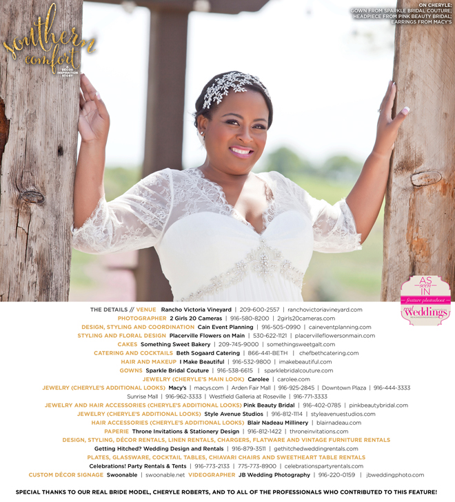 Special thanks to our real bride model, Cheryle Roberts, and to all of the professionals who contributed to this feature!