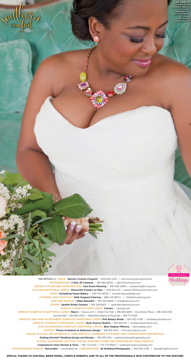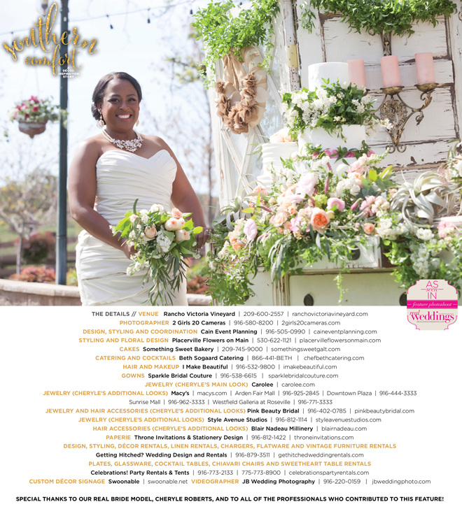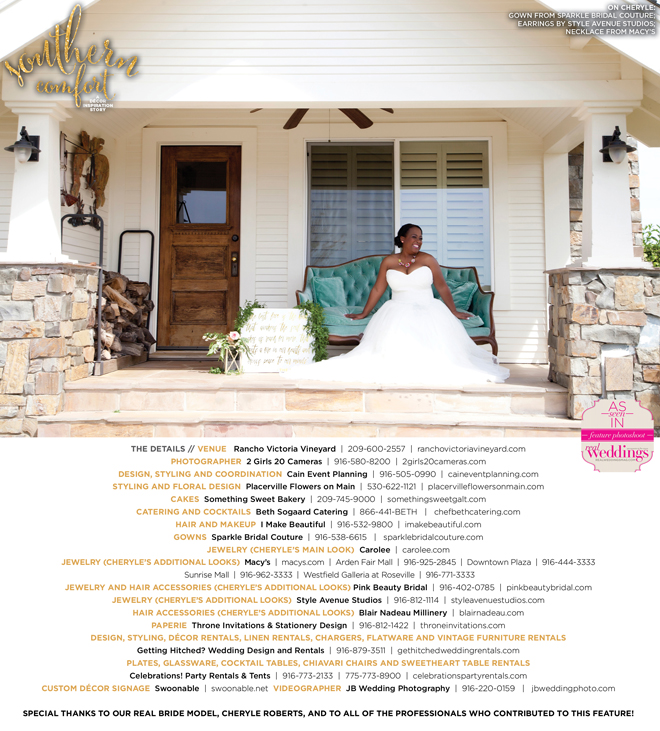 “Southern Comfort” was produced by Rachelle Cain-Wiggins—Cain Event Planning, Tricia Mainer—Getting Hitched? Wedding Design and Rentals, Melissa Cowan—Placerville Flowers on Main, Susie Baggett and Wendy Sipple—Real Weddings Magazine.