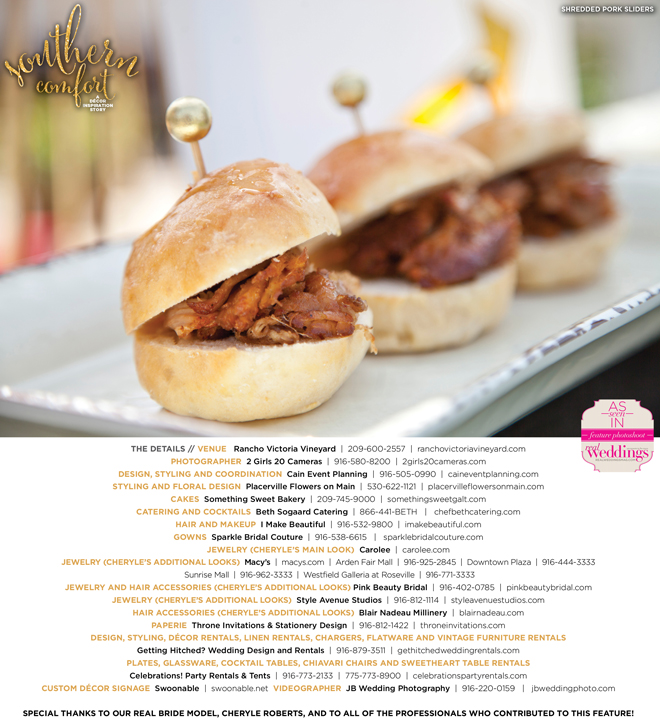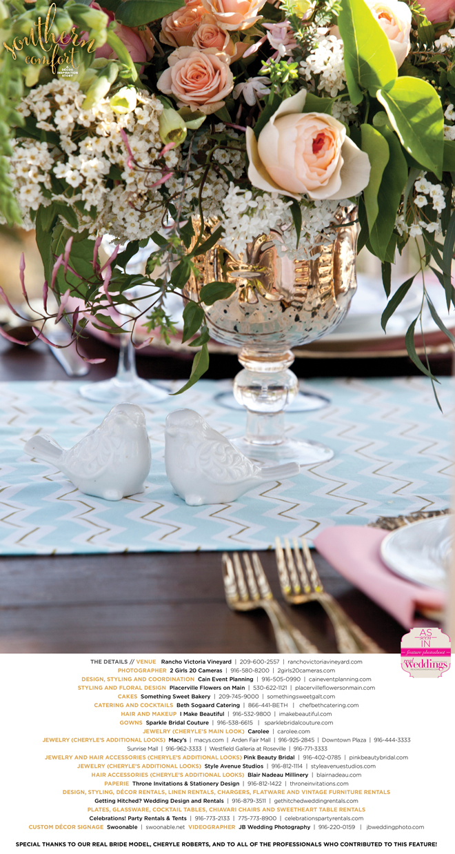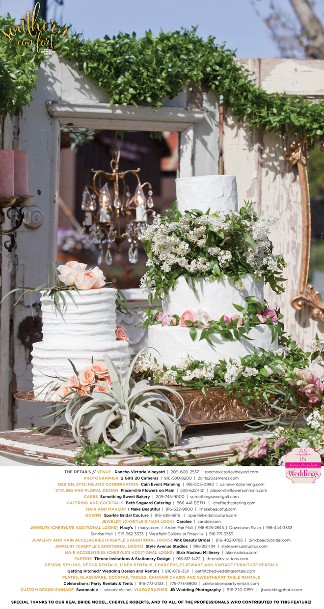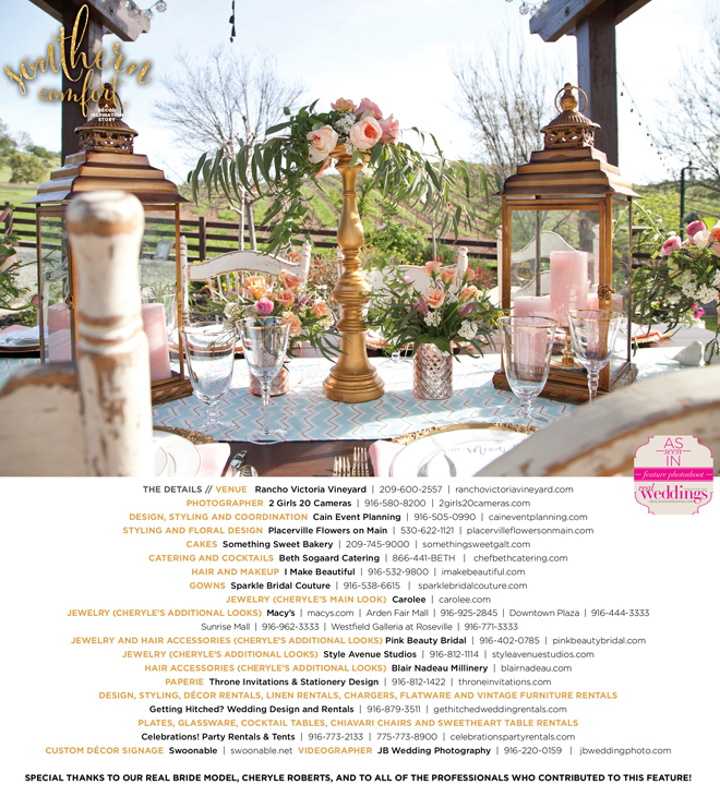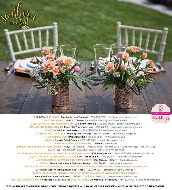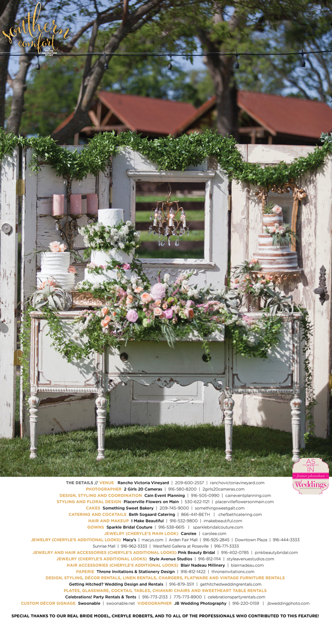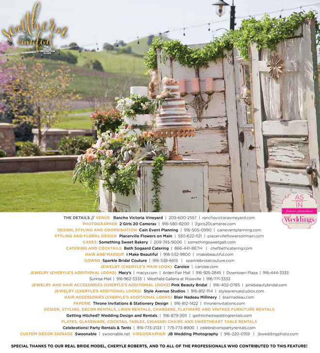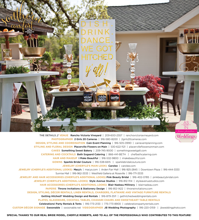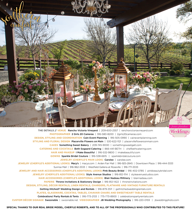 “Southern Comfort” was produced by Rachelle Cain-Wiggins—Cain Event Planning, Tricia Mainer—Getting Hitched? Wedding Design and Rentals, Melissa Cowan—Placerville Flowers on Main, Susie Baggett and Wendy Sipple—Real Weddings Magazine.