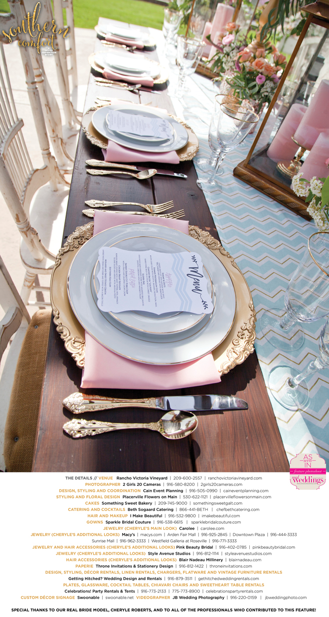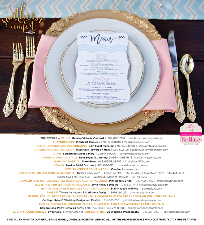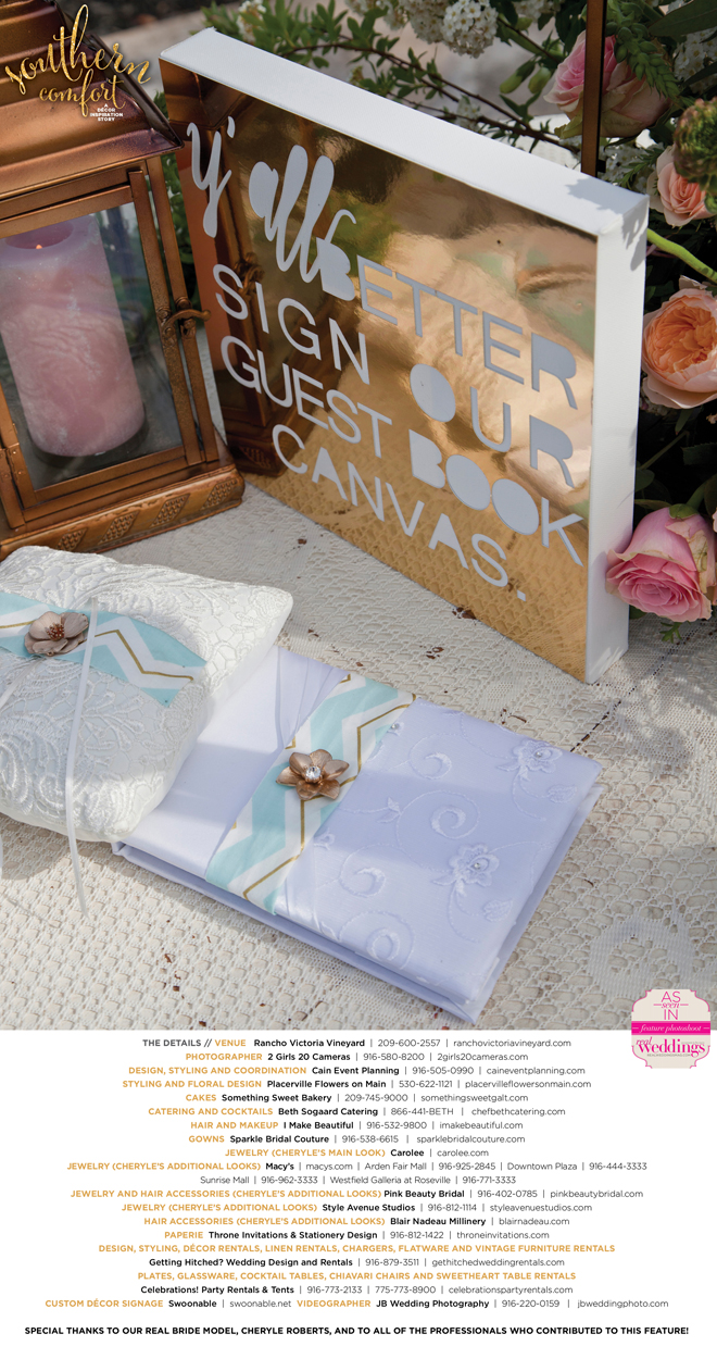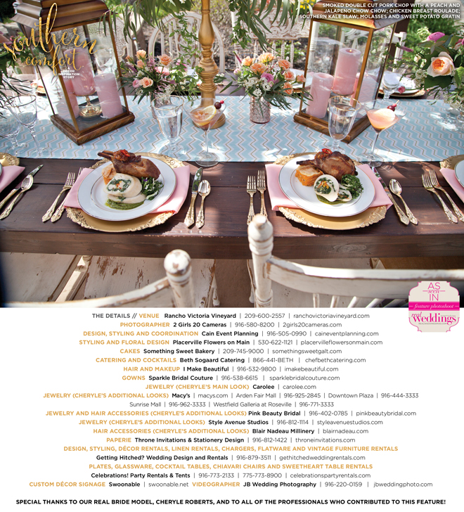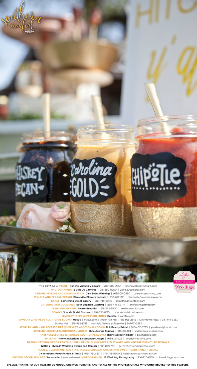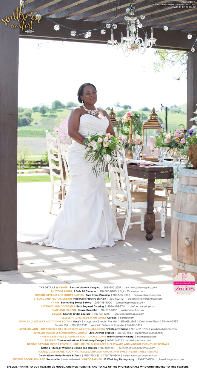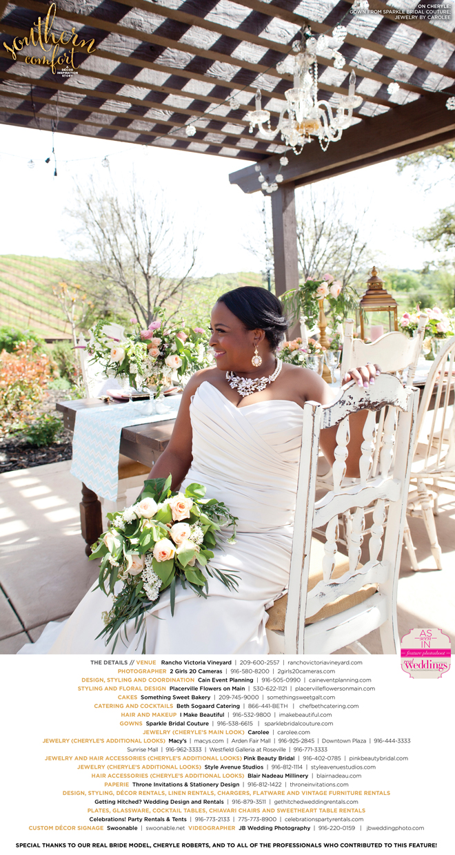 “Southern Comfort” was produced by Rachelle Cain-Wiggins—Cain Event Planning, Tricia Mainer—Getting Hitched? Wedding Design and Rentals, Melissa Cowan—Placerville Flowers on Main, Susie Baggett and Wendy Sipple—Real Weddings Magazine.