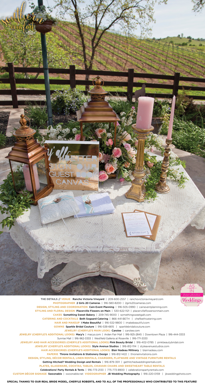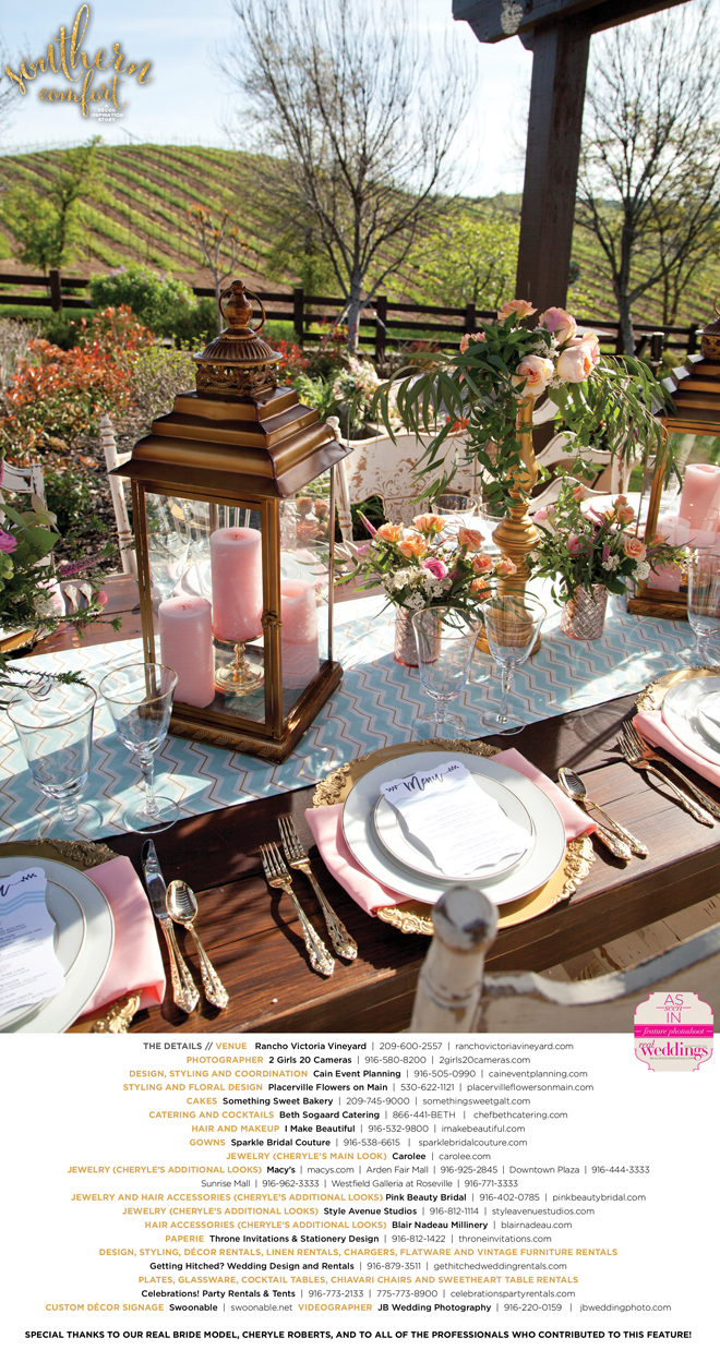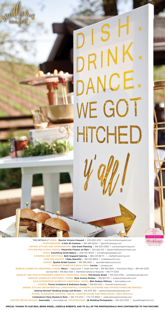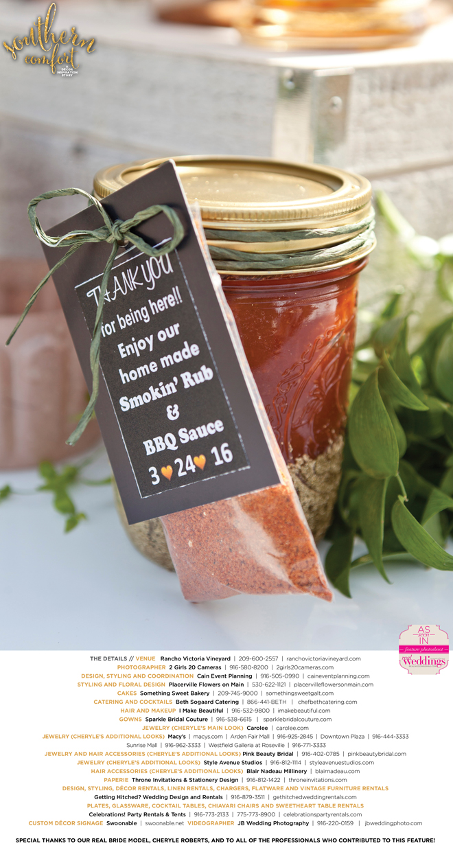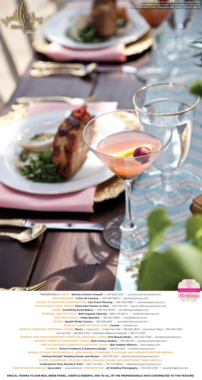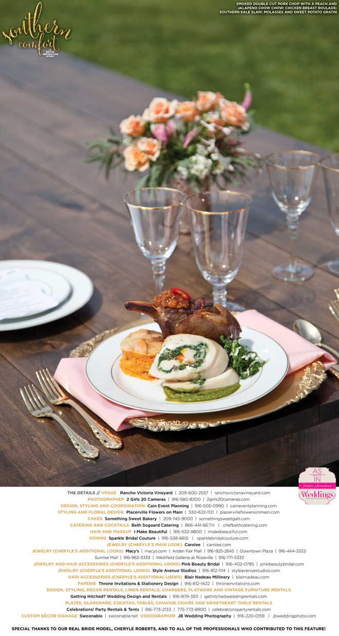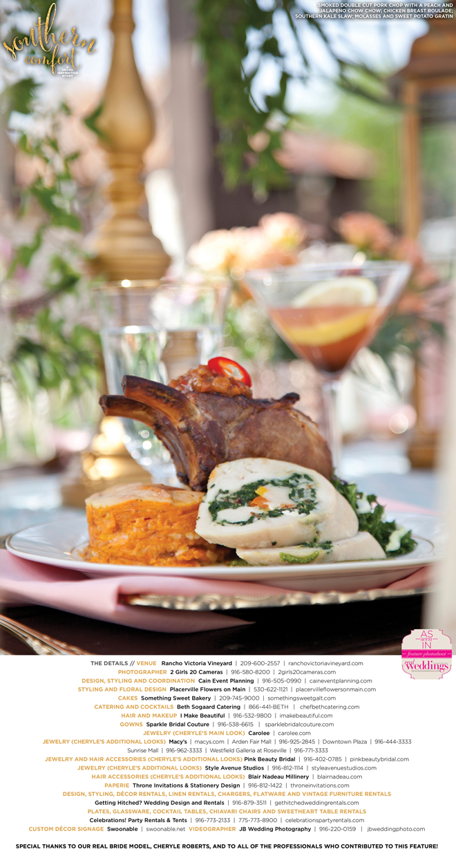 “Southern Comfort” was produced by Rachelle Cain-Wiggins—Cain Event Planning, Tricia Mainer—Getting Hitched? Wedding Design and Rentals, Melissa Cowan—Placerville Flowers on Main, Susie Baggett and Wendy Sipple—Real Weddings Magazine.
