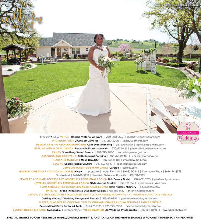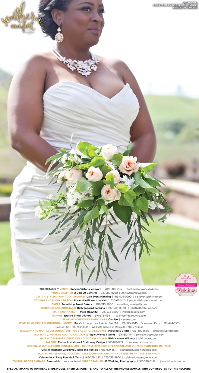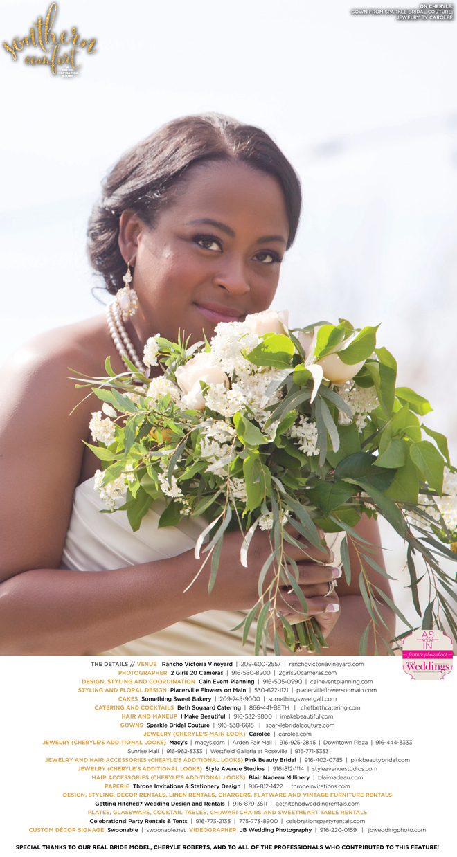 Special thanks to our real bride model, Cheryle Roberts, and to all of the professionals who contributed to this feature!