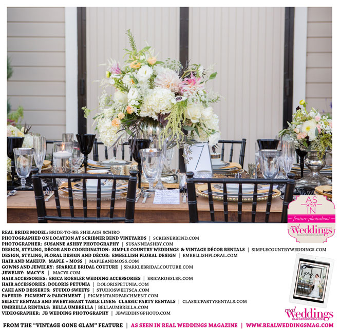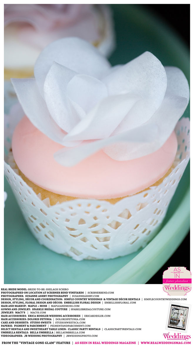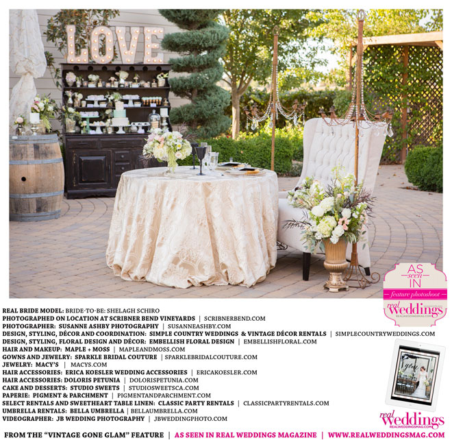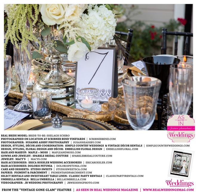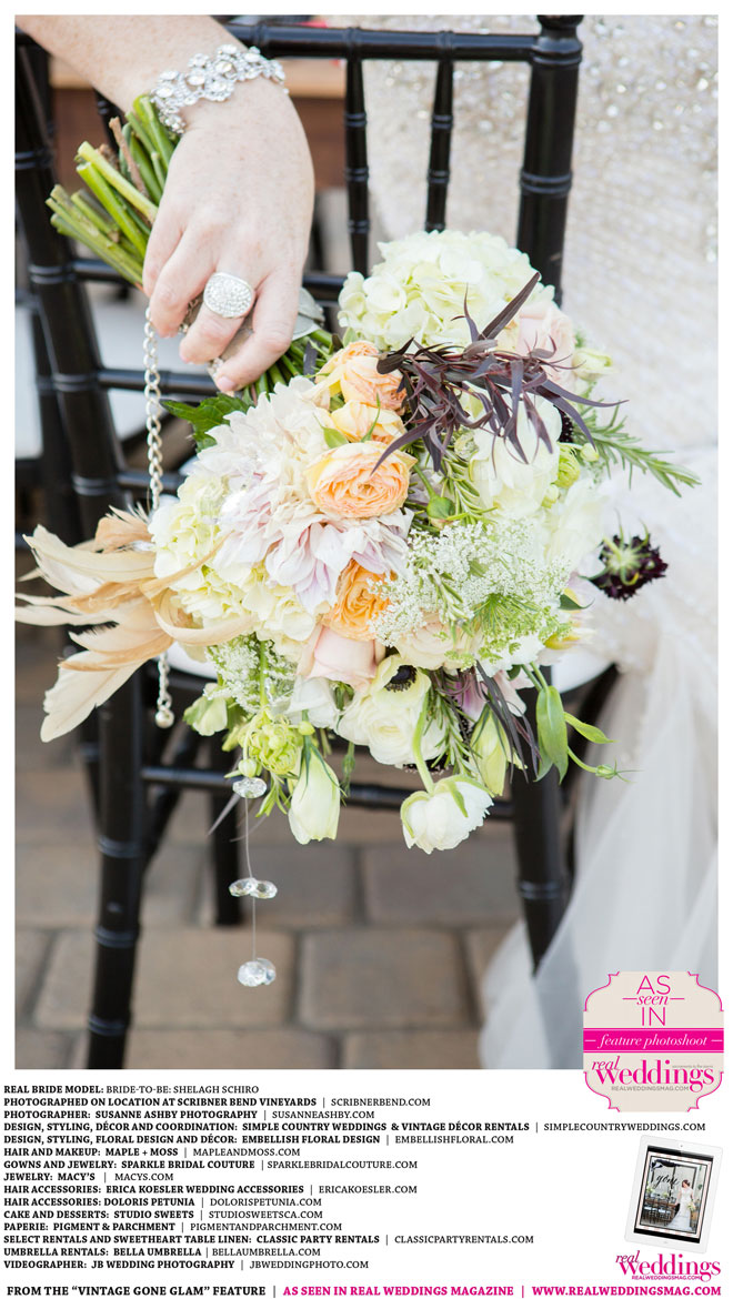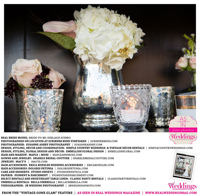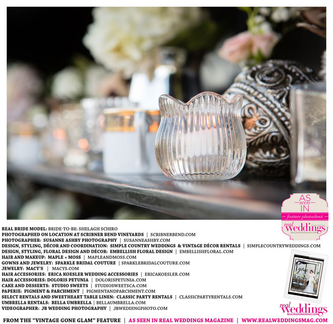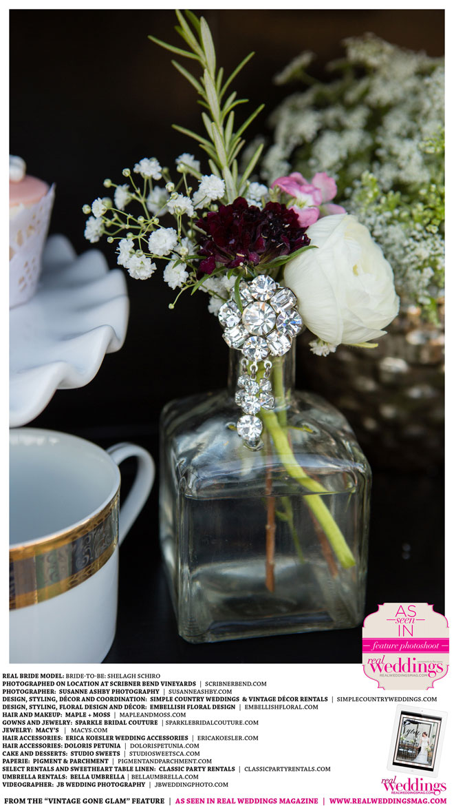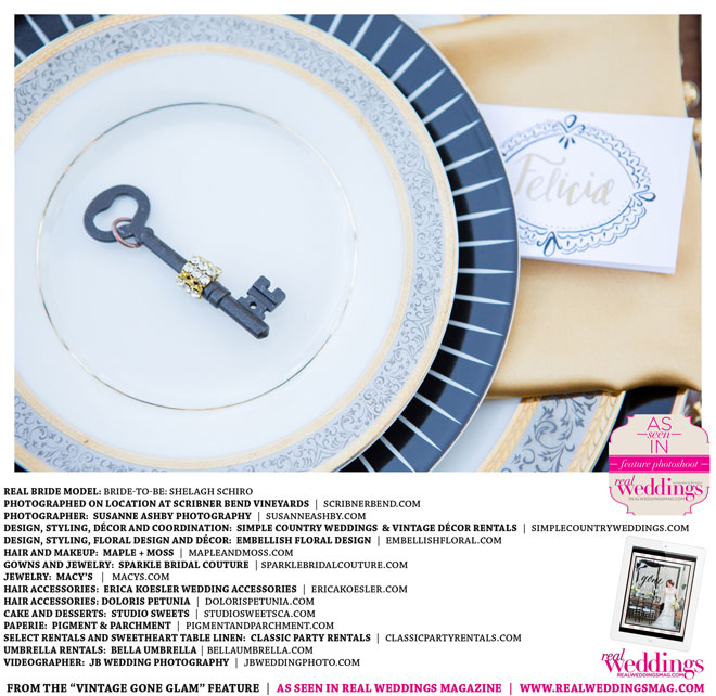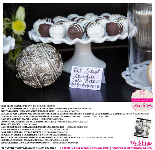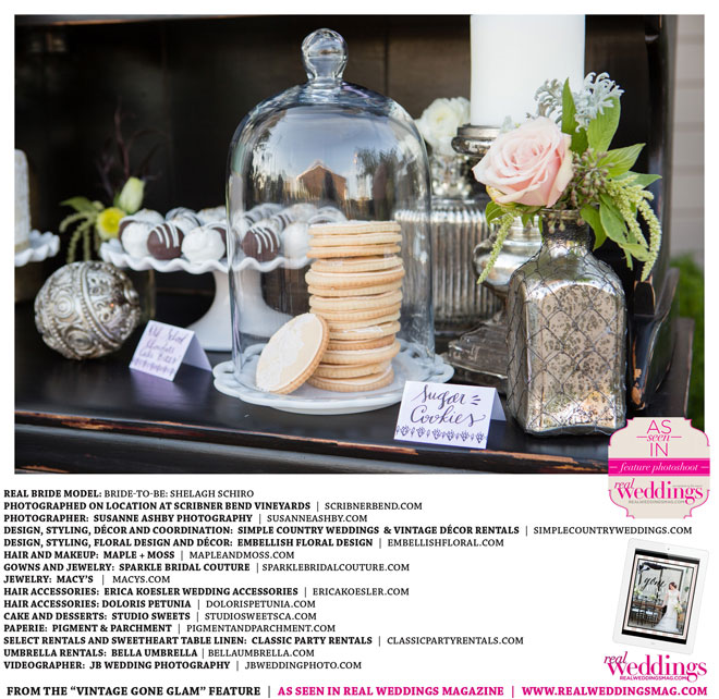 The “Vintage Gone Glam” feature was produced by Ramona Arnold-Simple Country Weddings & Vintage Decor Rentals, Emily Faso-Embellish Floral Design, Samantha Grippe-Studio Sweets, and Emily Peter and Wendy Sipple-Real Weddings Magazine.