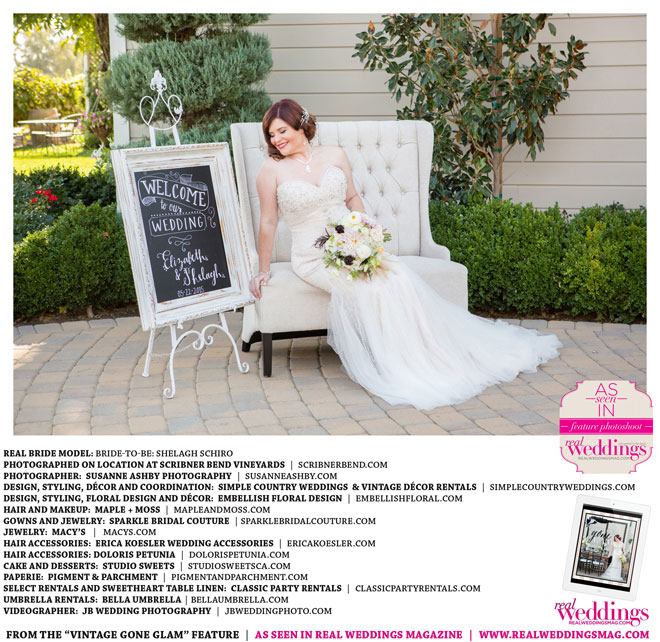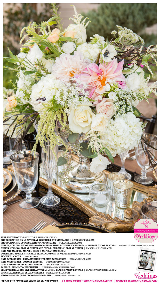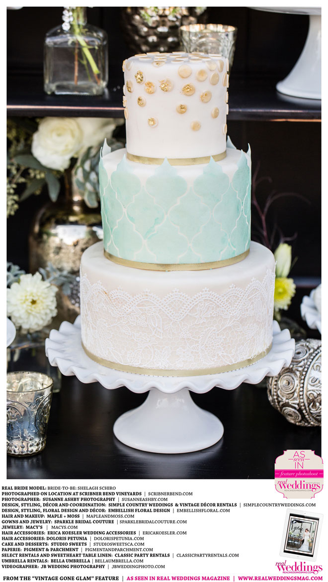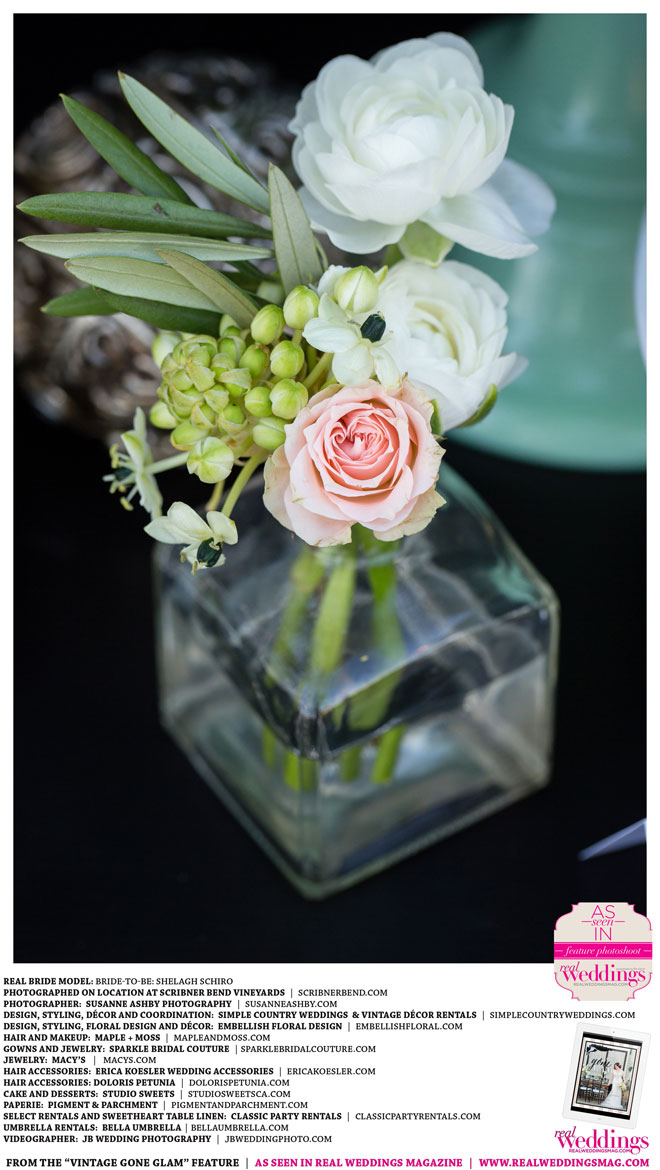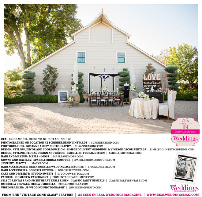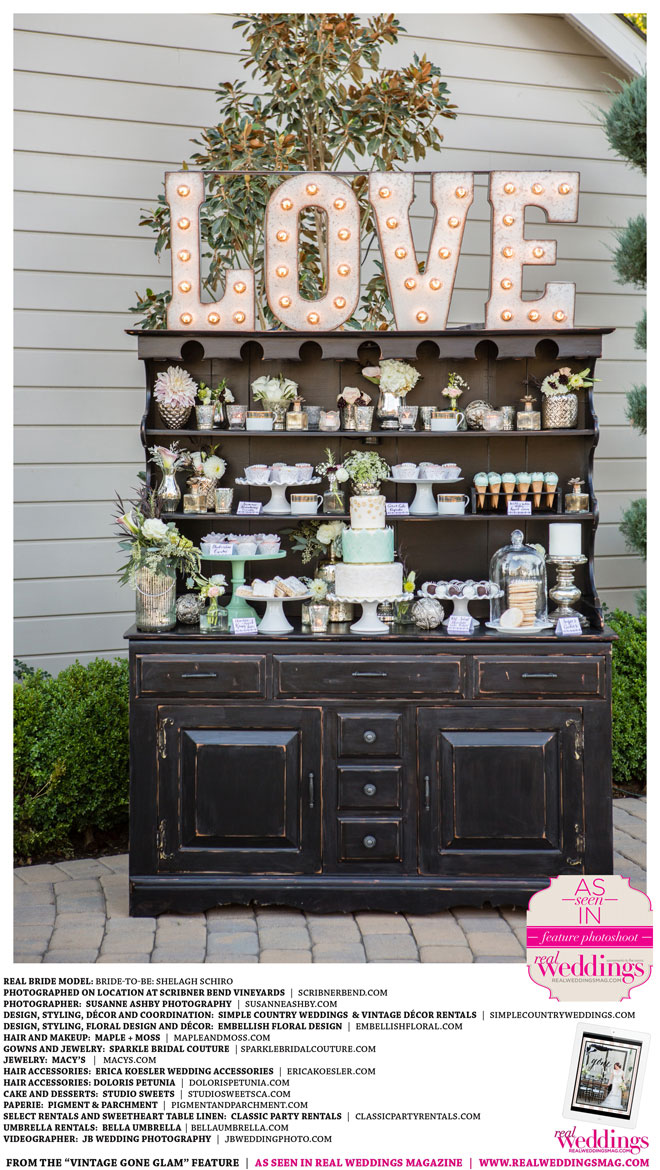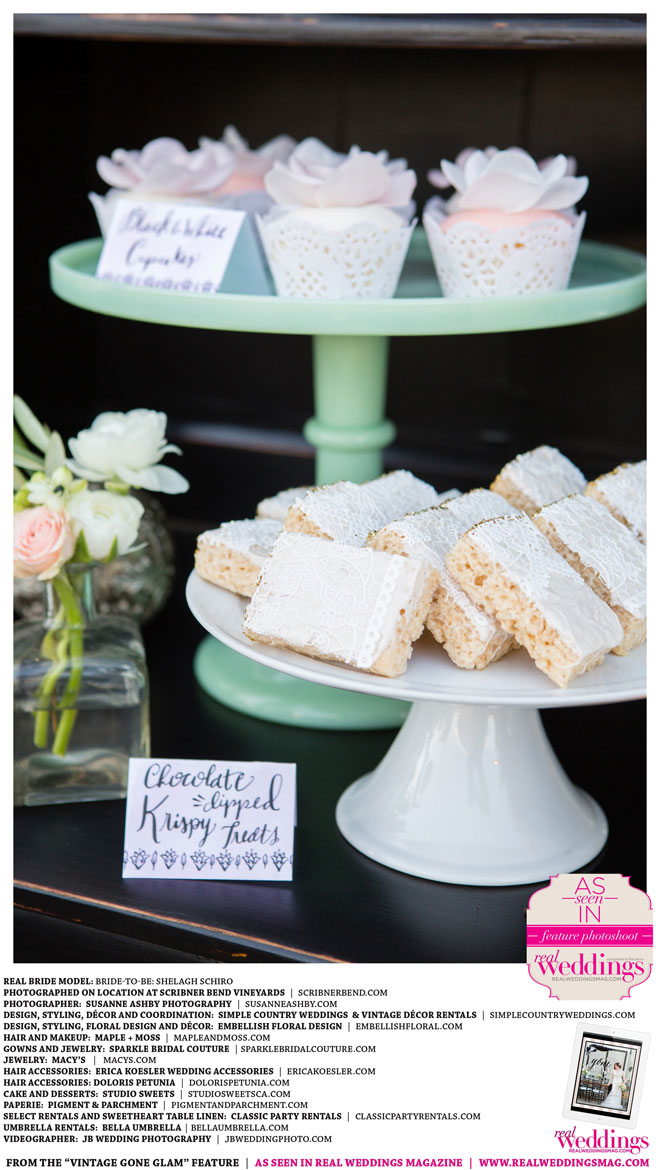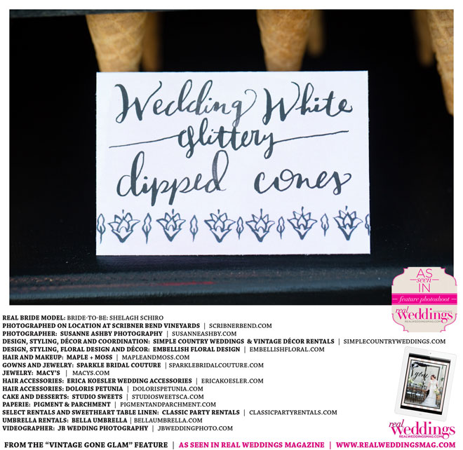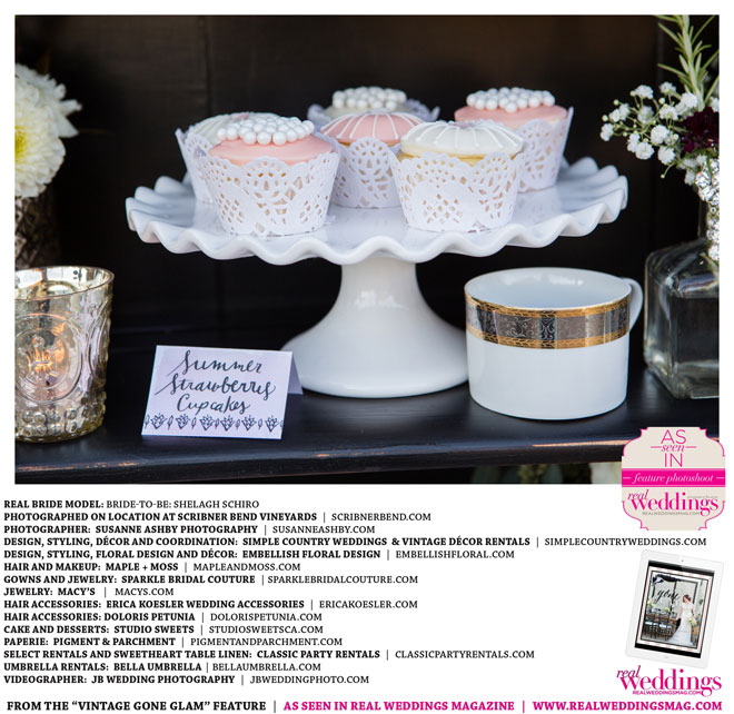 The “Vintage Gone Glam” feature was produced by Ramona Arnold-Simple Country Weddings & Vintage Decor Rentals, Emily Faso-Embellish Floral Design, Samantha Grippe-Studio Sweets, and Emily Peter and Wendy Sipple-Real Weddings Magazine.