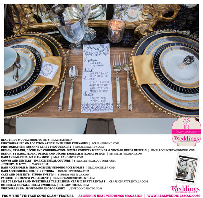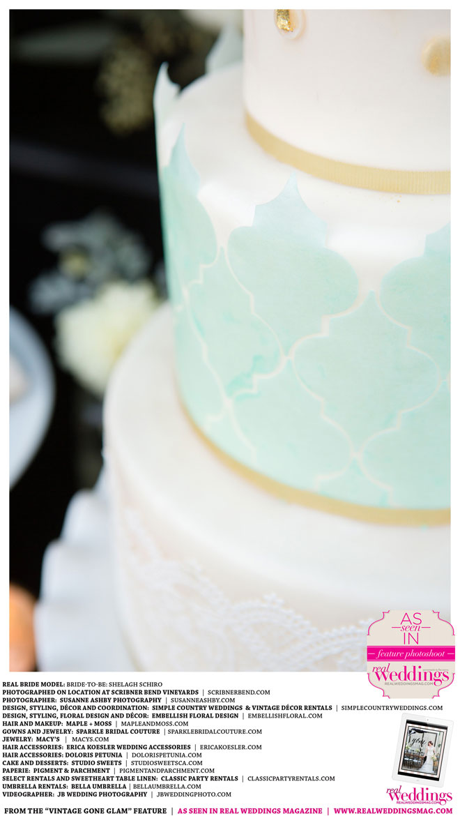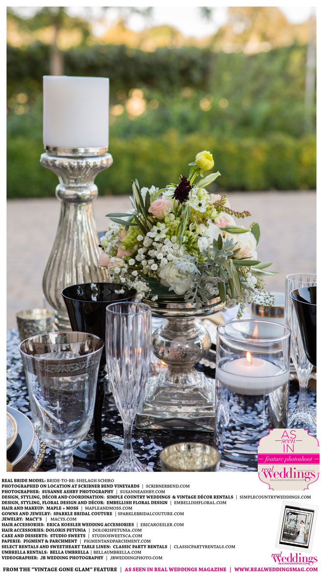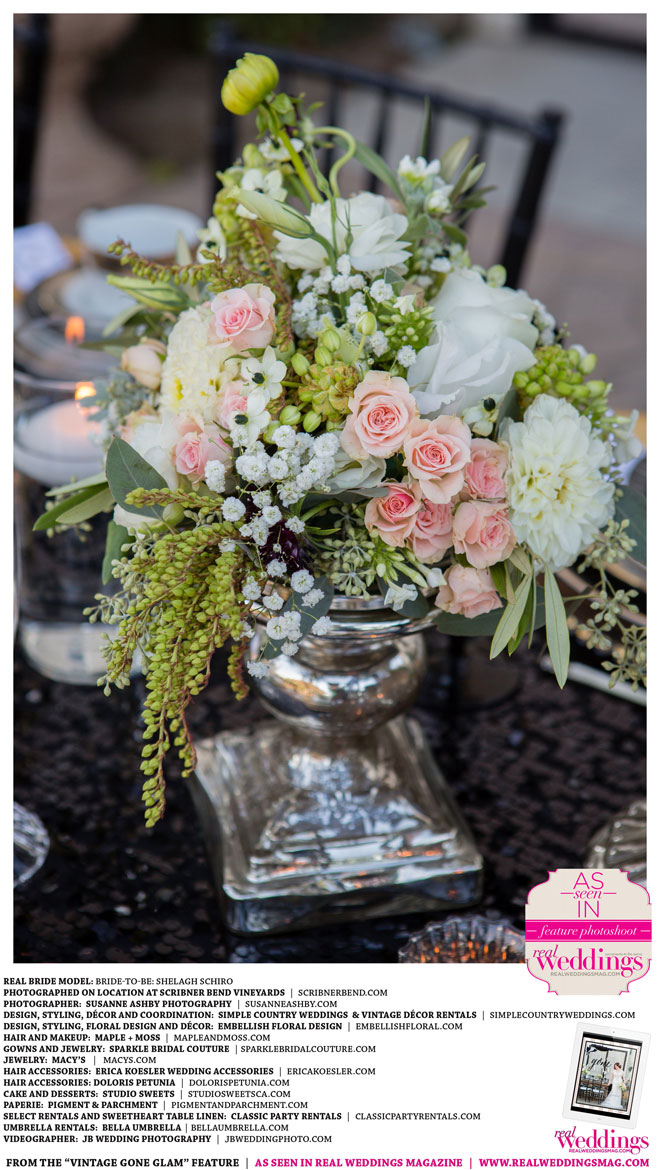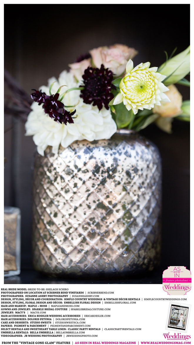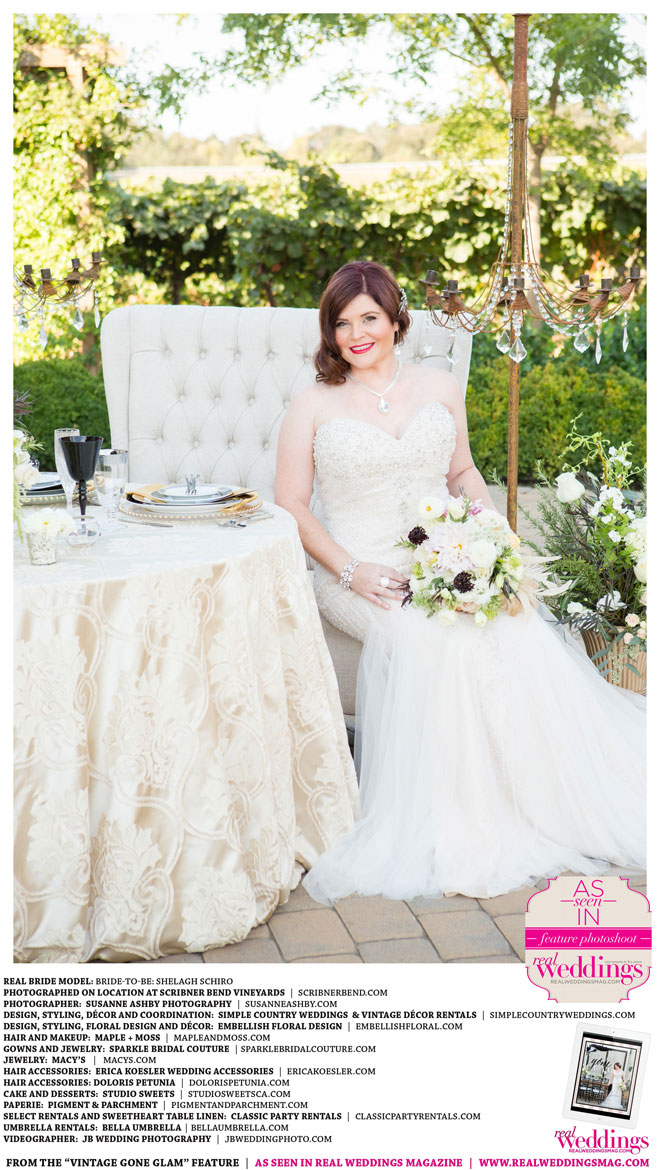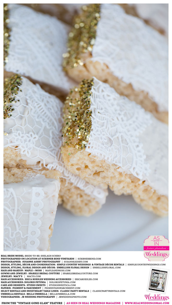 The “Vintage Gone Glam” feature was produced by Ramona Arnold-Simple Country Weddings & Vintage Decor Rentals, Emily Faso-Embellish Floral Design, Samantha Grippe-Studio Sweets, and Emily Peter and Wendy Sipple-Real Weddings Magazine.