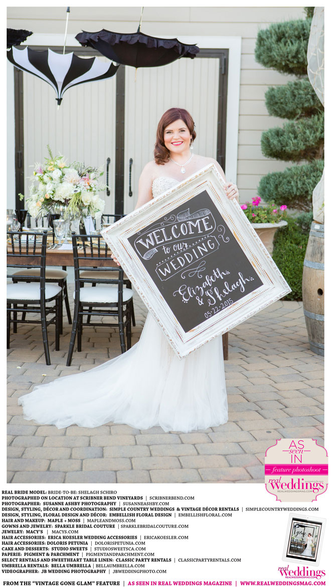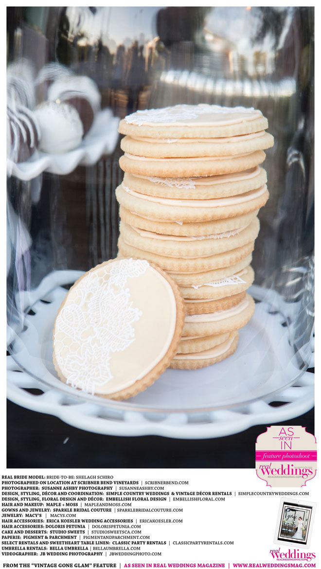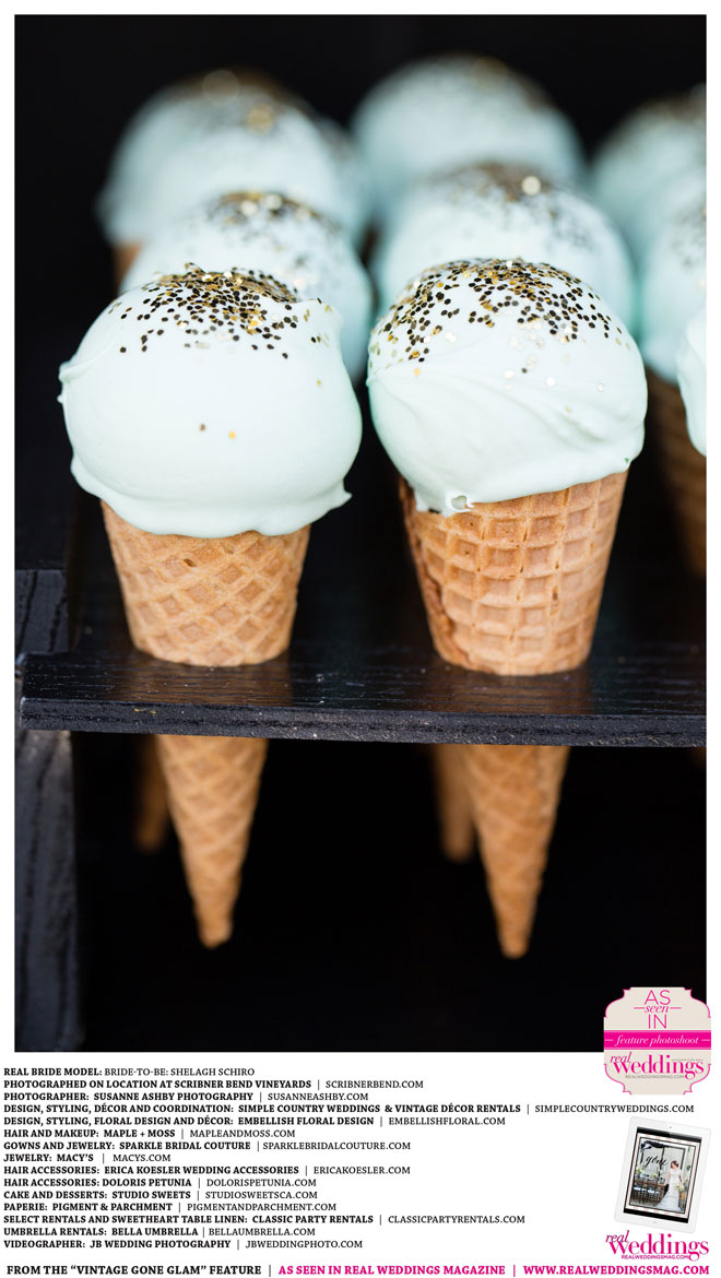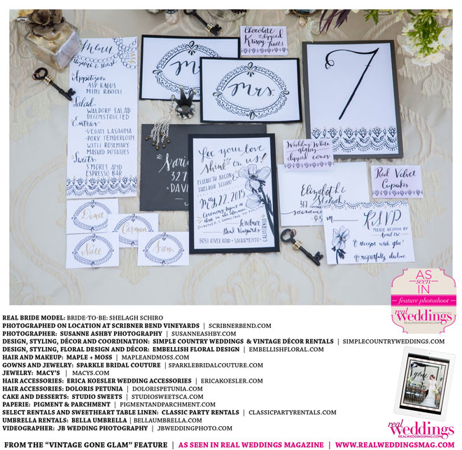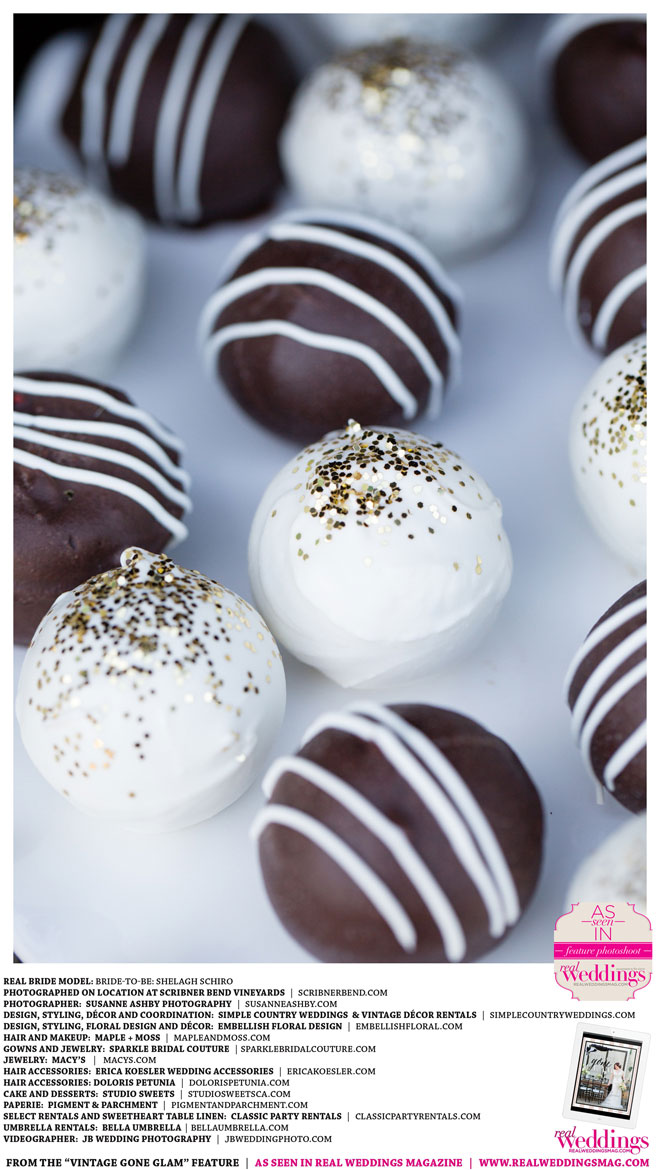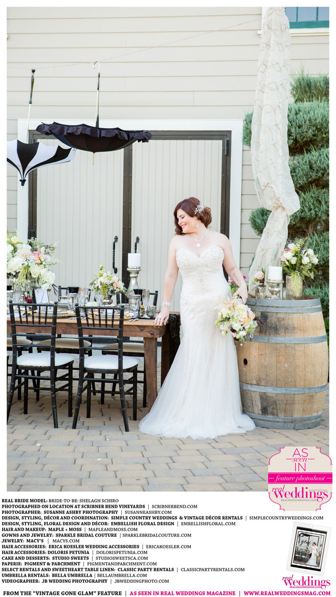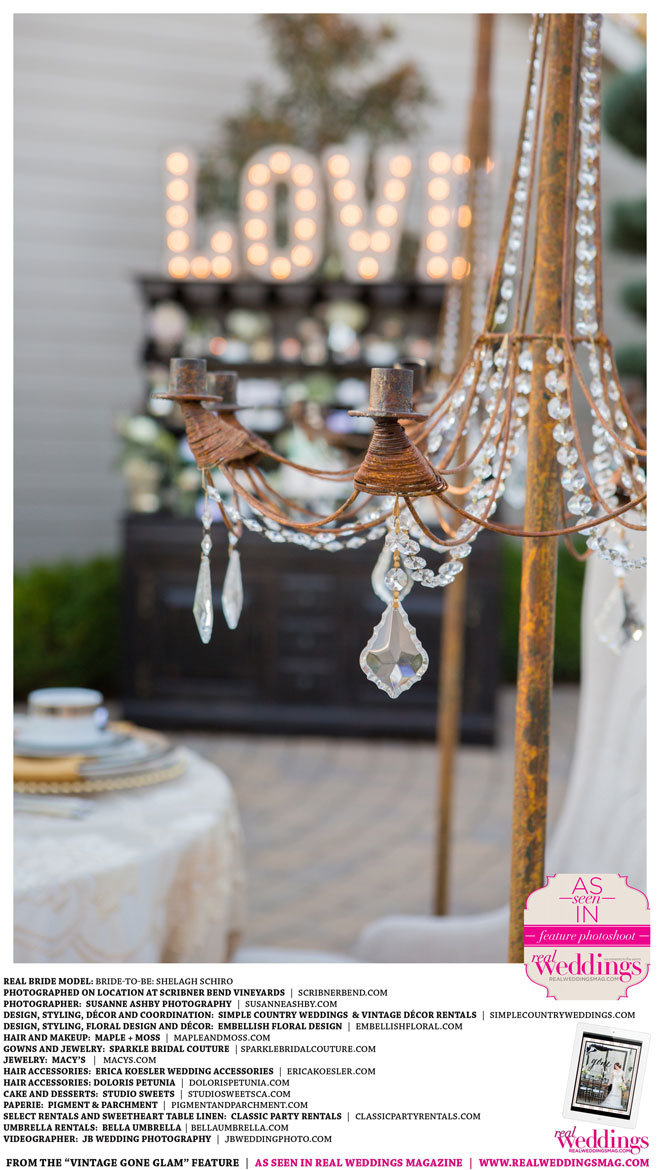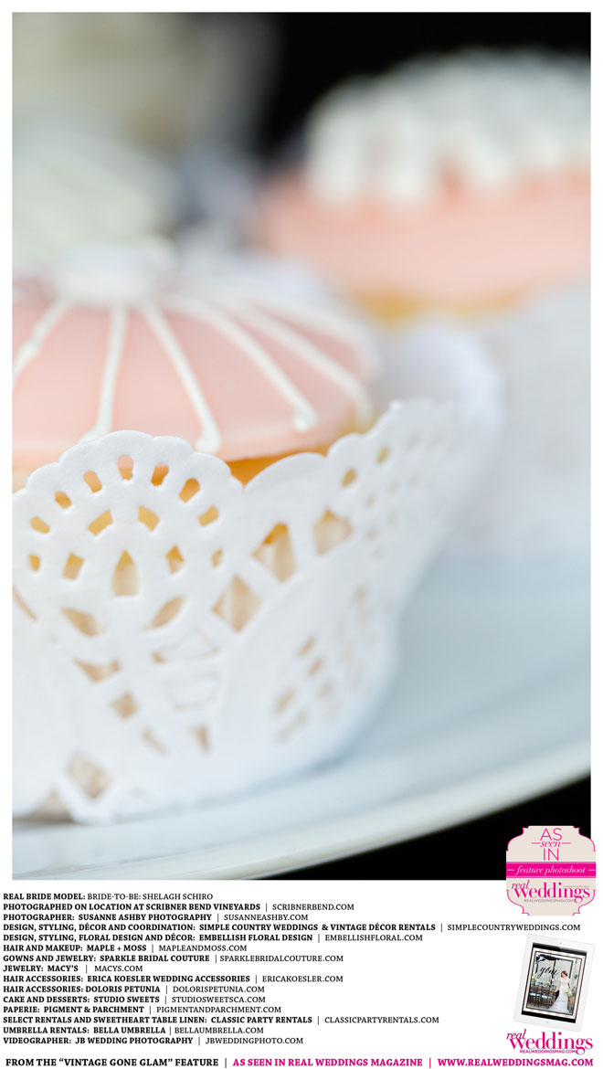 The “Vintage Gone Glam” feature was produced by Ramona Arnold-Simple Country Weddings & Vintage Decor Rentals, Emily Faso-Embellish Floral Design, Samantha Grippe-Studio Sweets, and Emily Peter and Wendy Sipple-Real Weddings Magazine.