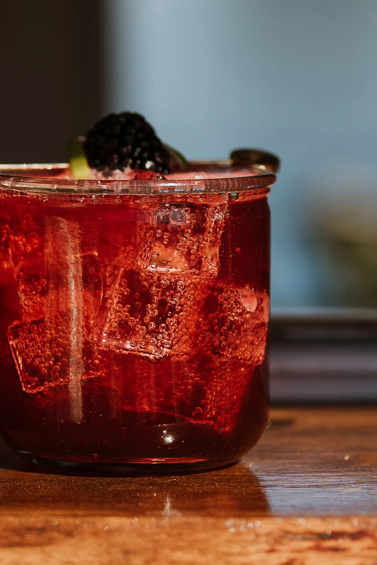 Add all ingredients to a cocktail shaker with ice and shake until chilled. Pour into rocks glass over ice. Garnish with lime wheel and blackberry.