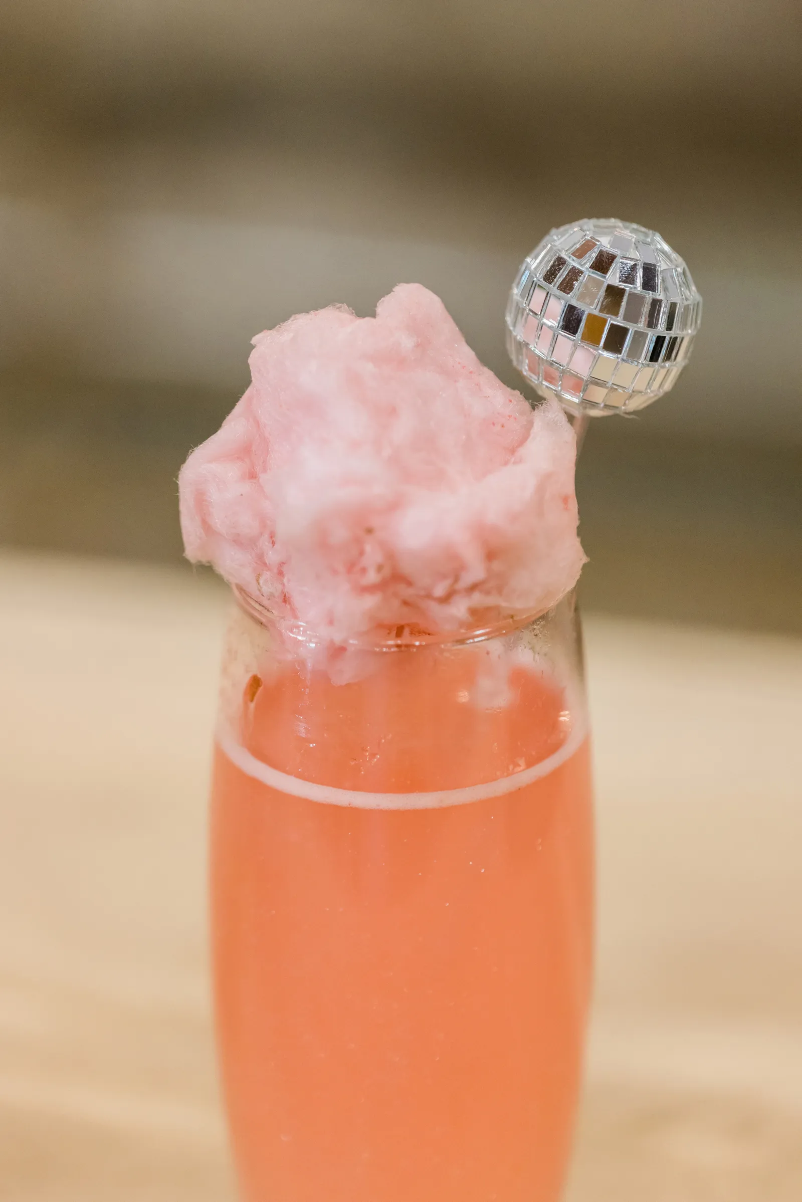 Add Prosecco and peach syrup to cocktail shaker and gently blend. Pour into stemless flute (or Champagne glass). Garnish with edible glitter and cotton candy.