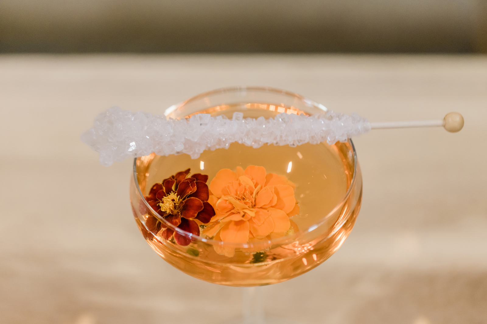 Add all ingredients to cocktail shaker with ice and shake. Pour into coupe glass. Garnish with edible floral and rock candy stick.