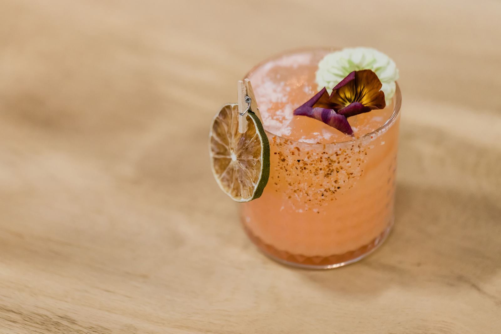 Add all ingredients to cocktail shaker with ice and shake. Pour into rocks glass. Garnish with dehydrated lime and edible floral.