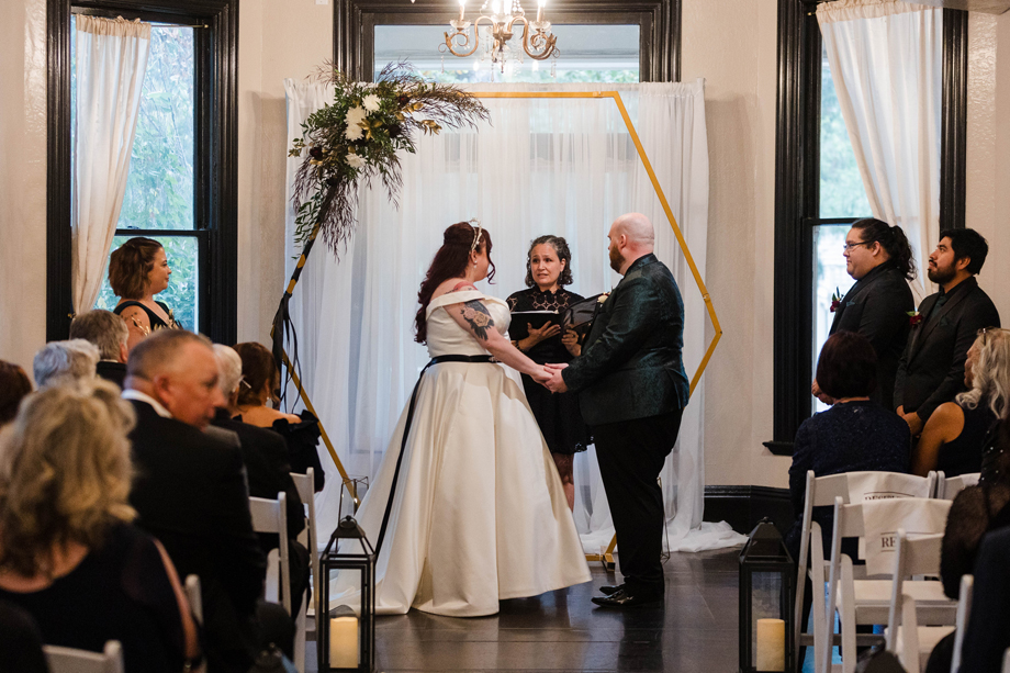 We love so many things about Emily + David’s wedding: her gown, her headpiece, his tux, the skulls, the table names, the cake, the donuts, the names of their signature drinks, the spooky and gothic elements, and just how unique it was.