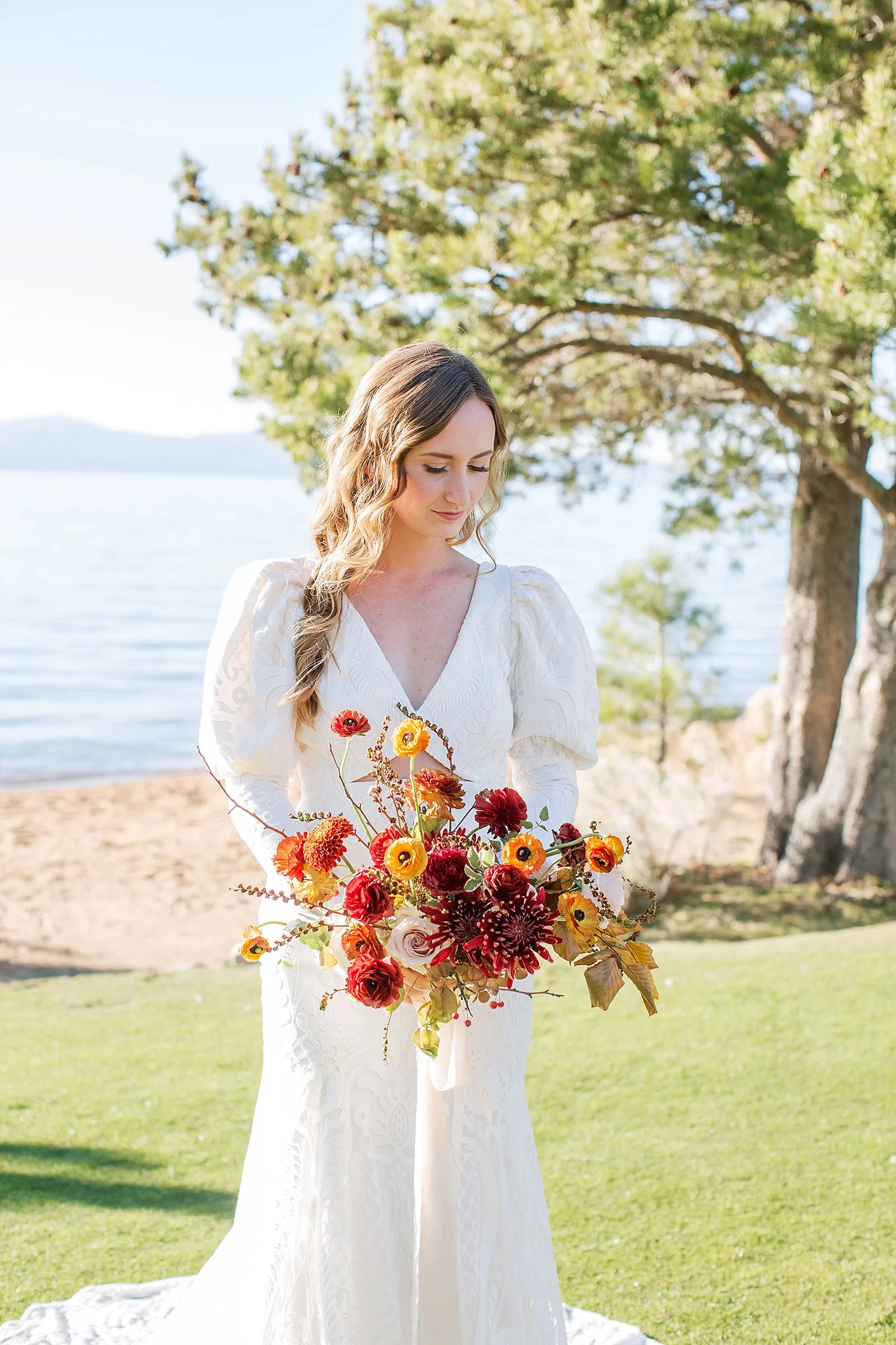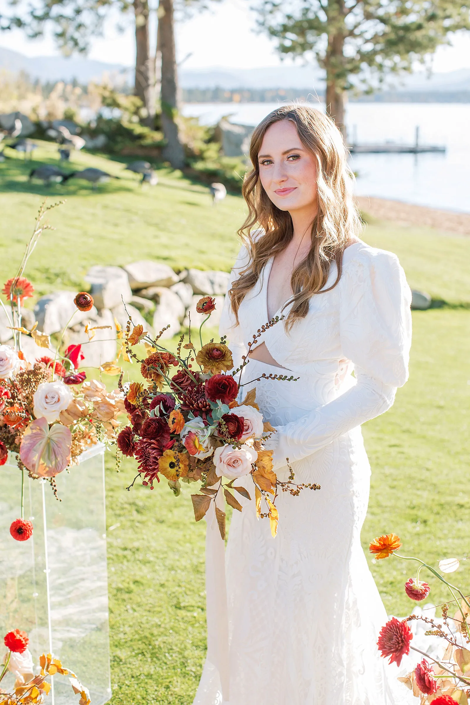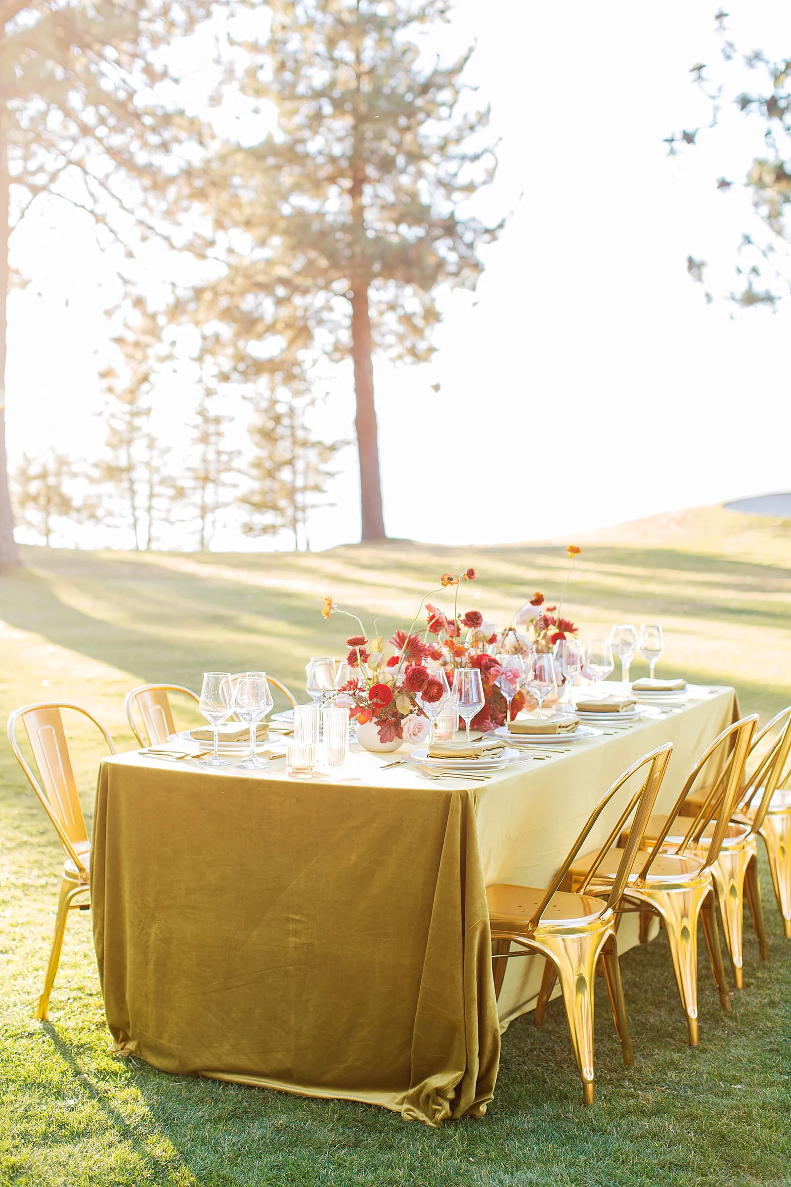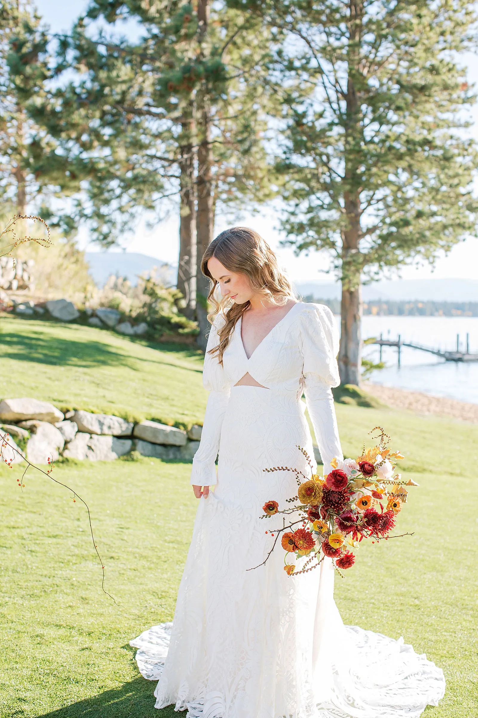 Lake Tahoe in the fall may have a chill in the air, but the colors in this styled shoot will certainly warm you up! The red florals, mustard yellow linens and gold (yes, GOLD!) chairs combine to create an incredibly inviting space. Plus, that dress; the lace, the sleeves, the cutouts; is to die for!