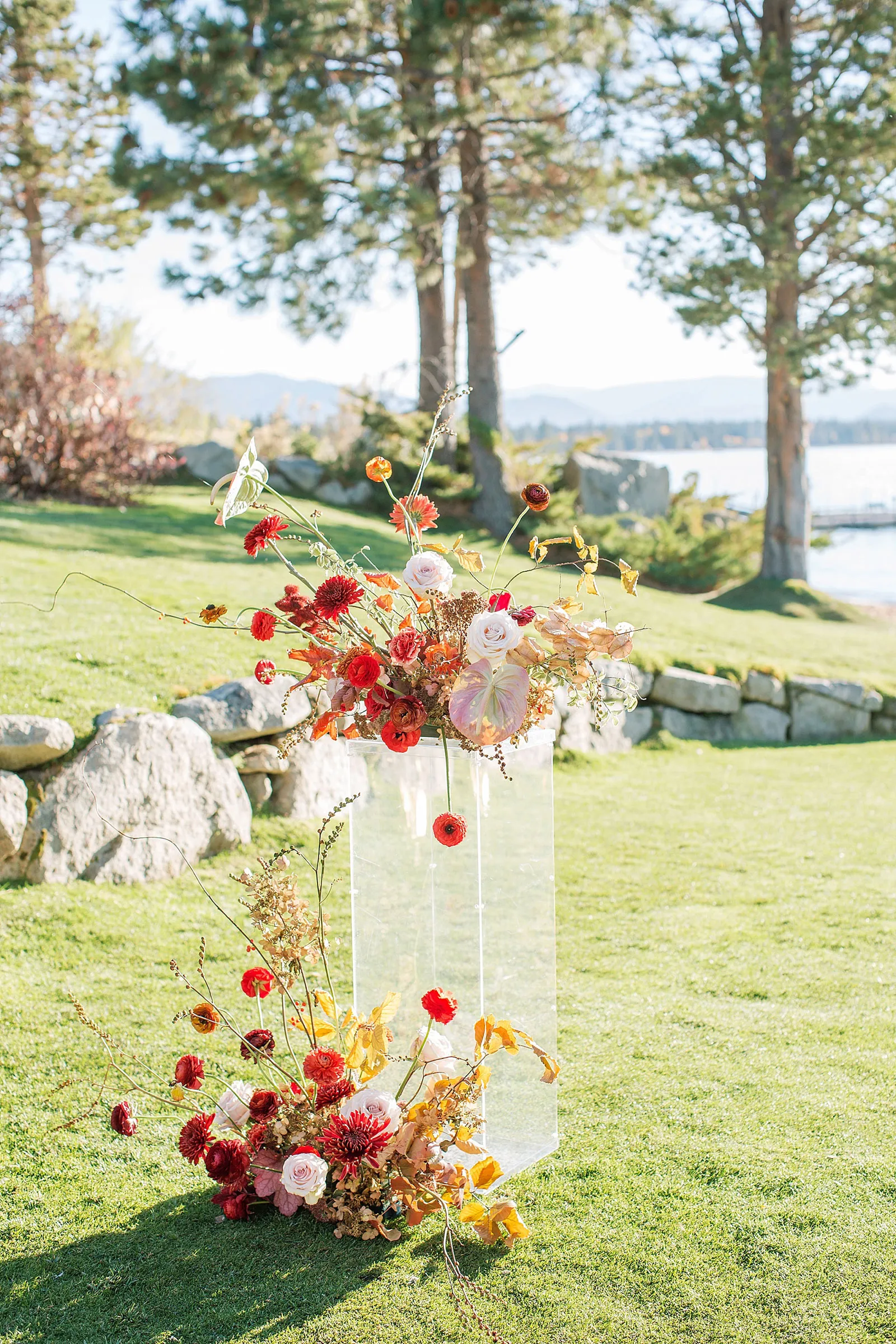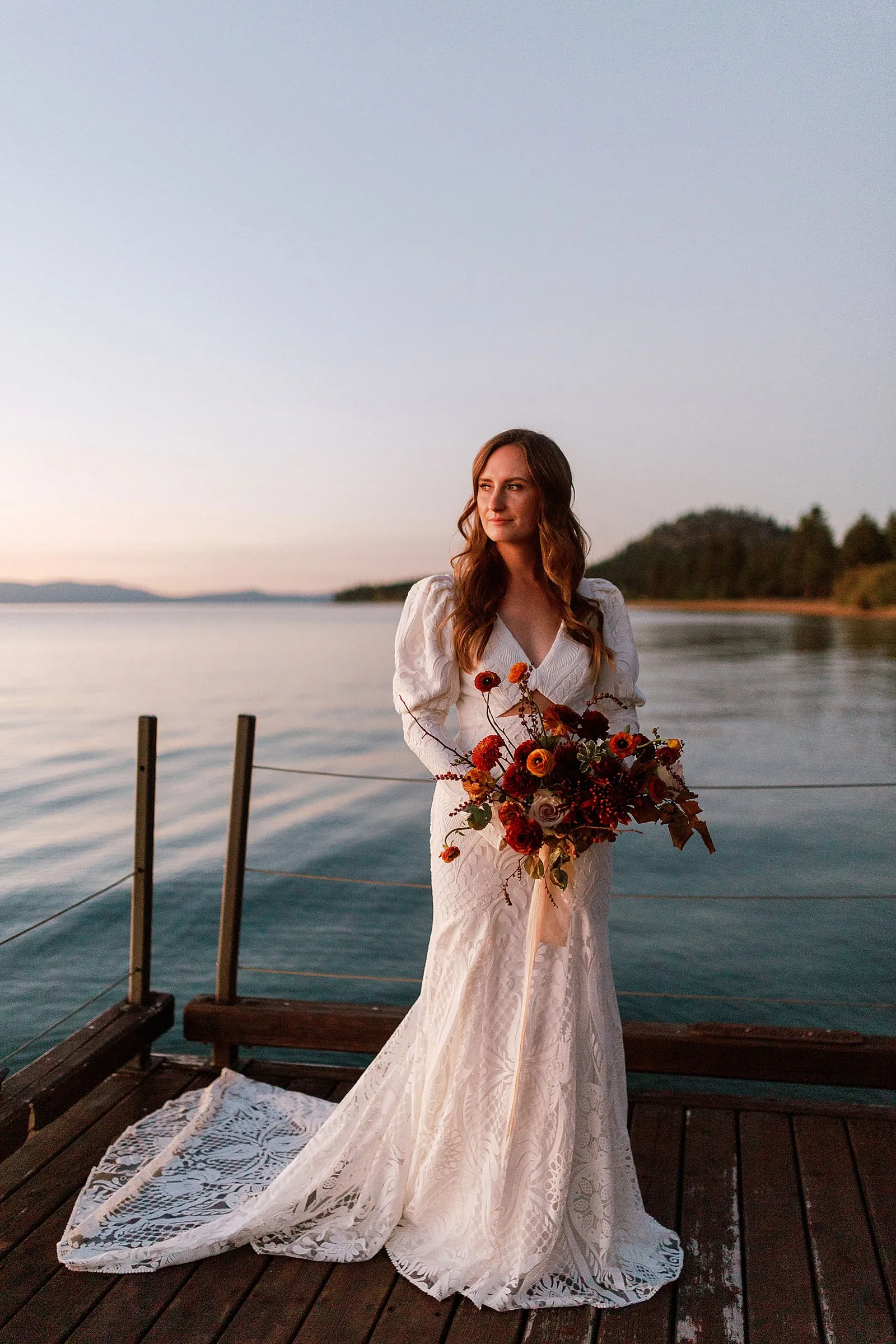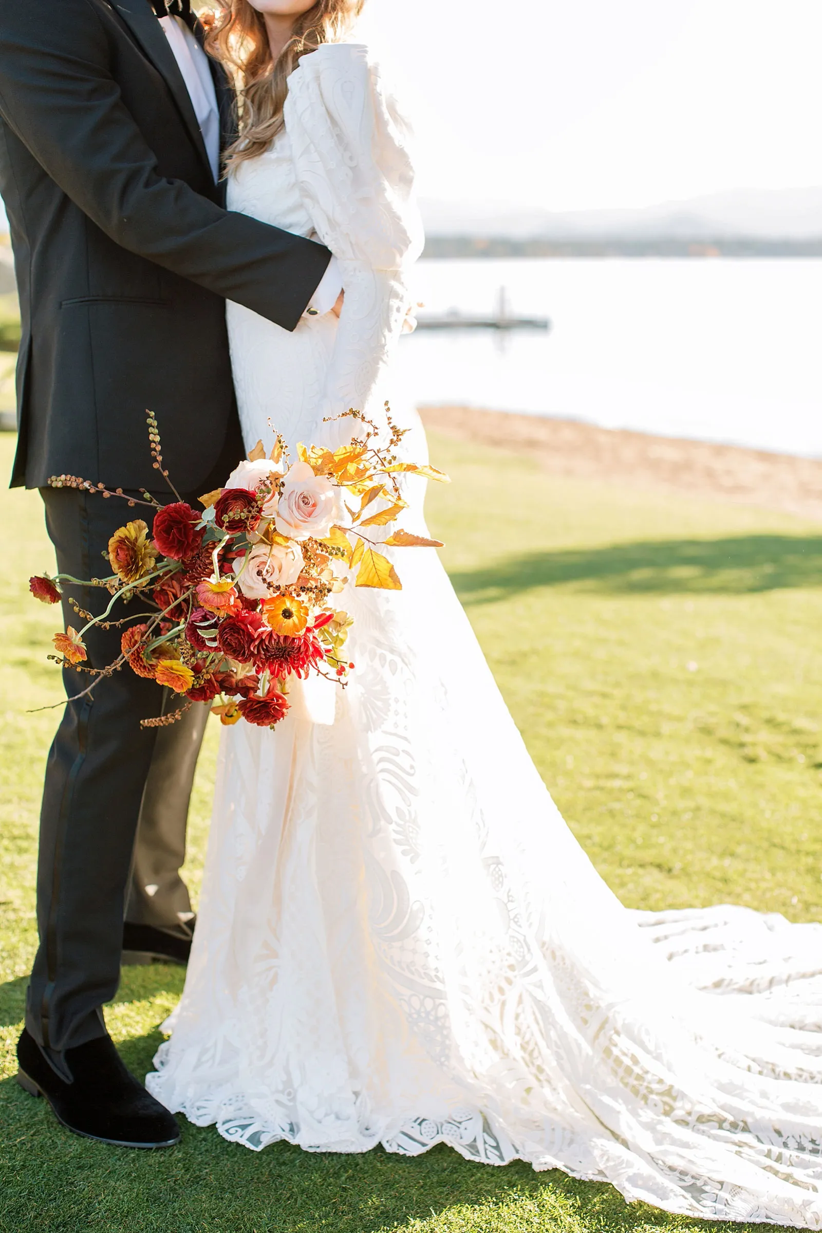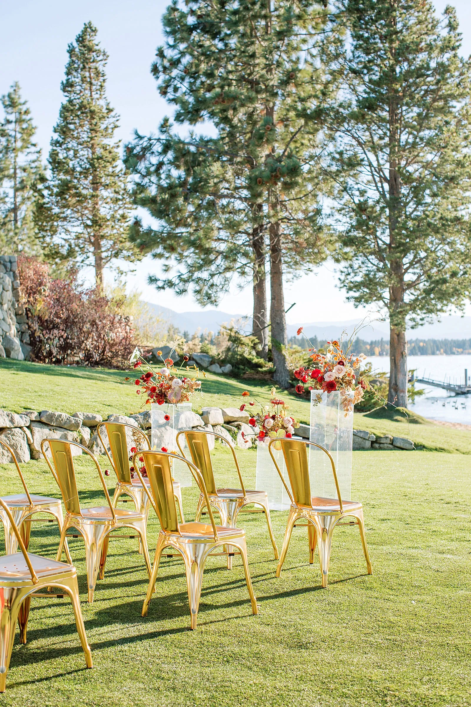 Lake Tahoe in the fall may have a chill in the air, but the colors in this styled shoot will certainly warm you up! The red florals, mustard yellow linens and gold (yes, GOLD!) chairs combine to create an incredibly inviting space. Plus, that dress; the lace, the sleeves, the cutouts; is to die for!