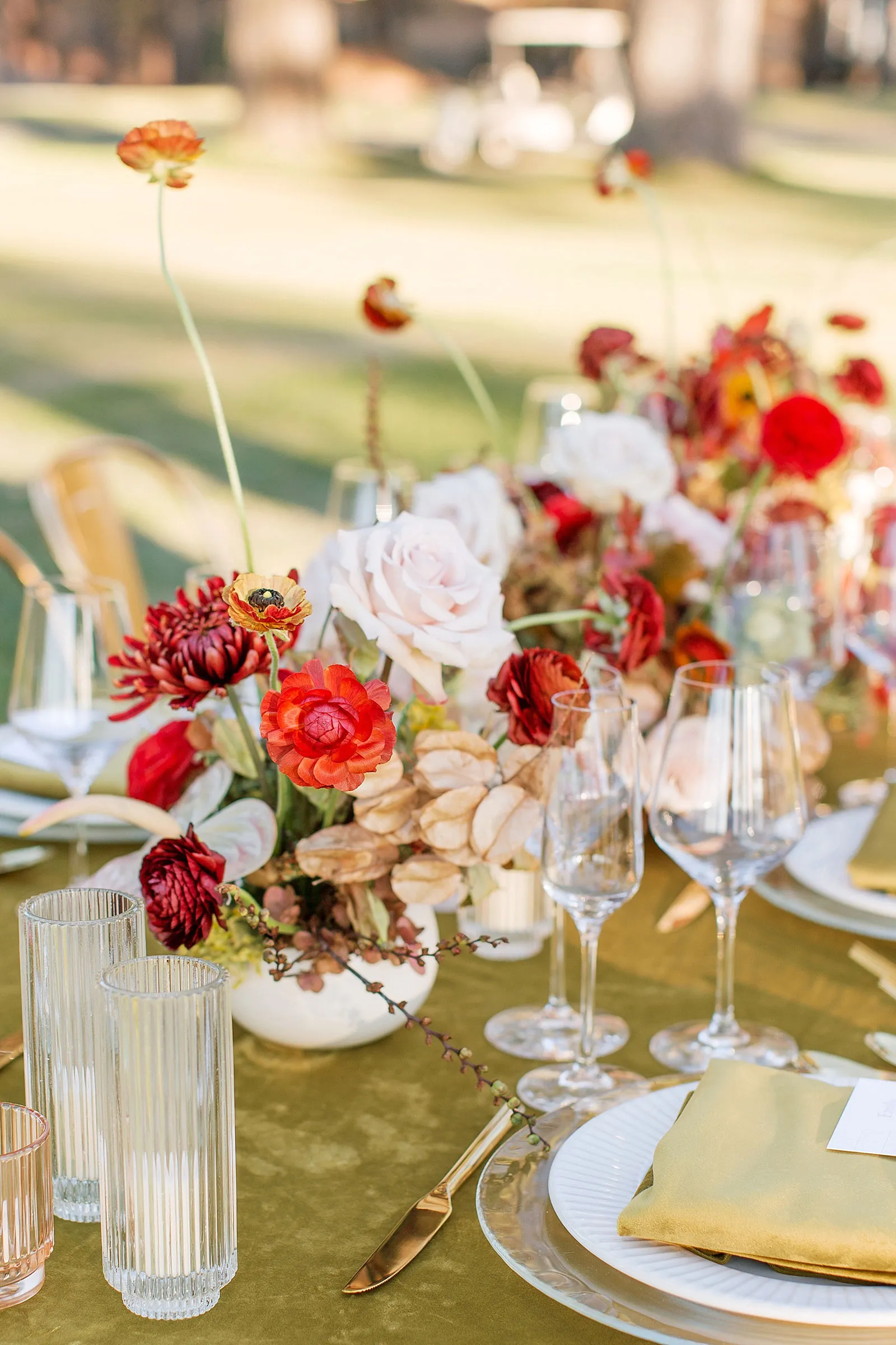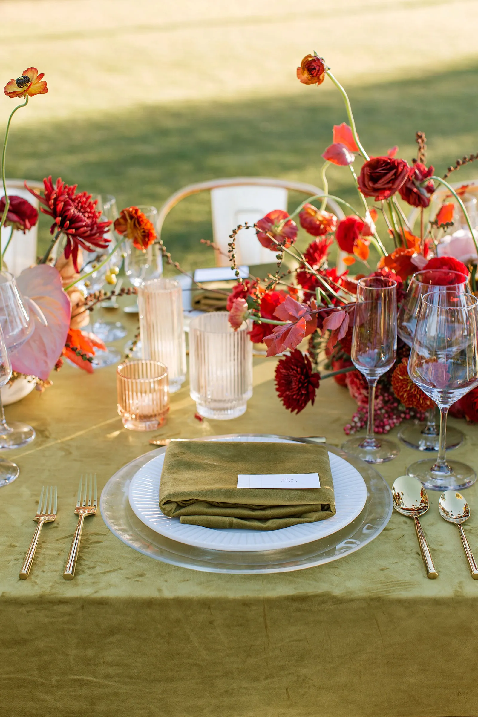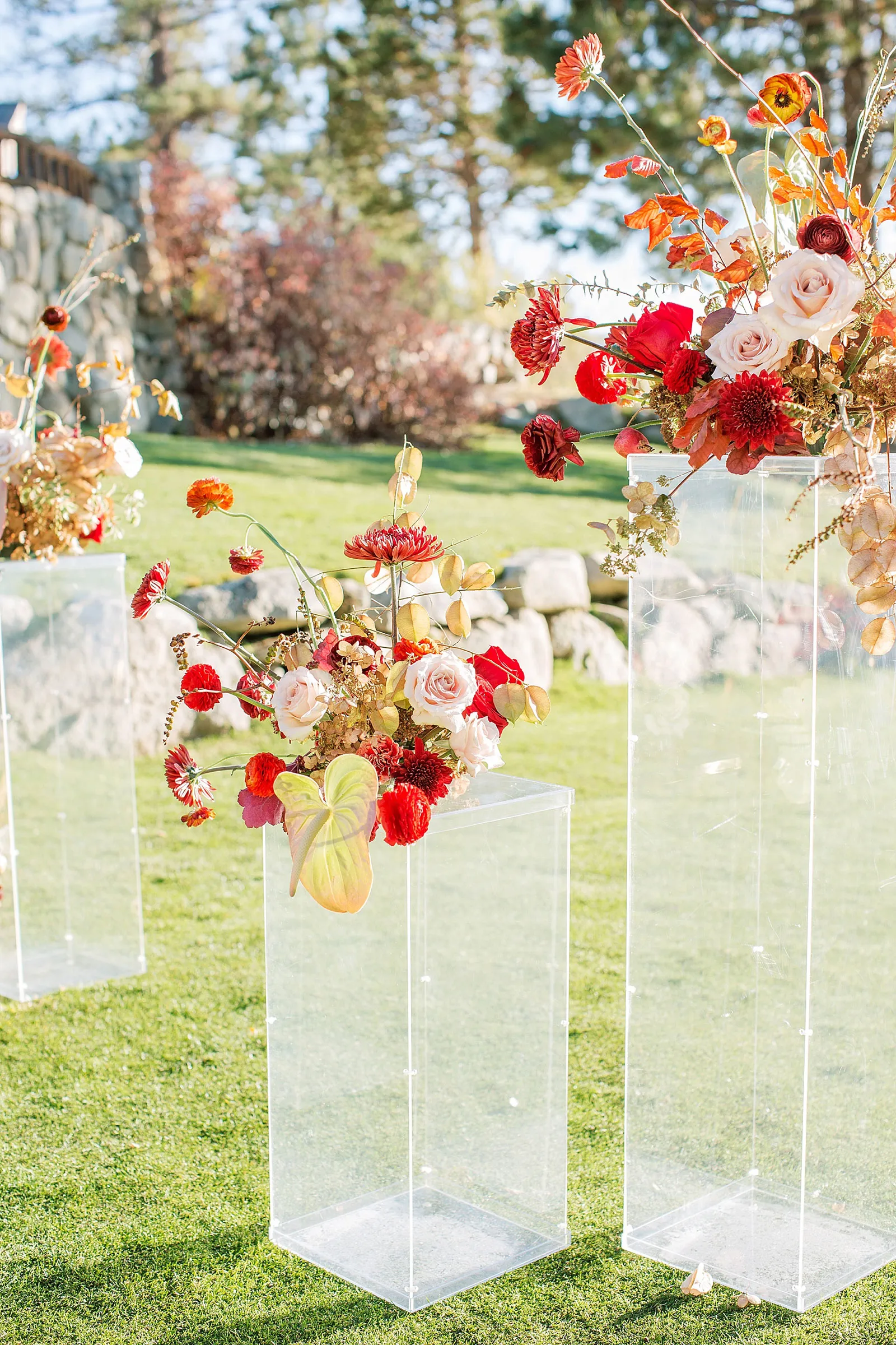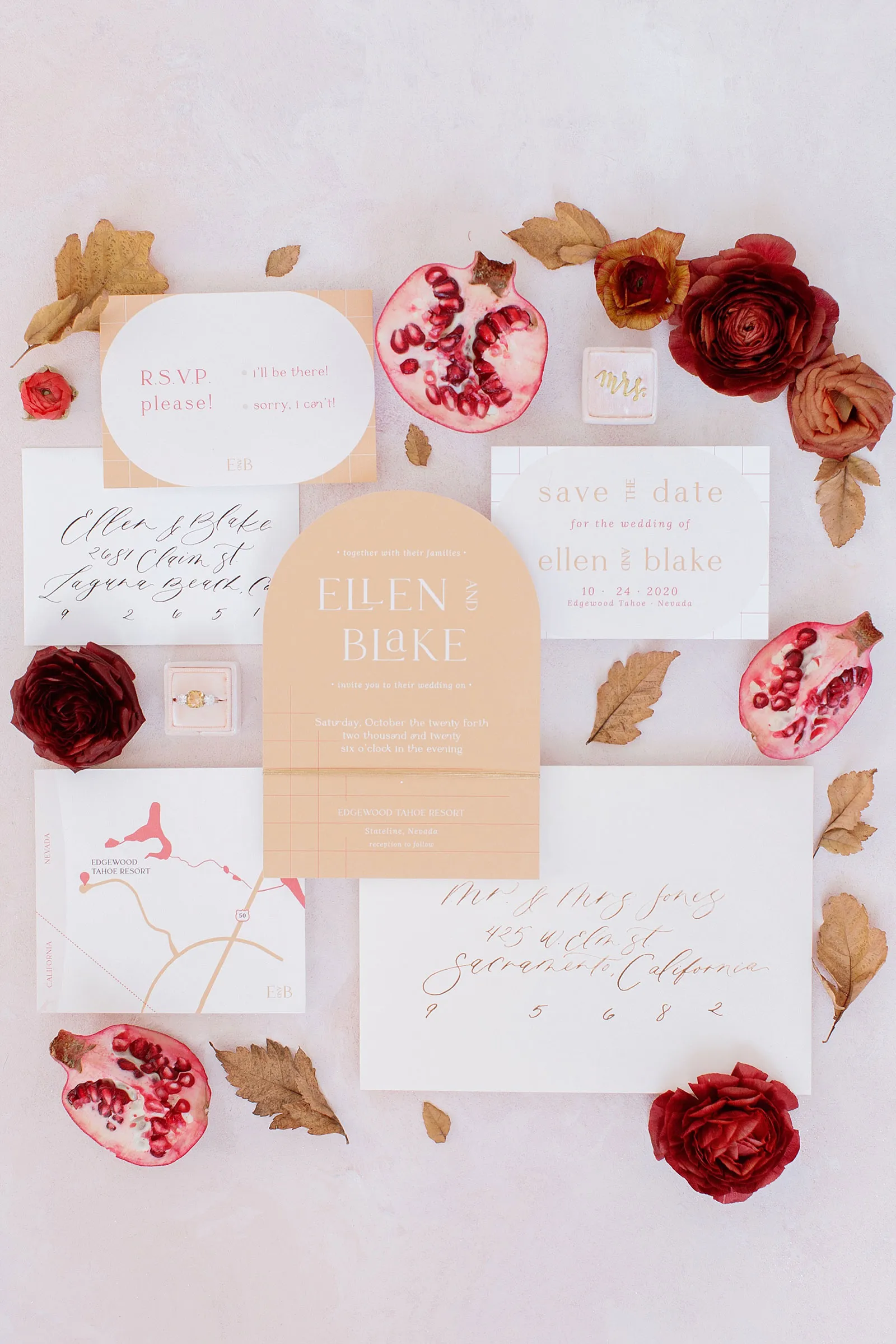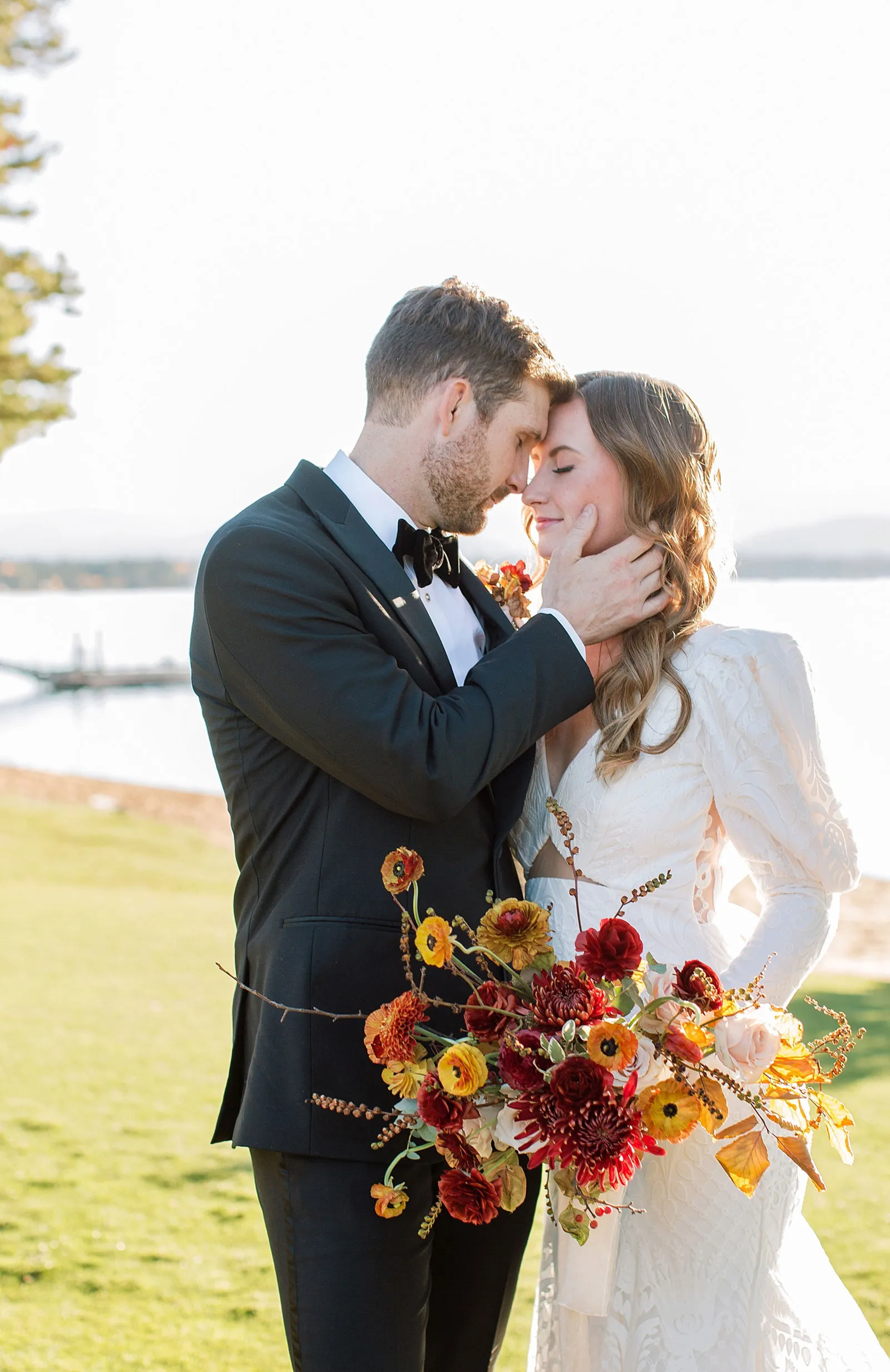 Lake Tahoe in the fall may have a chill in the air, but the colors in this styled shoot will certainly warm you up! The red florals, mustard yellow linens and gold (yes, GOLD!) chairs combine to create an incredibly inviting space. Plus, that dress; the lace, the sleeves, the cutouts; is to die for!