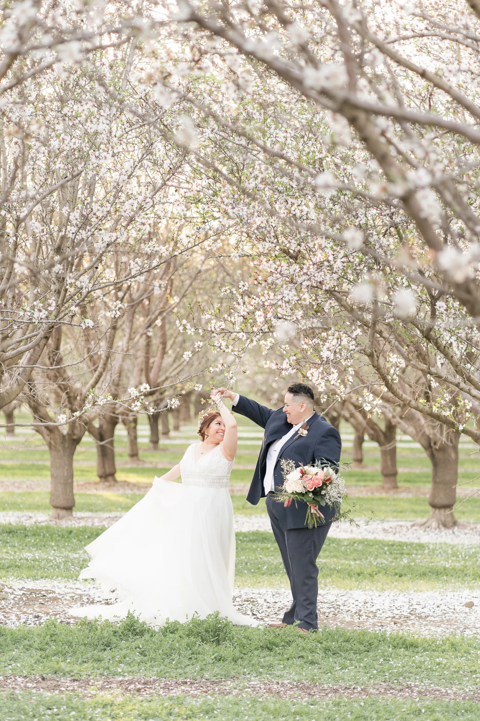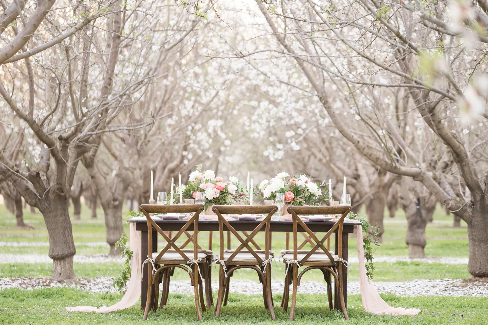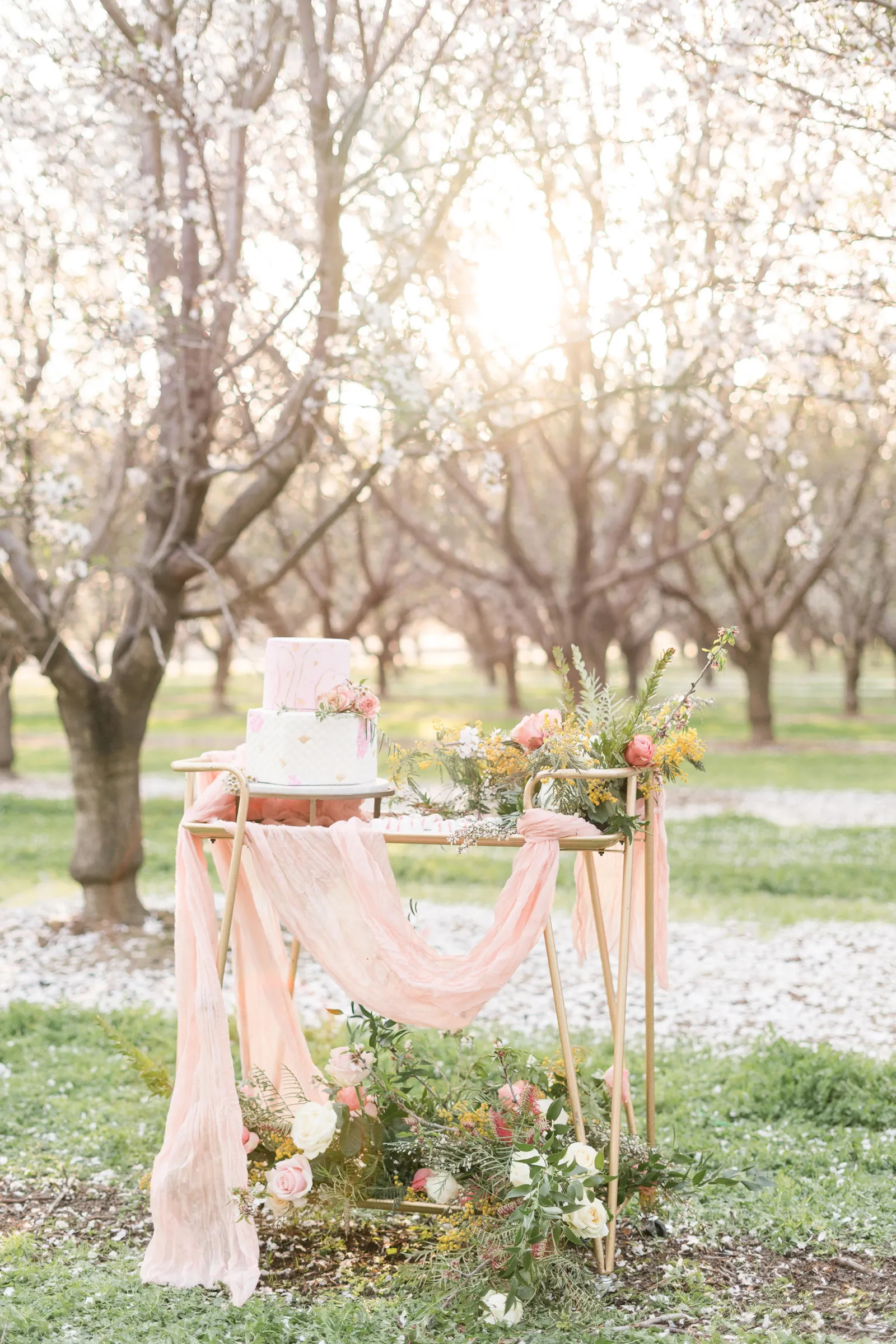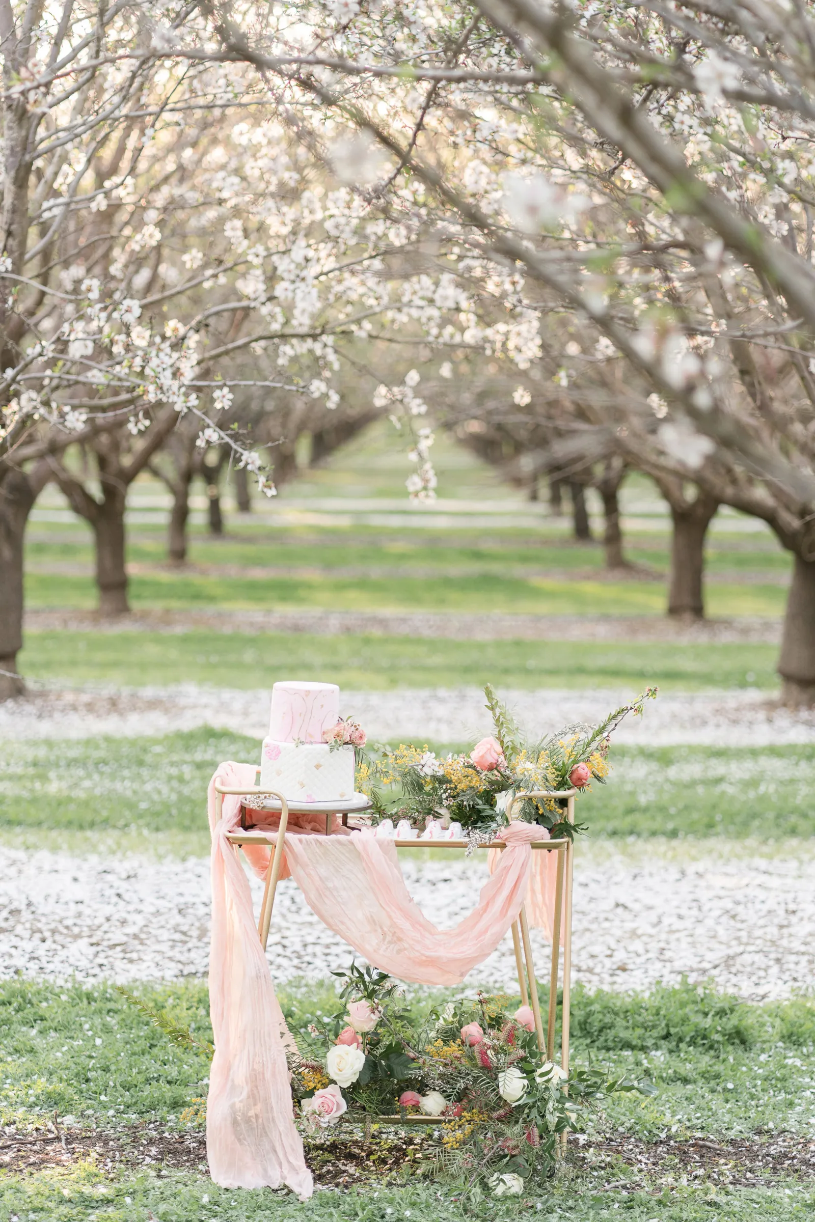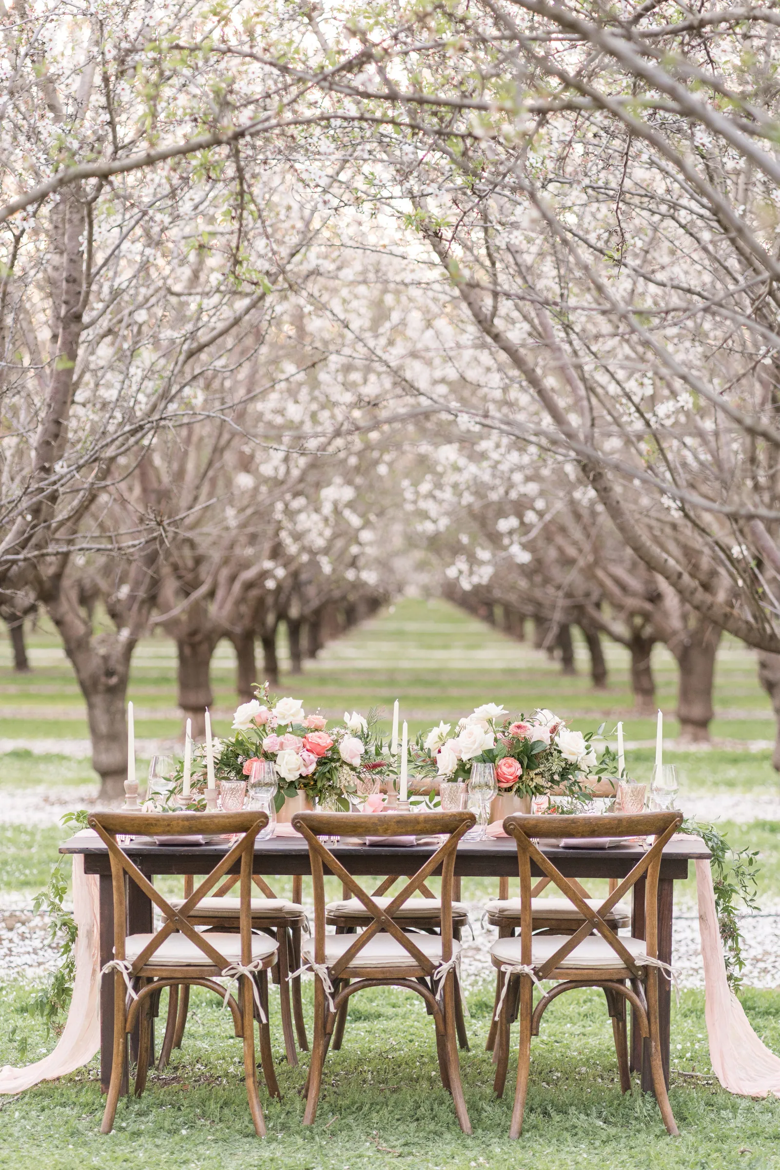 Every year, Almond trees start to blossom in mid- to late-February for a few short weeks—and they often provide a romantic backdrop to photo shoots. And this beauty from an amazing group of creatives is no different! We gave you just a peek at this lovely shoot in the Summer/Fall 2022 issue on newsstands now, but we promised you more from this #RWSubmittedStyledShoot, so here you are…enjoy!