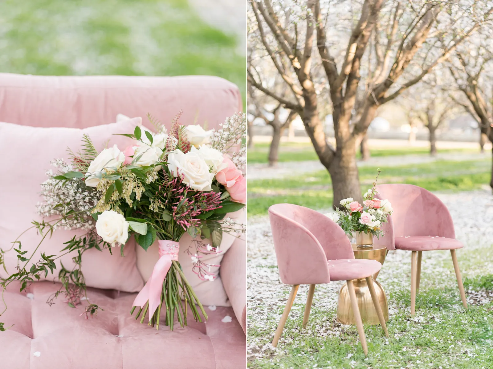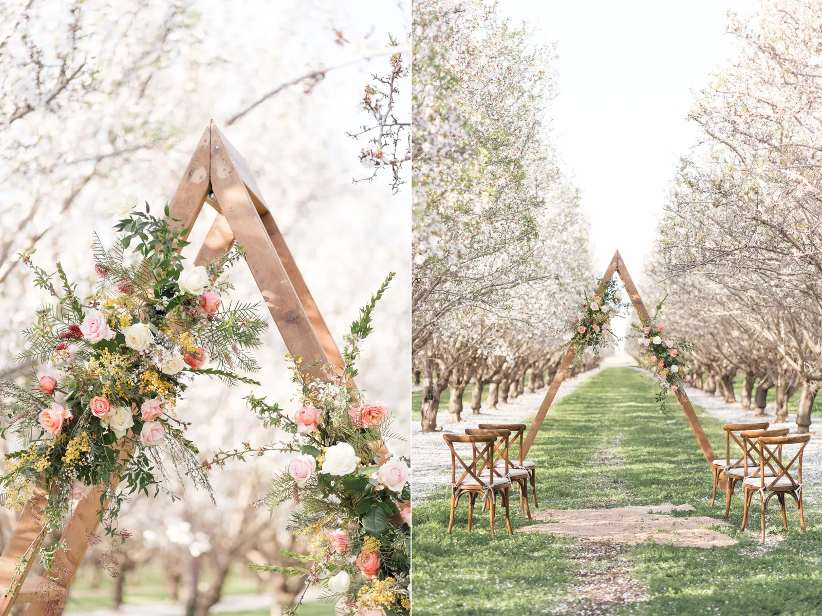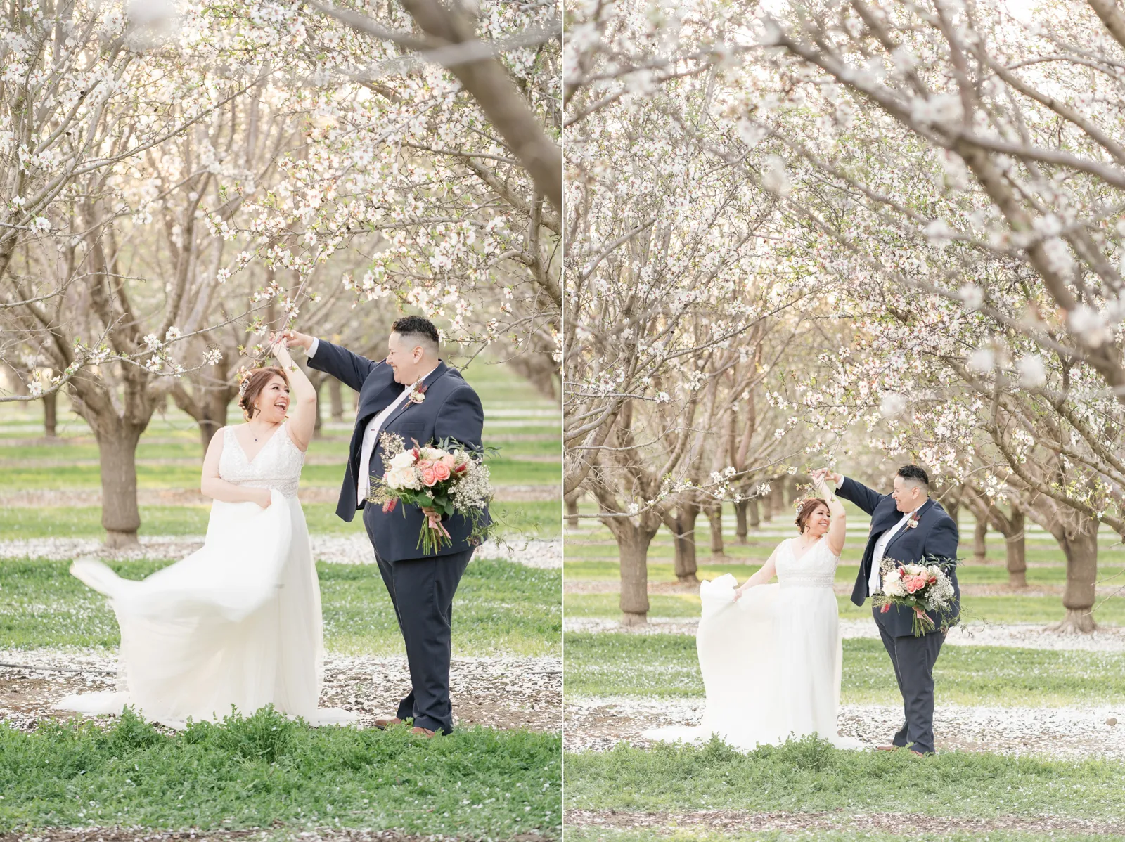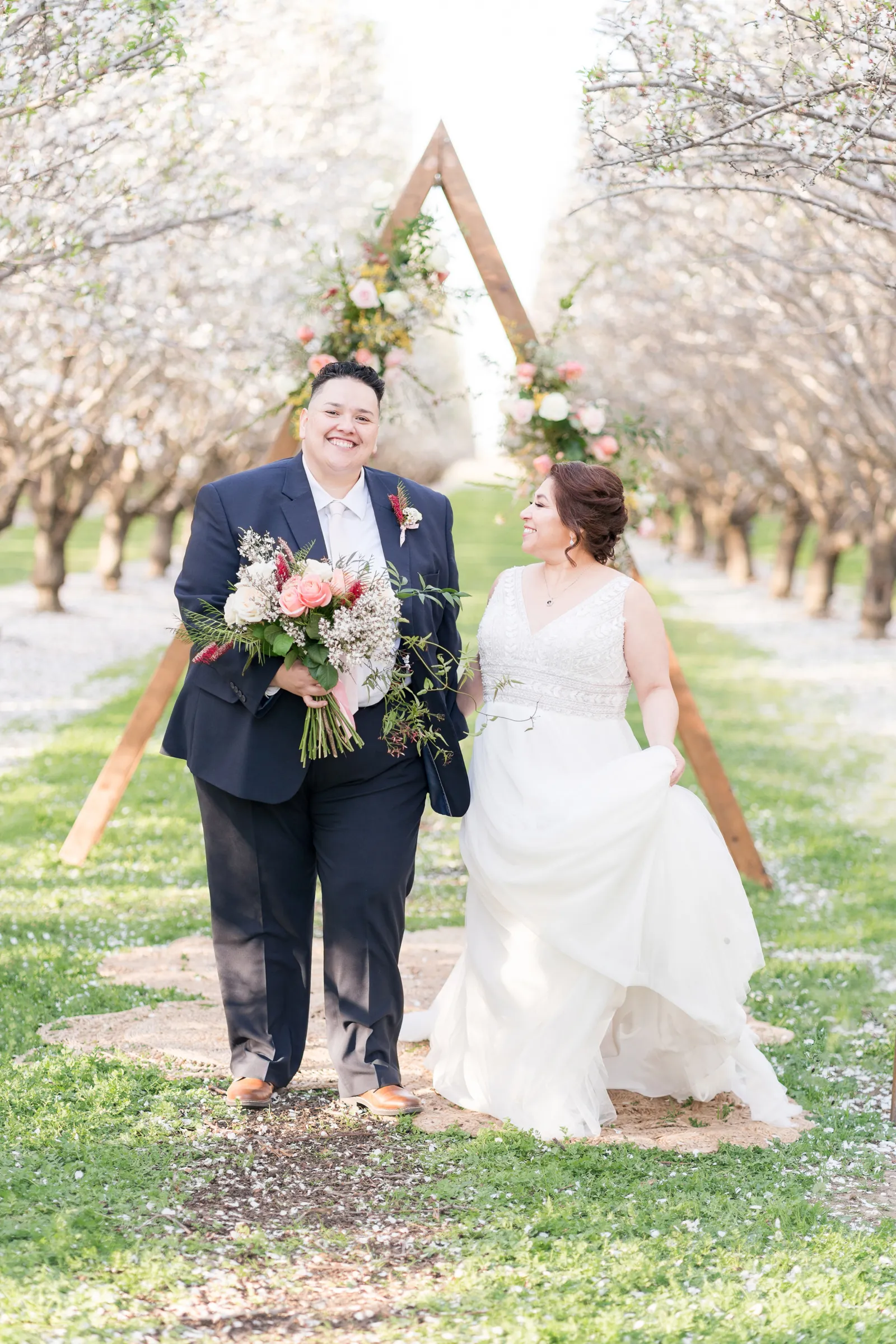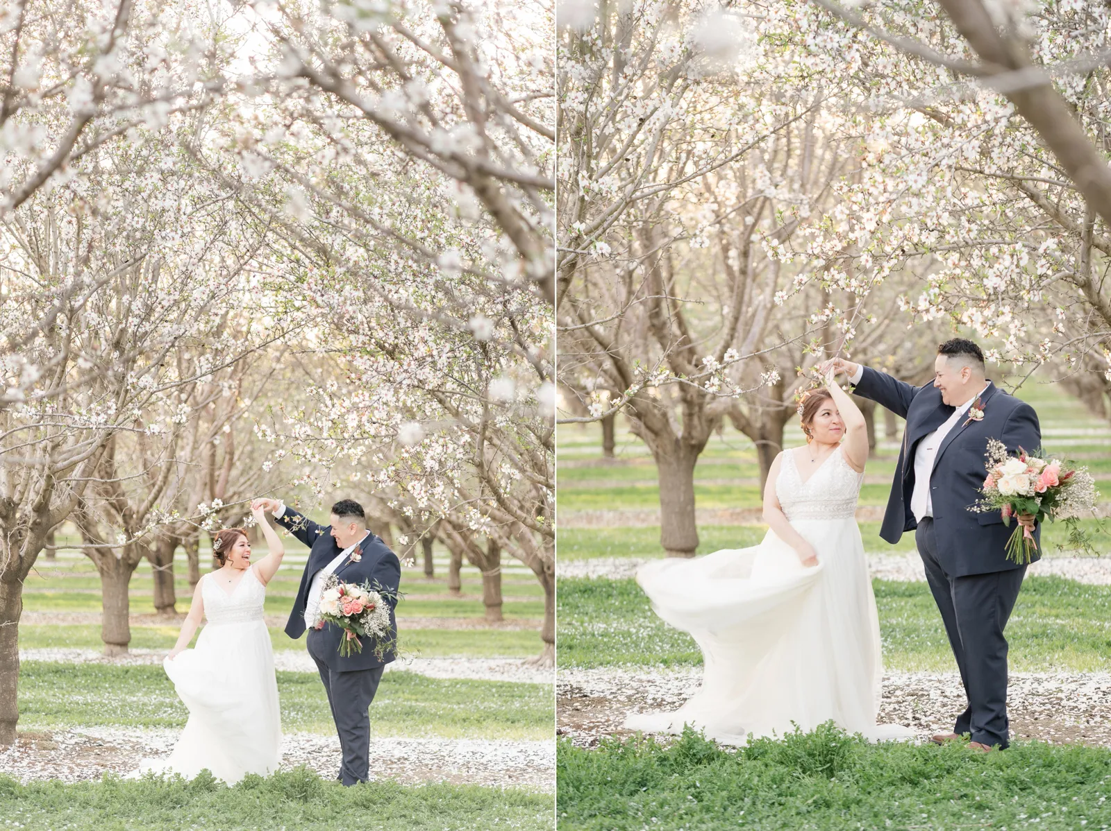 Every year, Almond trees start to blossom in mid- to late-February for a few short weeks—and they often provide a romantic backdrop to photo shoots. And this beauty from an amazing group of creatives is no different! We gave you just a peek at this lovely shoot in the Summer/Fall 2022 issue on newsstands now, but we promised you more from this #RWSubmittedStyledShoot, so here you are…enjoy!