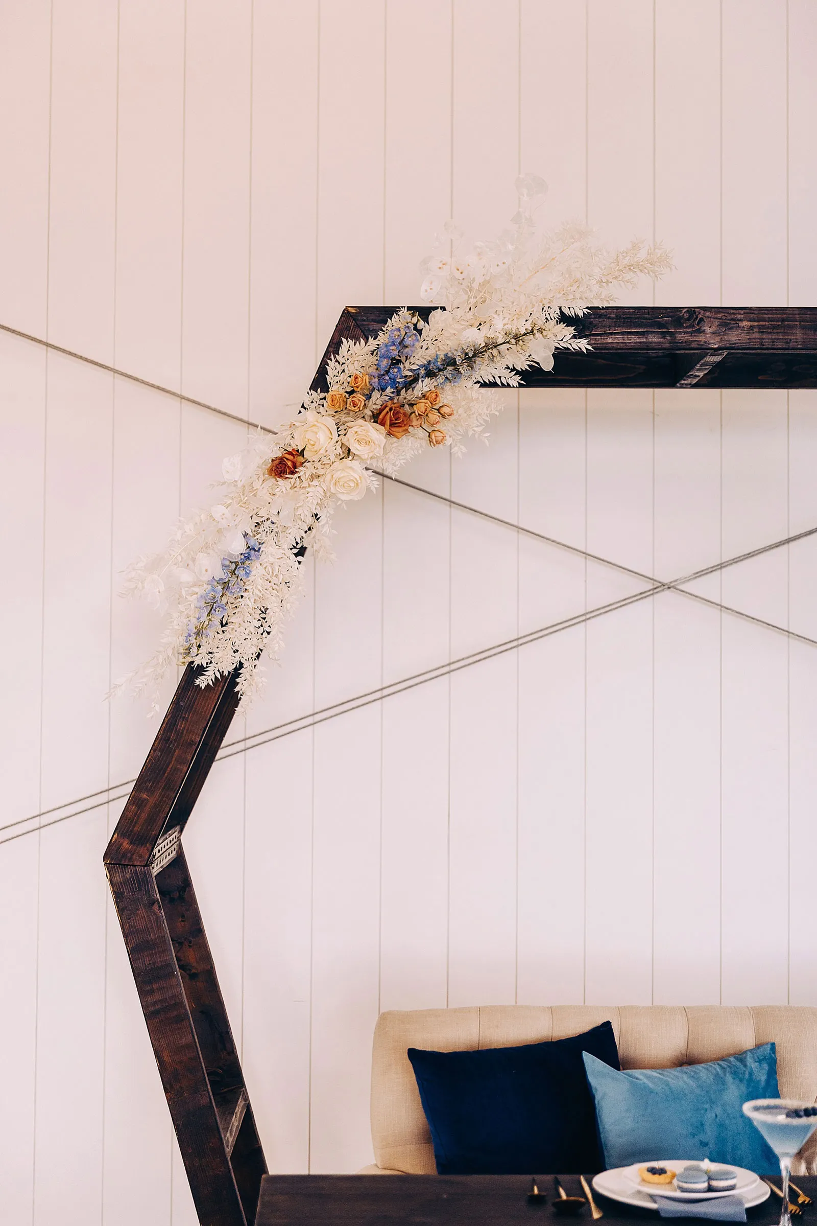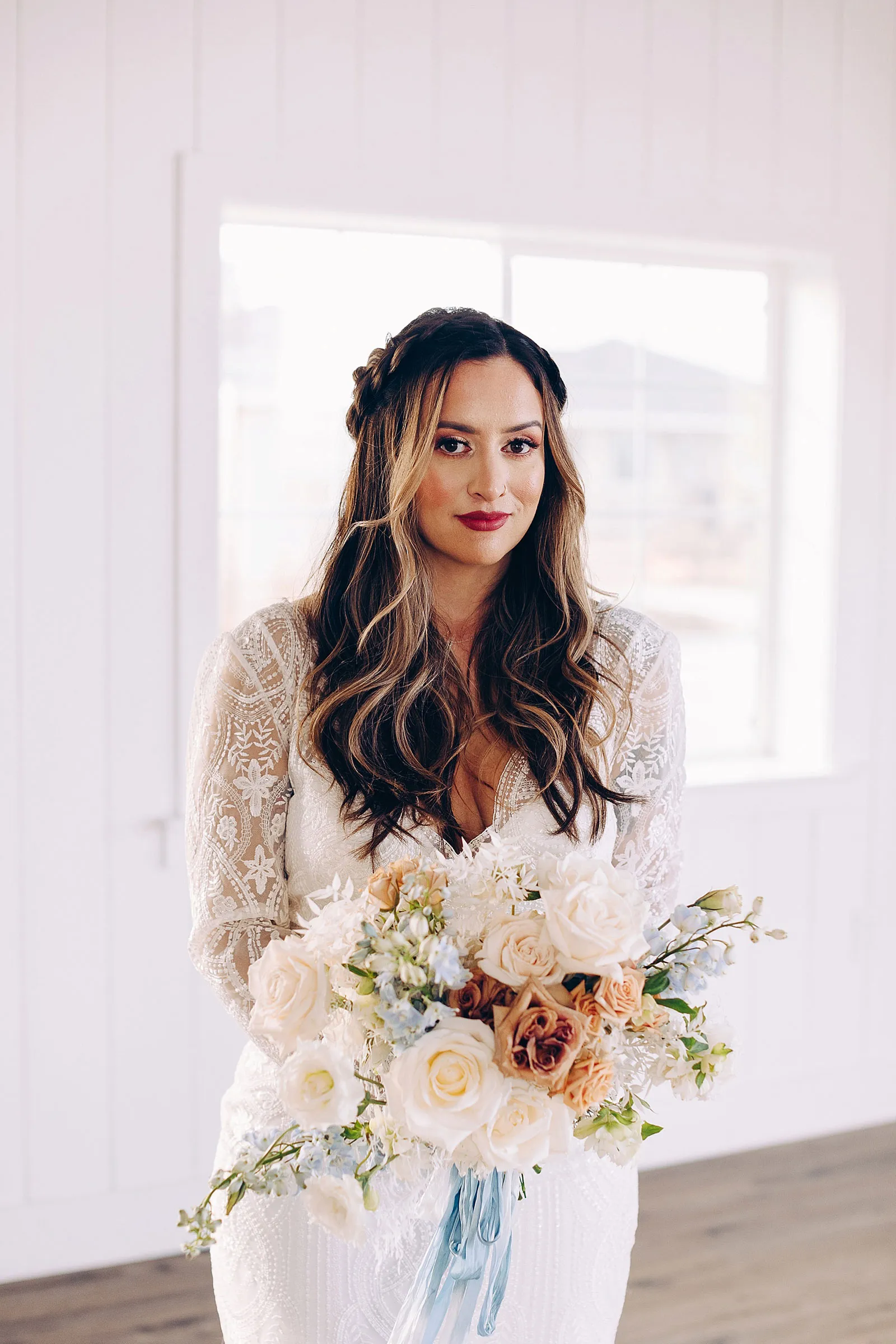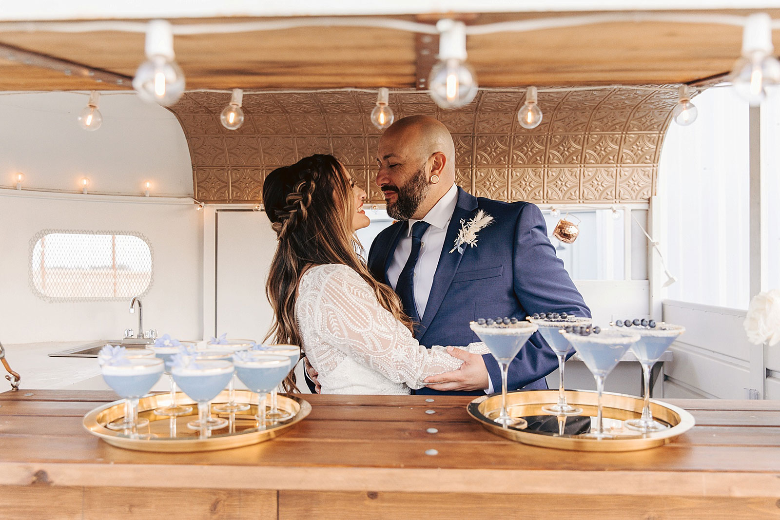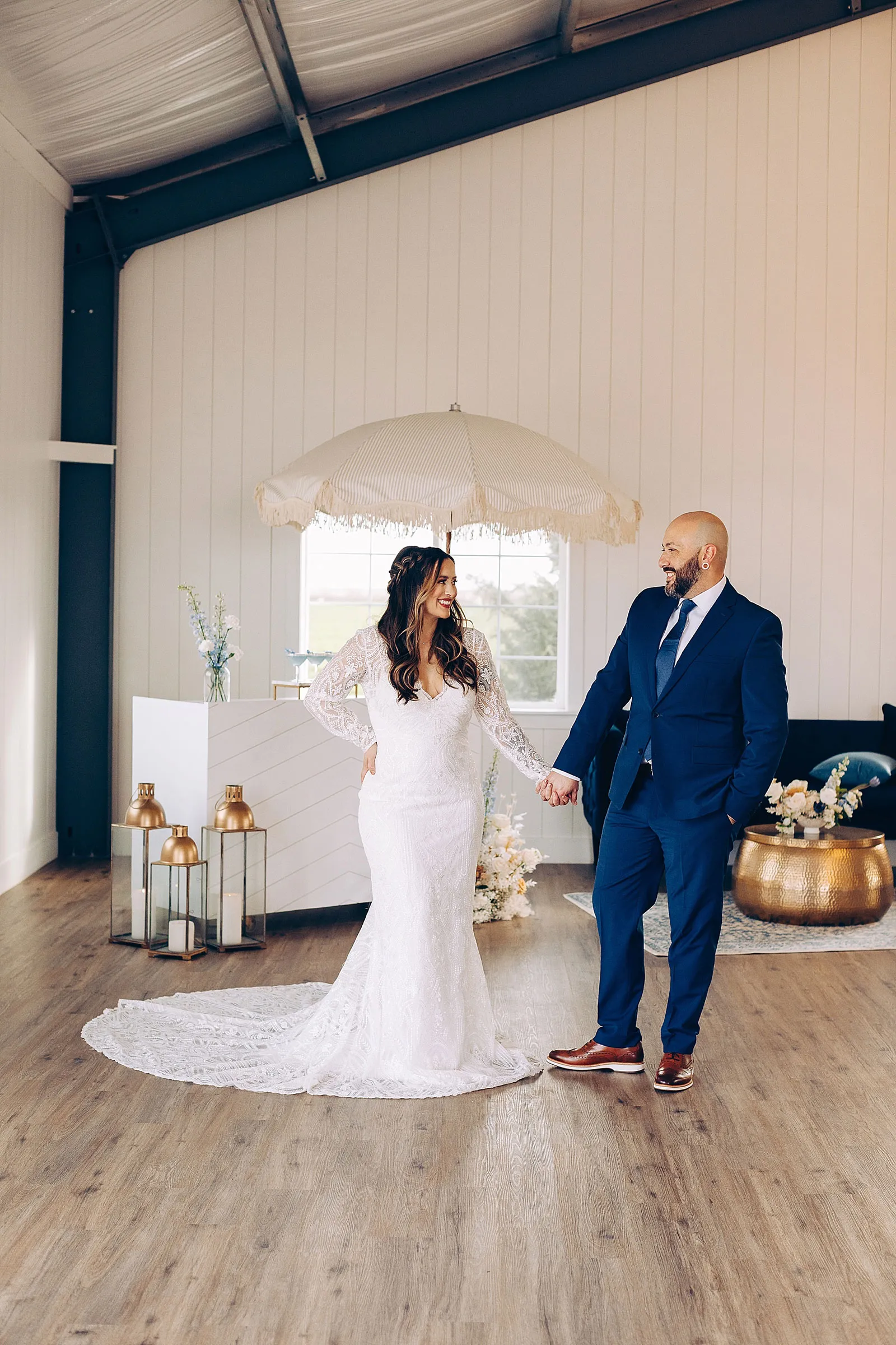 “Anthony proposed to Christine 10 years ago but he couldn’t afford a ring at the time so he used his grandmother’s ring. They eloped at a park with only a few close friends and family. They loved their elopement but always wondered how it would feel with the full glam of a big wedding day. The couple teared up at the shoot seeing each other in their dress and suit all done up. We played their first dance song at the shoot and Christine began to cry! It was SO sweet and such a special shoot to be a part of.”