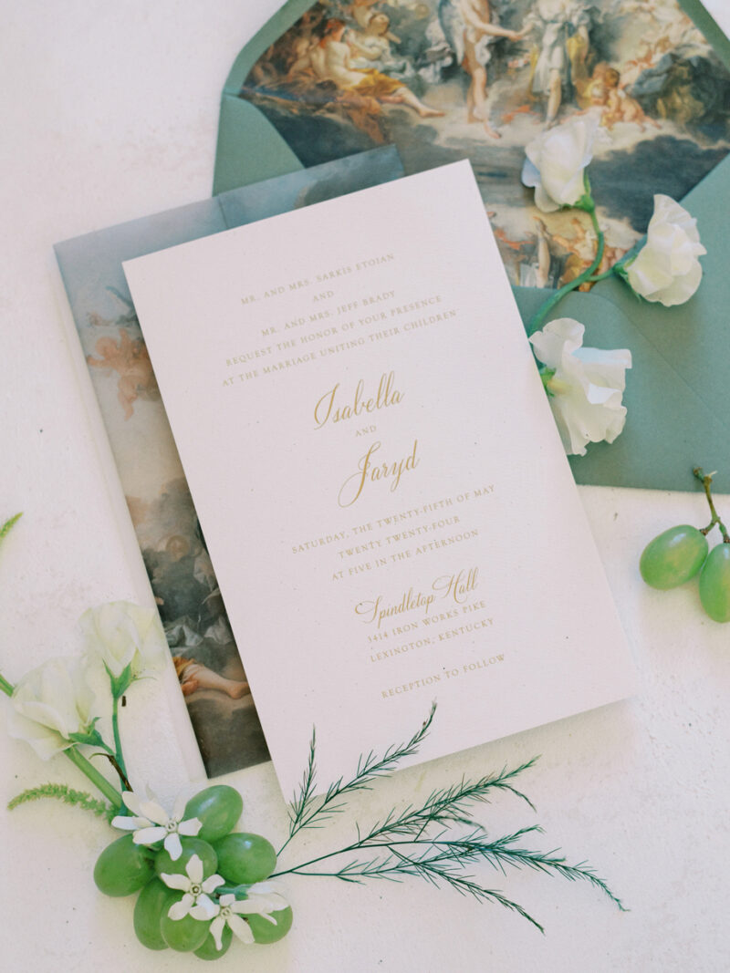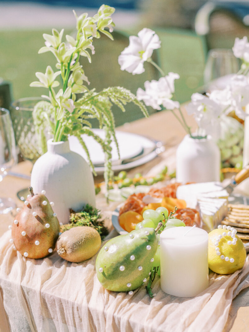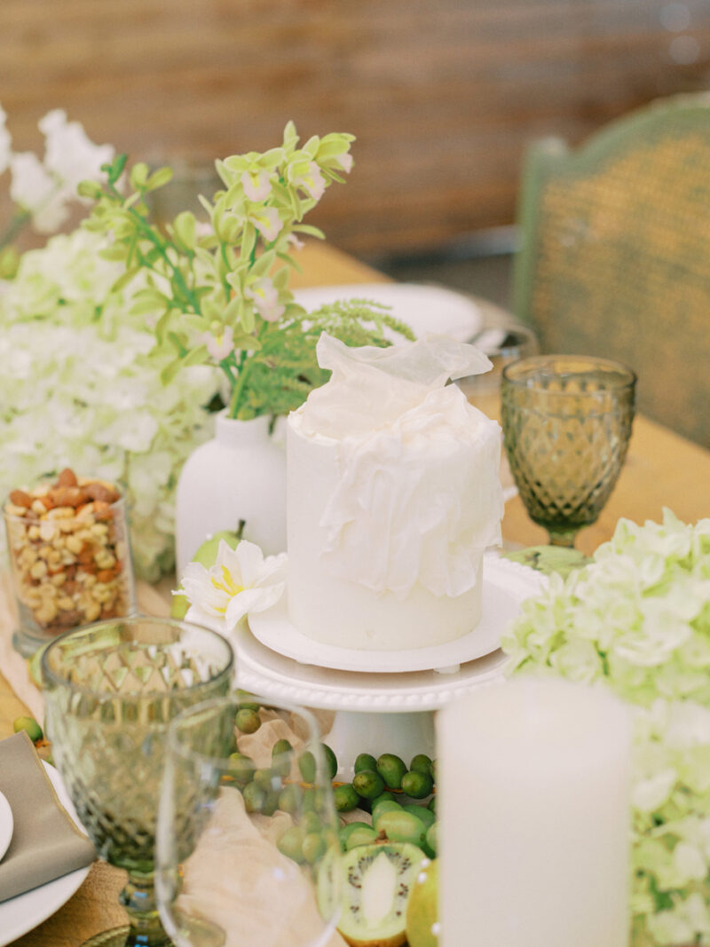 The bride was adorned in a sophisticated updo, complemented by bridesmaids in mismatched green dresses—one in a lively lime hue that echoed the ribbon on the bride’s bouquet. Adding a touch of whimsy, Japanese parasols were incorporated, enhancing the ensemble’s charm and cohesiveness. The tablescape was a curated blend of Roman busts, delectable charcuterie, individual table cakes, and delicate light bites, creating an ambiance of refined indulgence.