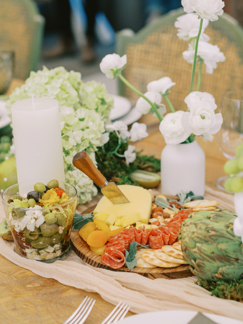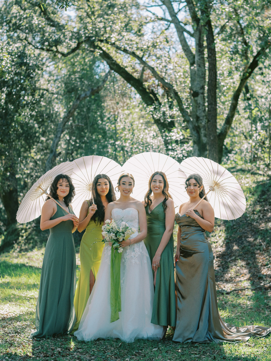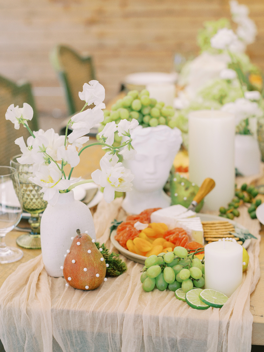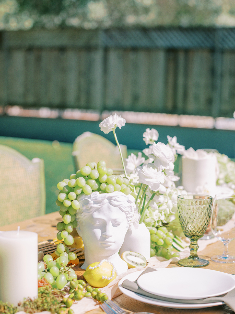 The bride was adorned in a sophisticated updo, complemented by bridesmaids in mismatched green dresses—one in a lively lime hue that echoed the ribbon on the bride’s bouquet. Adding a touch of whimsy, Japanese parasols were incorporated, enhancing the ensemble’s charm and cohesiveness. The tablescape was a curated blend of Roman busts, delectable charcuterie, individual table cakes, and delicate light bites, creating an ambiance of refined indulgence.