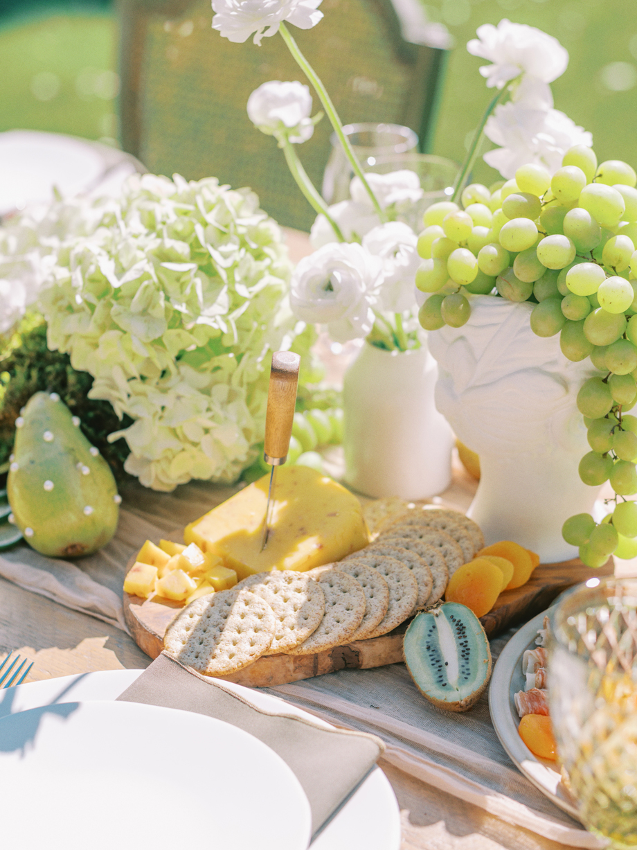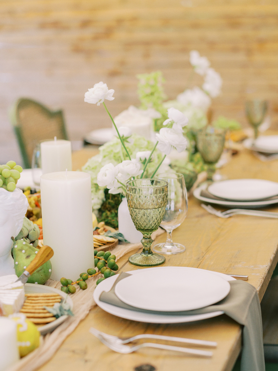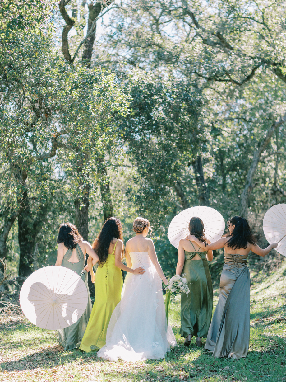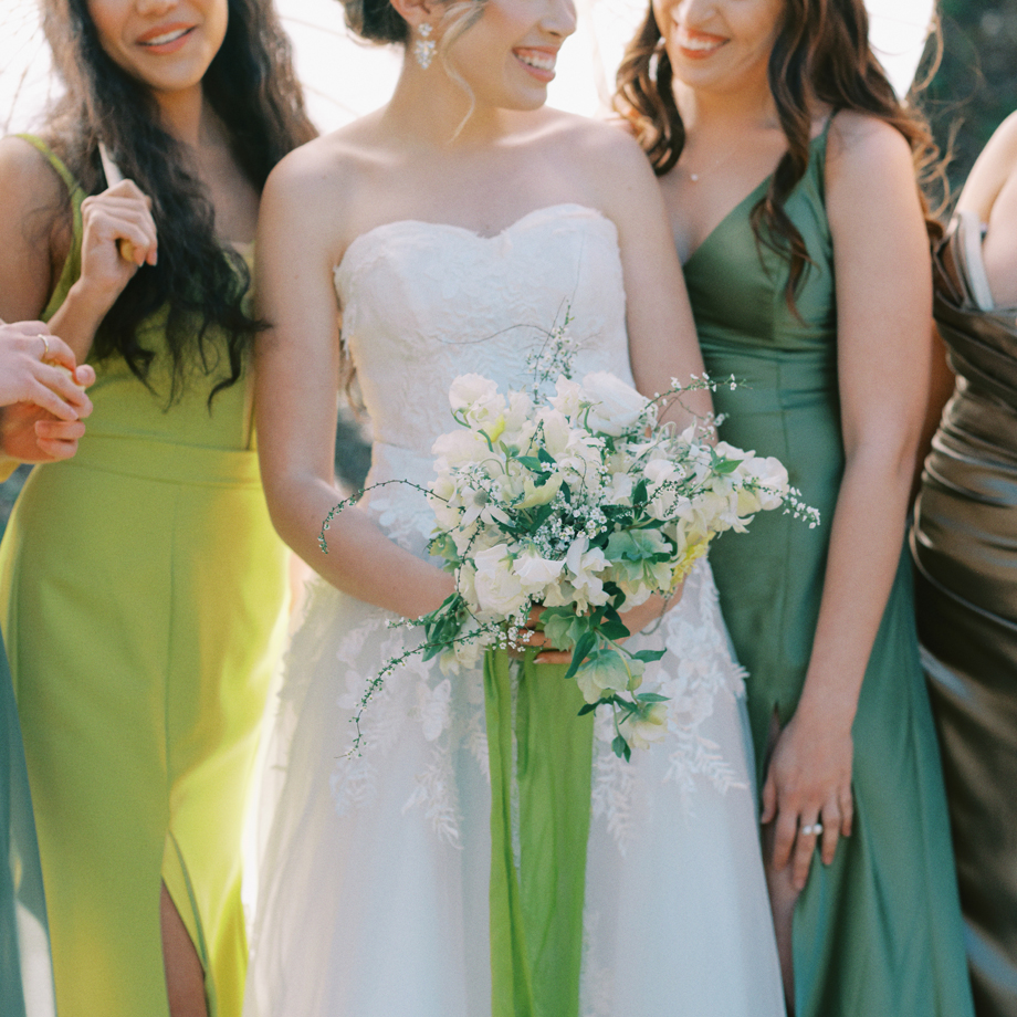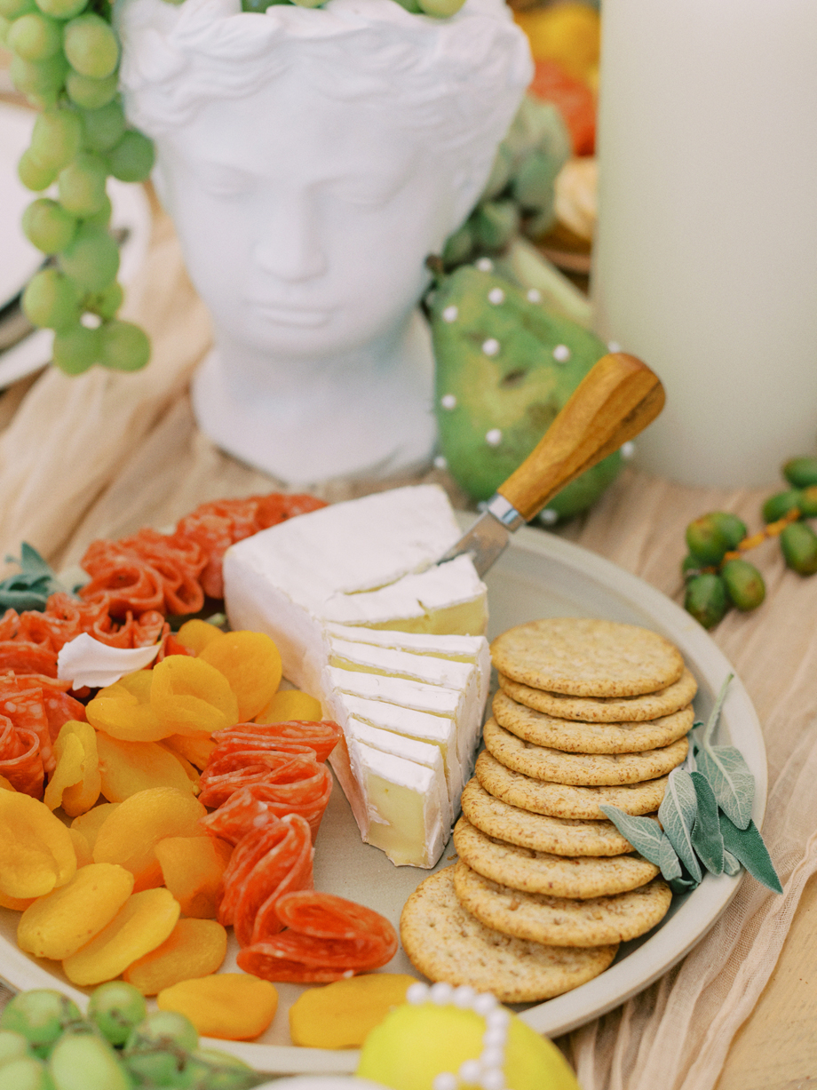 The bride was adorned in a sophisticated updo, complemented by bridesmaids in mismatched green dresses—one in a lively lime hue that echoed the ribbon on the bride’s bouquet. Adding a touch of whimsy, Japanese parasols were incorporated, enhancing the ensemble’s charm and cohesiveness. The tablescape was a curated blend of Roman busts, delectable charcuterie, individual table cakes, and delicate light bites, creating an ambiance of refined indulgence.