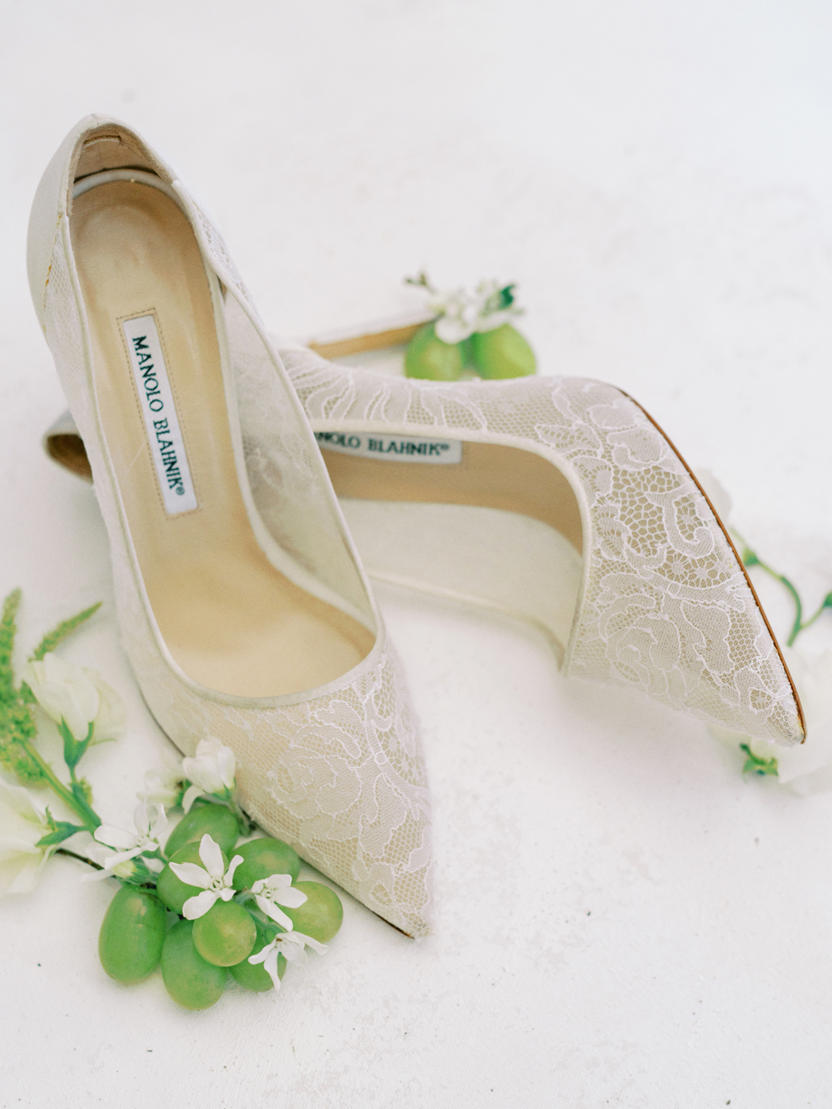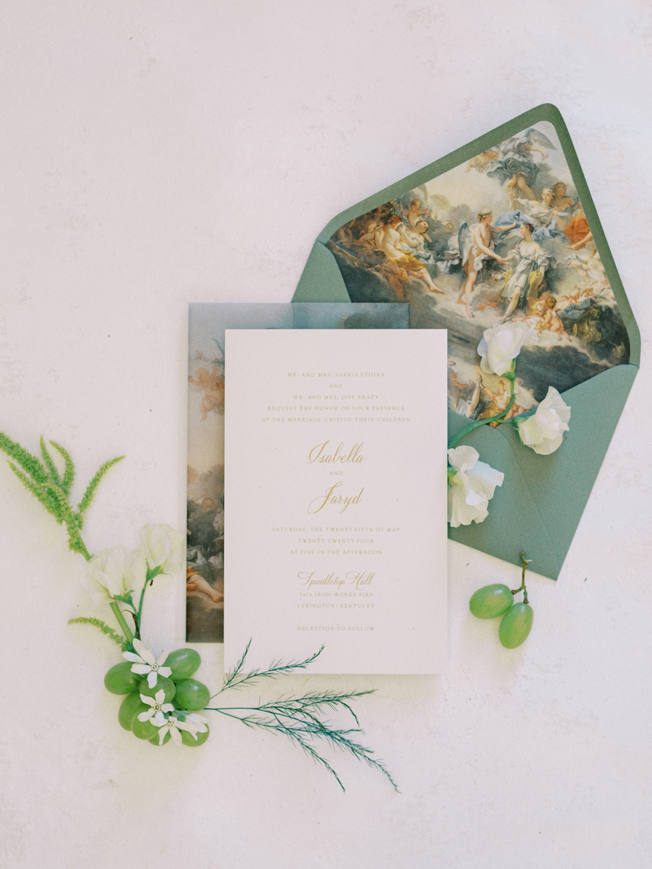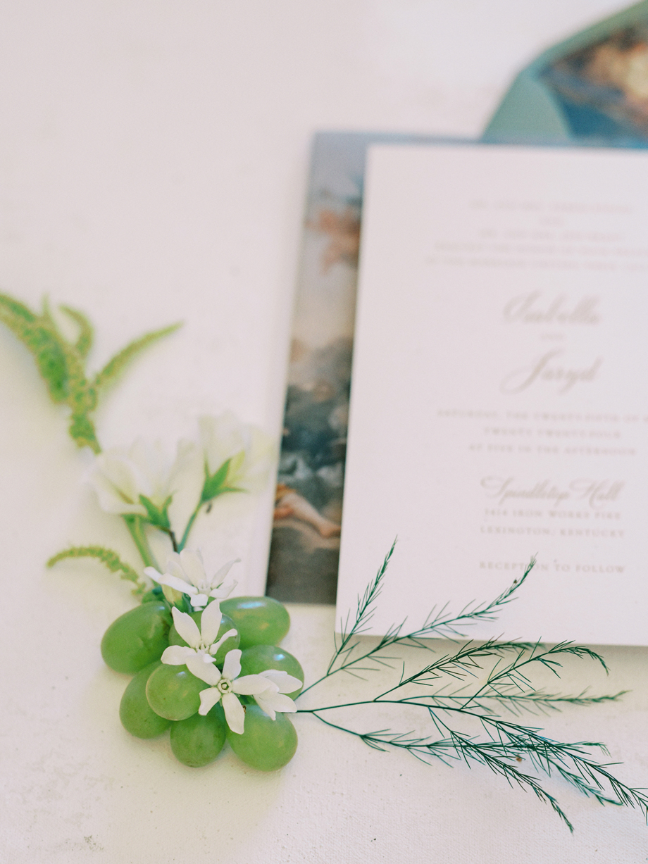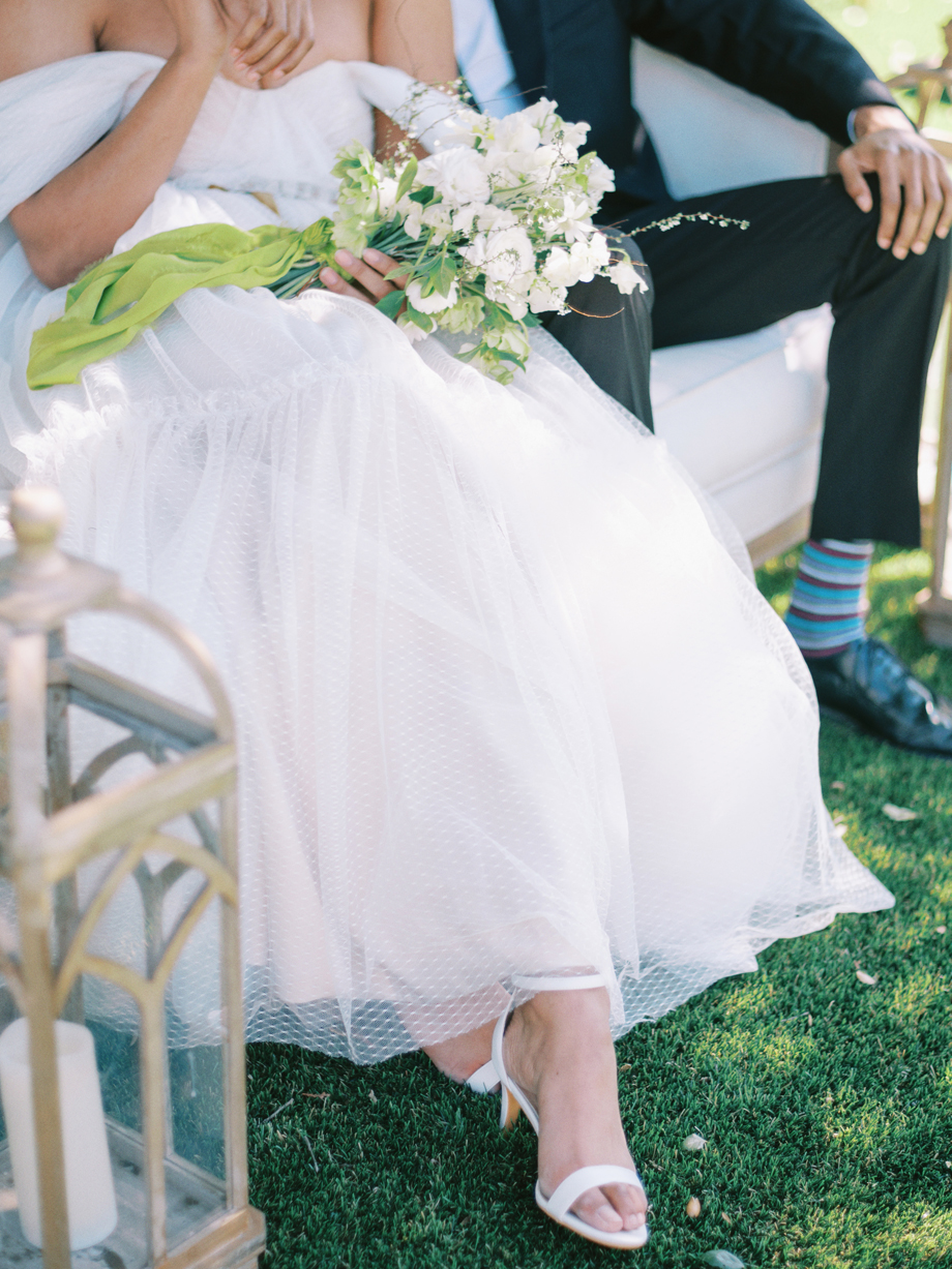The bride was adorned in a sophisticated updo, complemented by bridesmaids in mismatched green dresses—one in a lively lime hue that echoed the ribbon on the bride’s bouquet. Adding a touch of whimsy, Japanese parasols were incorporated, enhancing the ensemble’s charm and cohesiveness. The tablescape was a curated blend of Roman busts, delectable charcuterie, individual table cakes, and delicate light bites, creating an ambiance of refined indulgence.